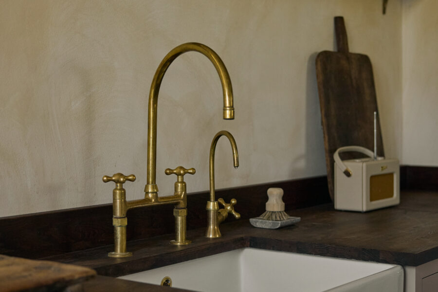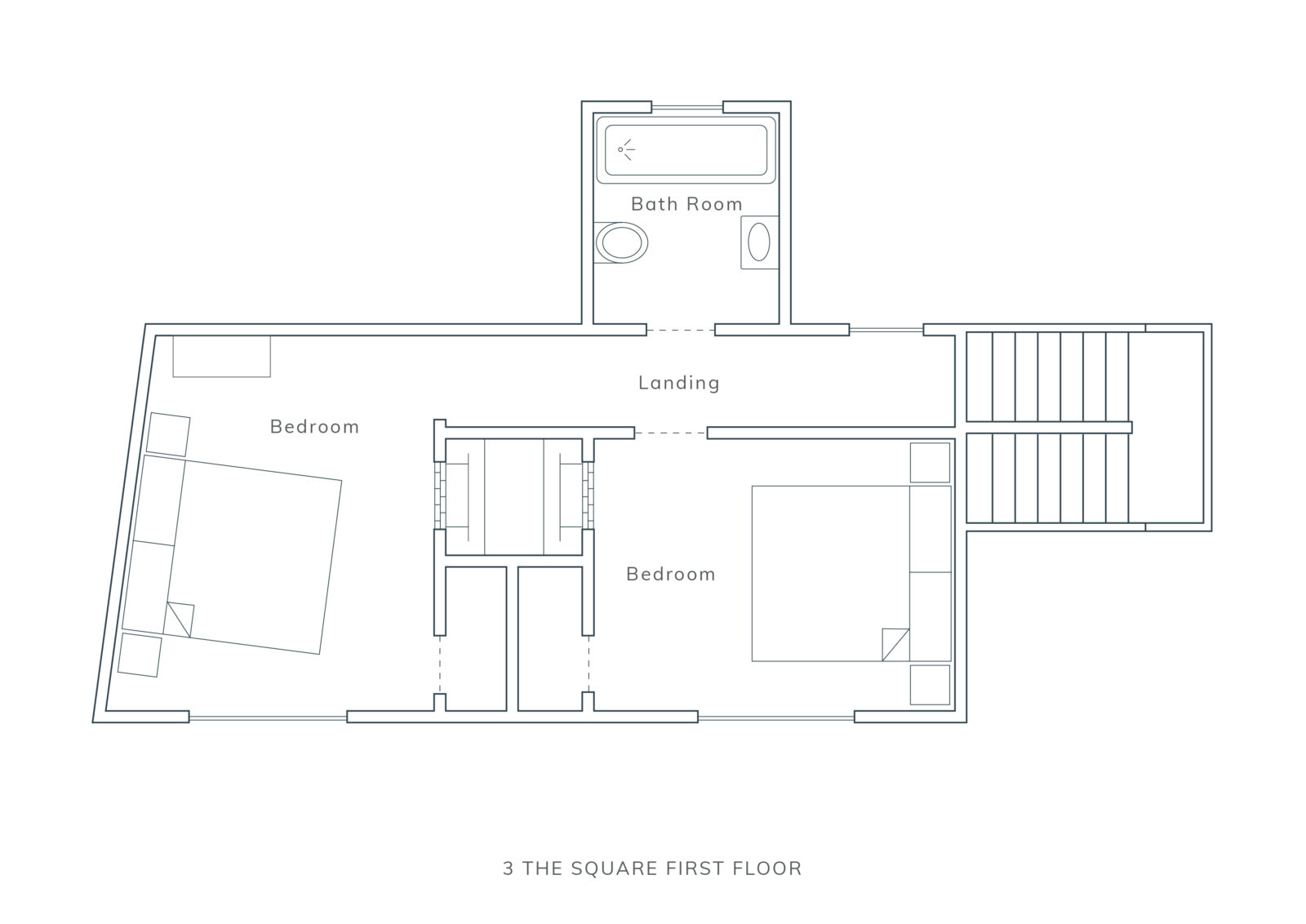 Upstairs, you have two cosy bedrooms and a family bathroom that sit off the quirky geometric landing space with its characterful sloping roof. One of the bedrooms has a king-size bed and the other a Super-king (that can be made into a twin on request). In these, you can expect locally commissioned artwork and original fireplace features, alongside stylish botanical print curtains that mirror the rural and flourishing surrounding beyond. The luxurious sky-blue family bathroom is complete with a generous bath and overhead rainfall shower.