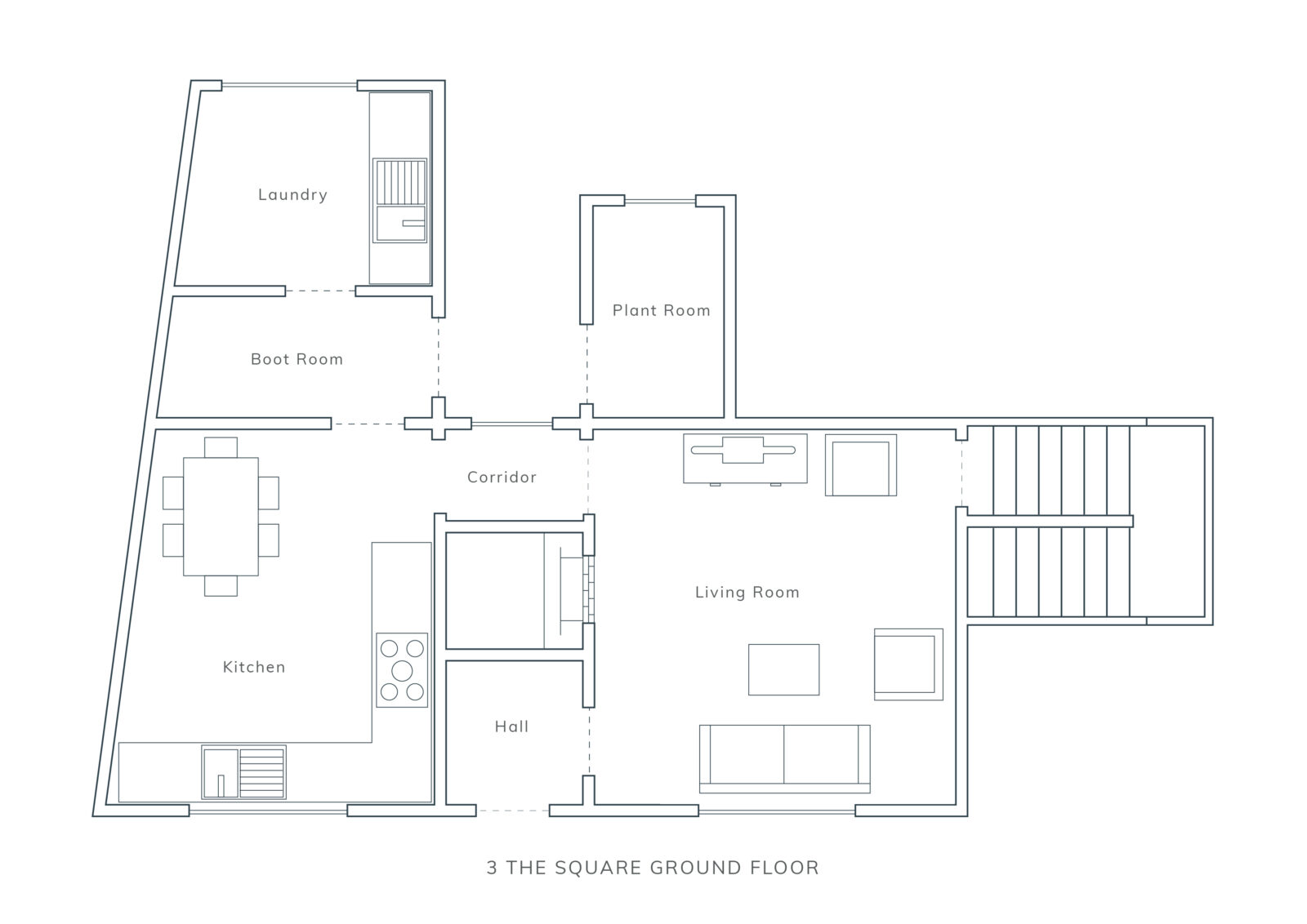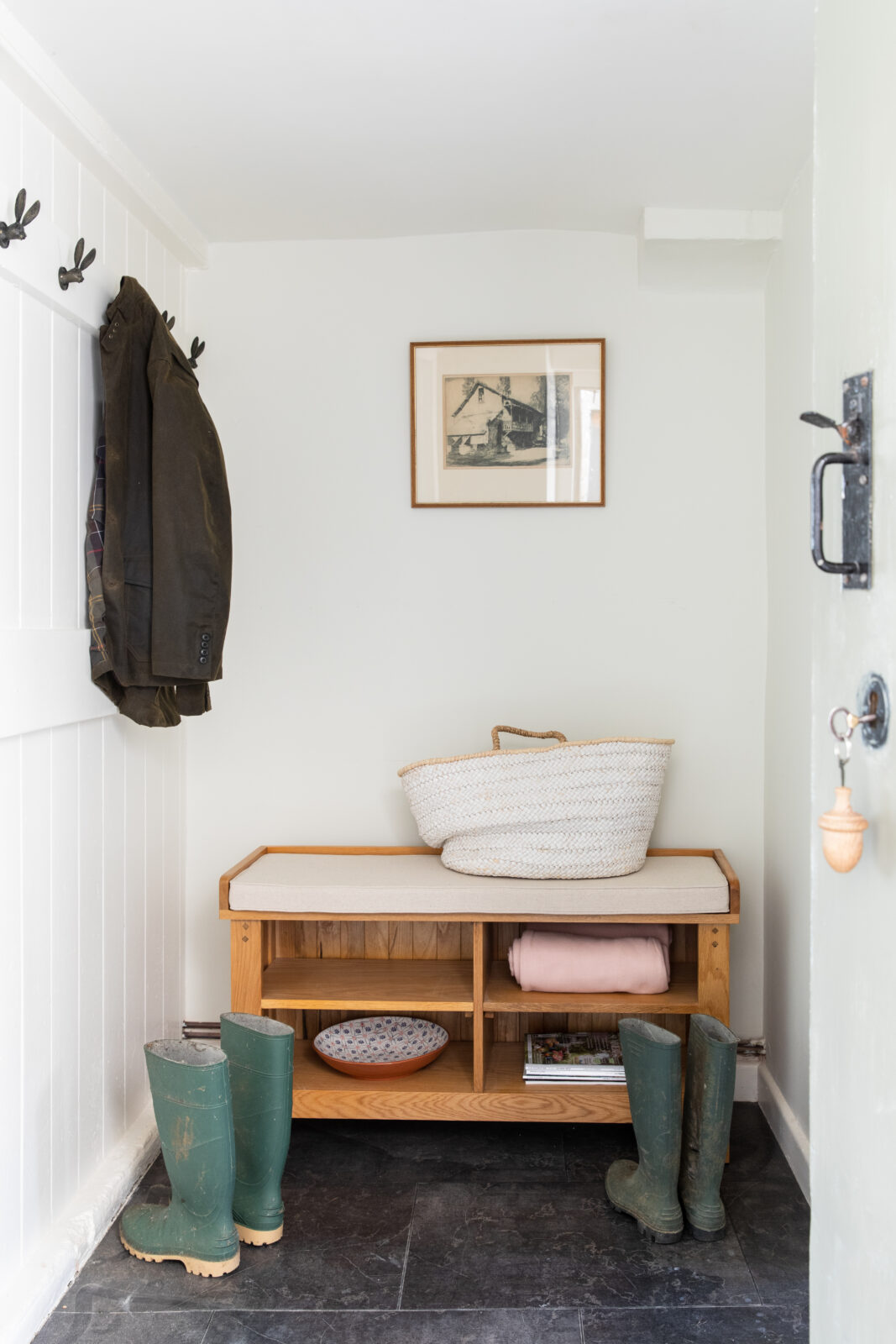 The cottage is accessed via the pedestrian gate at the edge of The Square, where a pathed stone pathway will lead you to the front door and into the entrance hall. To your right, you have the stylish sitting room with its plush emerald velvet sofa and feature log burner, and from here, follow the corridor round to the bright, chic country kitchen and dining area, that welcomes you with an elegant palette of warm neutrals and French greys. There’s a lovely large wooden dining table with farmhouse-style chairs, perfect for evenings in and morning brunching, and charming original window features. Off the kitchen, you’ll then find the boot room and laundry room.