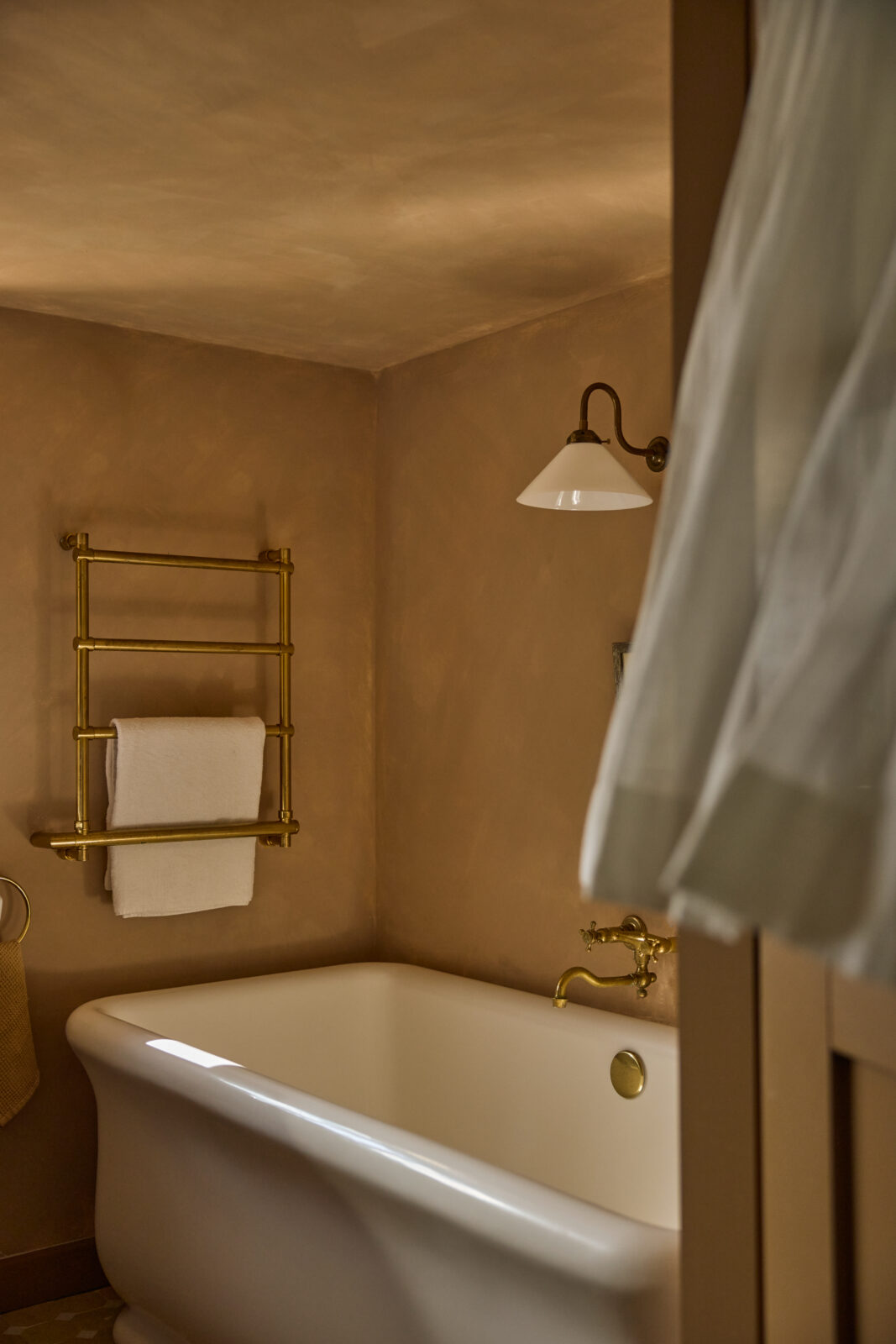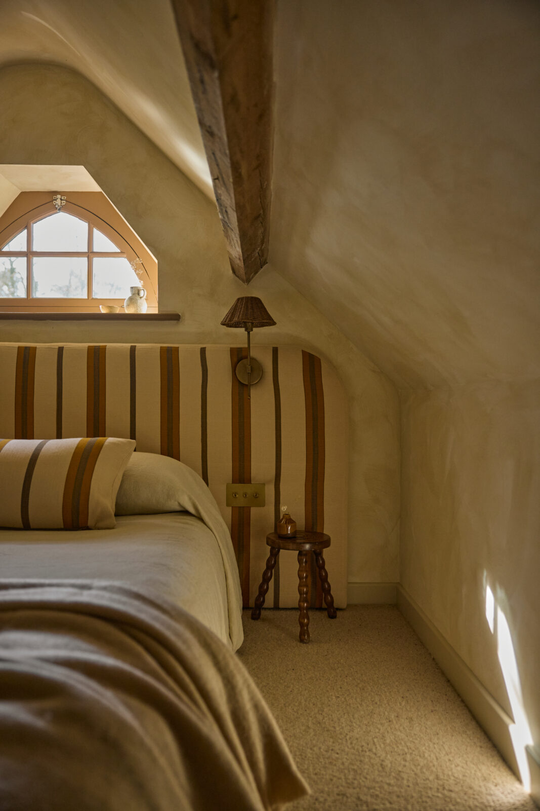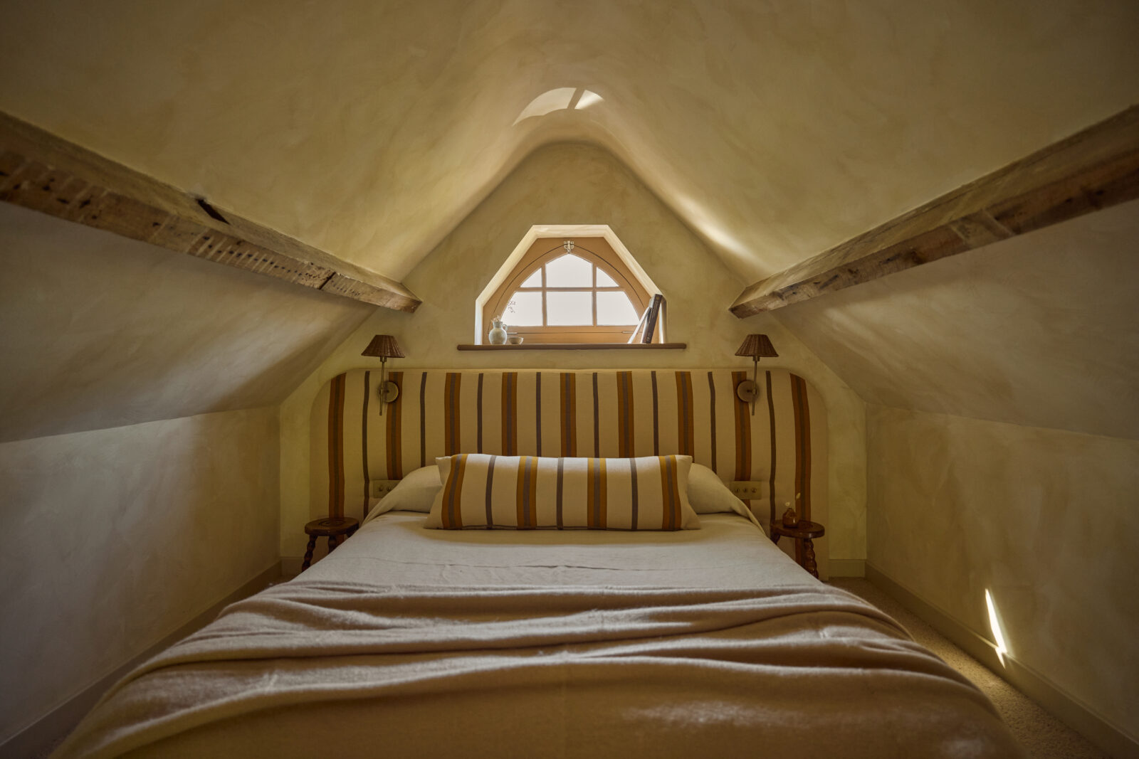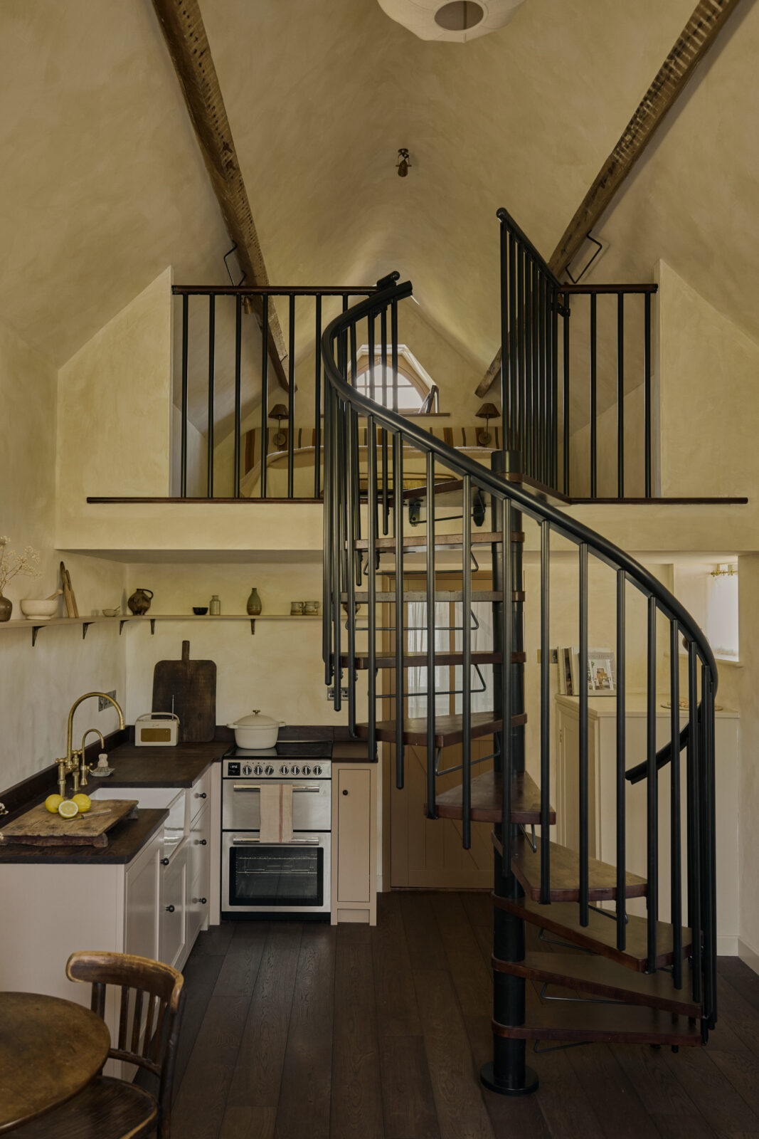 The bedroom sits on the upper mezzanine level and is the epitome of comfortable cosiness. Beautiful bedding and original beams create a calm haven-like space. The bathroom is arguably the showstopper feature of the whole property, with an emperor soaking tub and a sleek wet room – a space with spa-like zen.