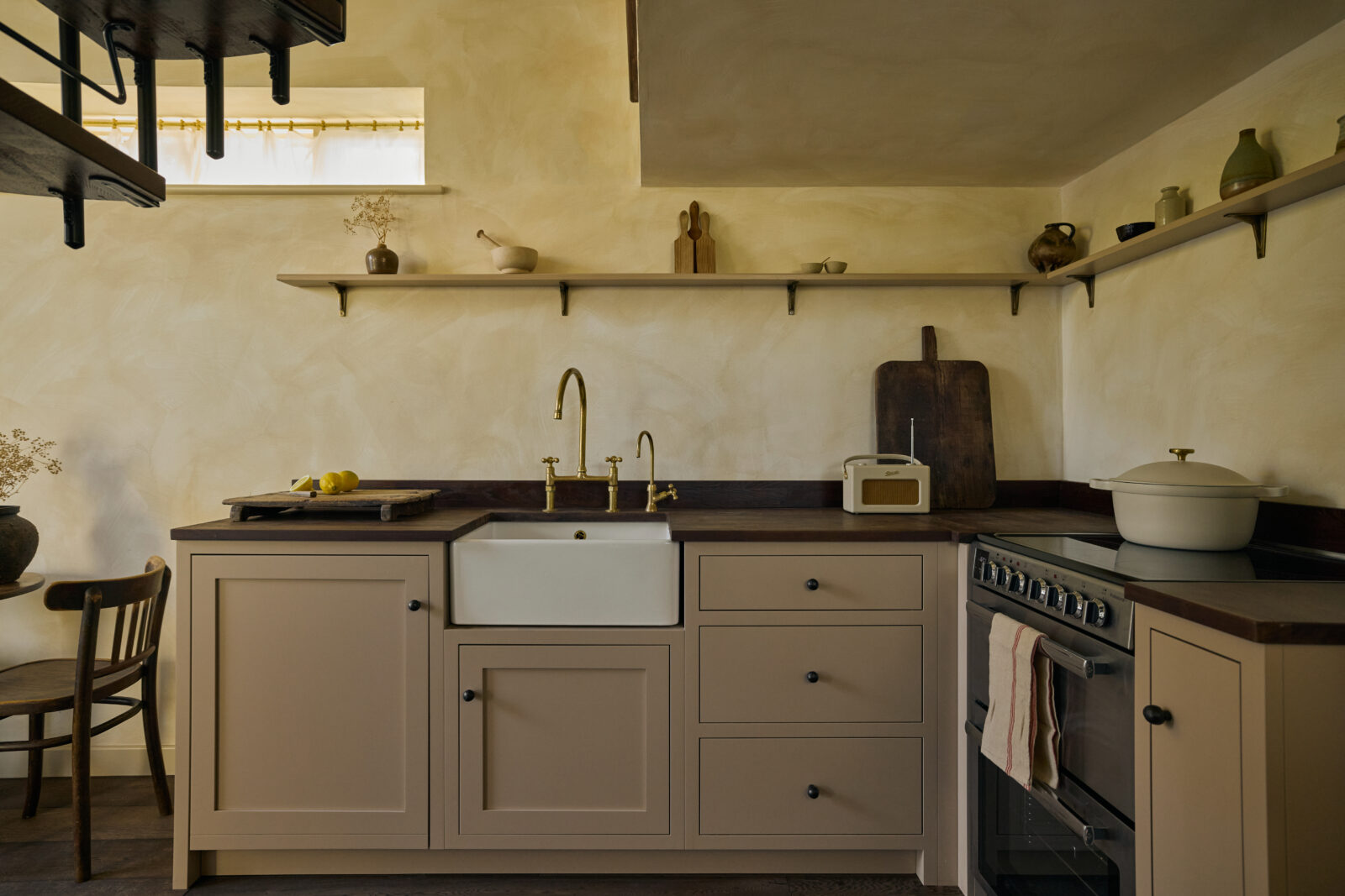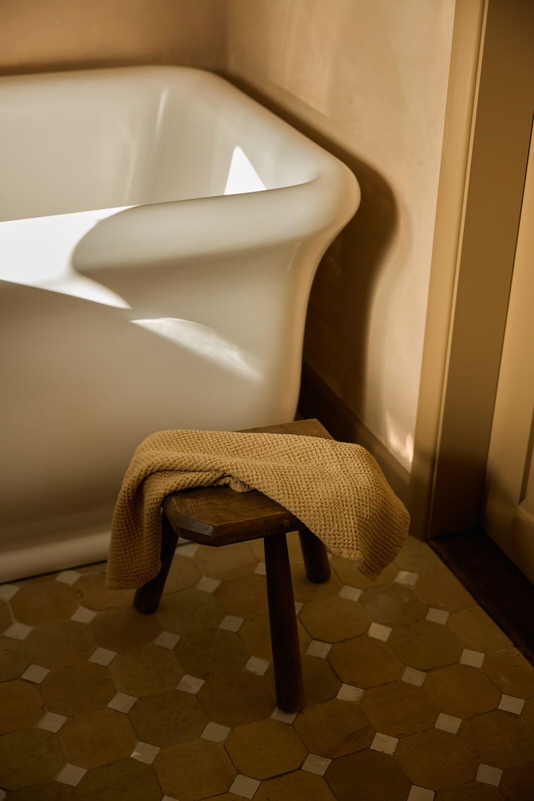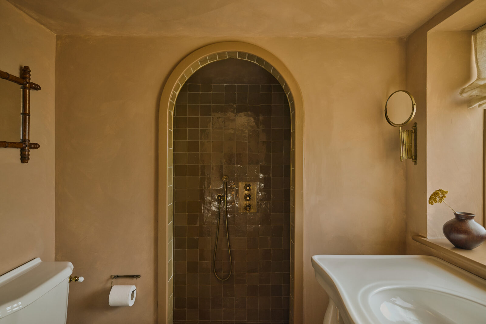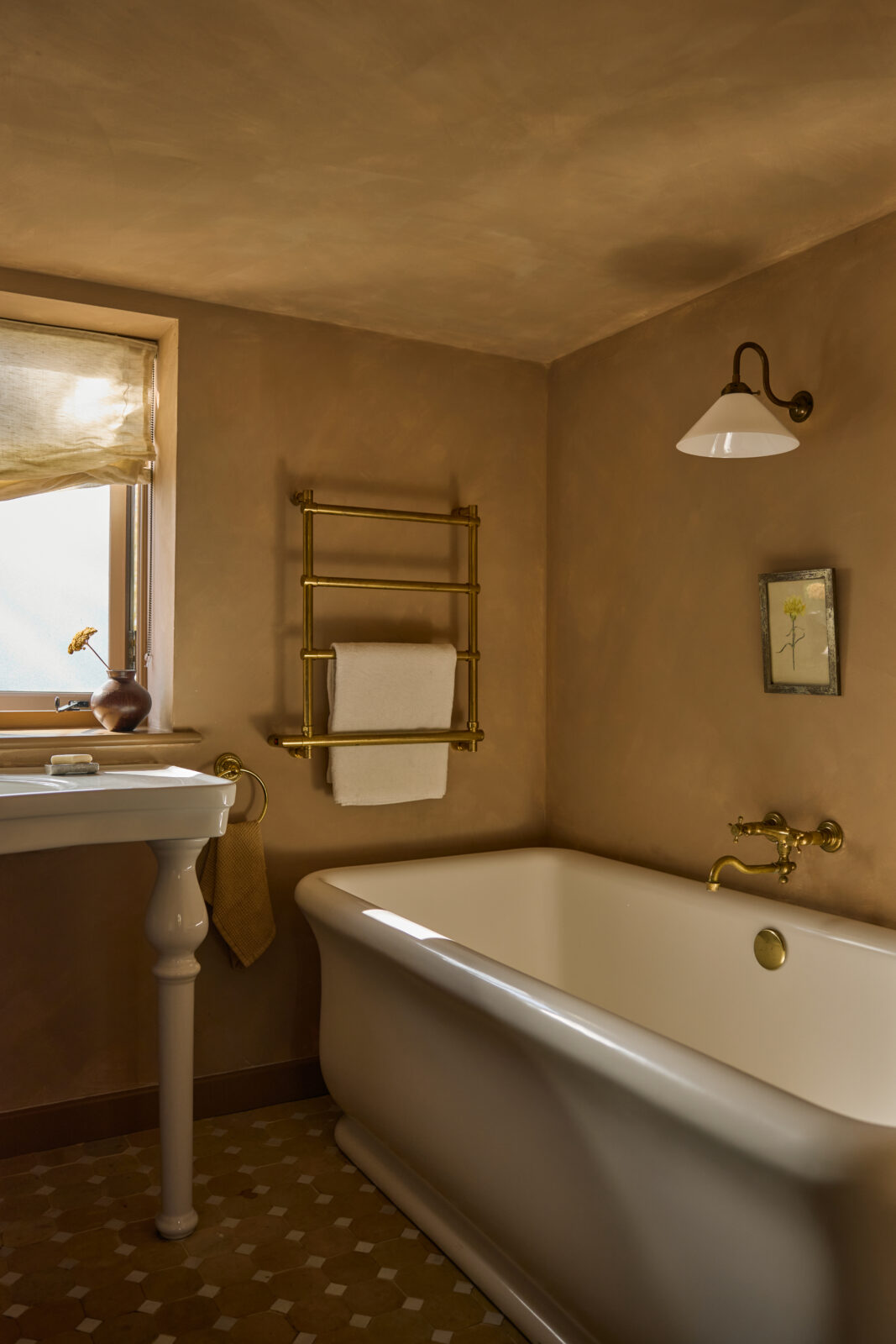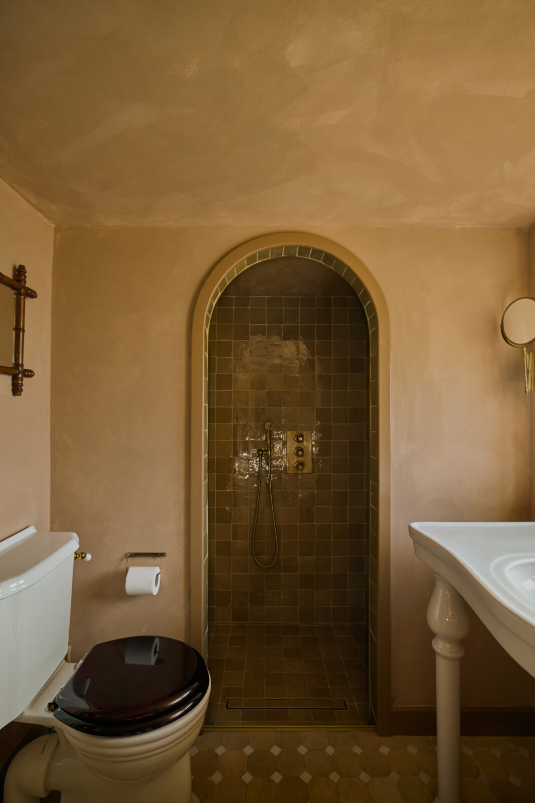 The bedroom sits on the upper mezzanine level and is the epitome of comfortable cosiness. Beautiful bedding and original beams create a calm haven-like space. The bathroom is arguably the showstopper feature of the whole property, with an emperor soaking tub and a sleek wet room – a space with spa-like zen.