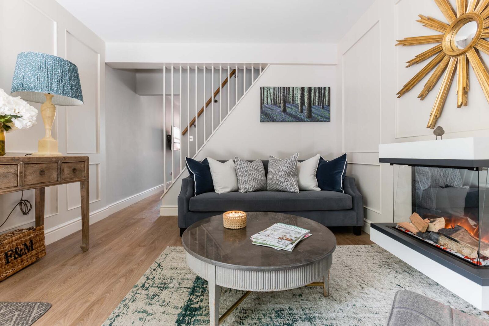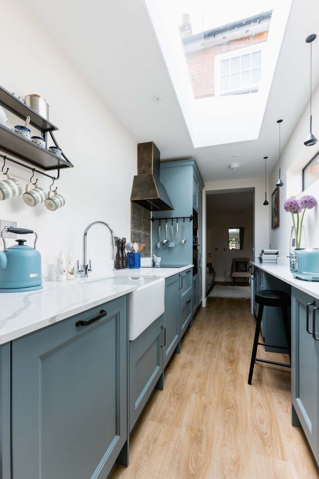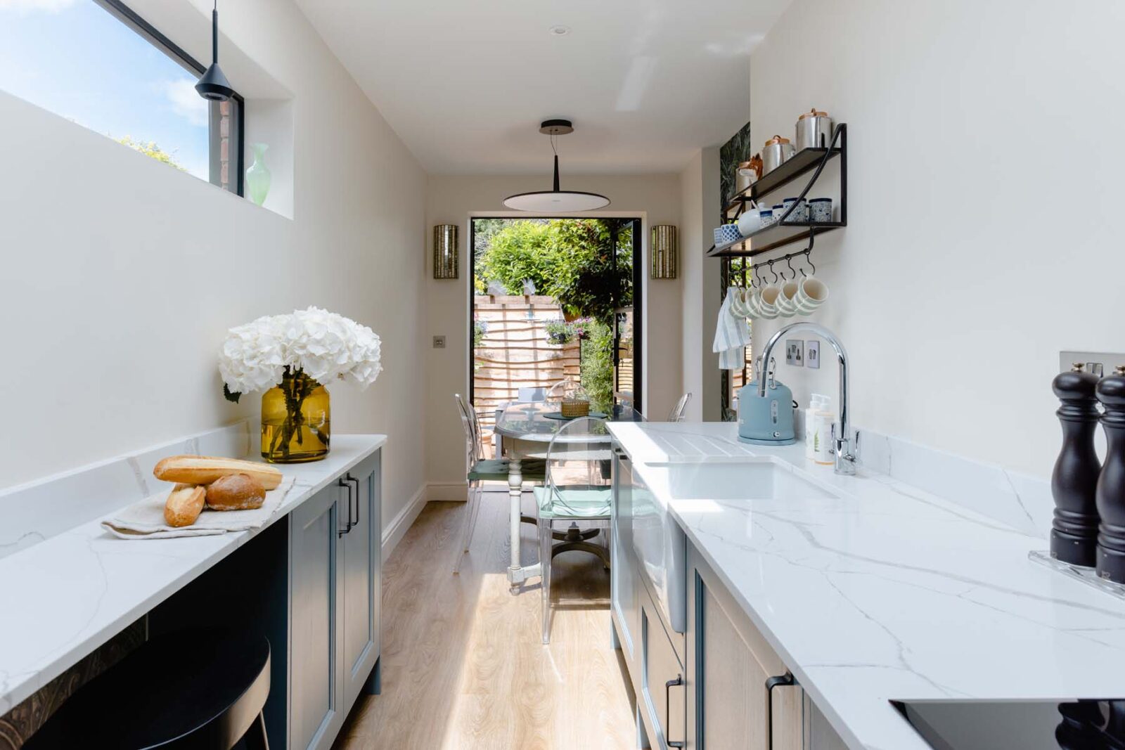 The living room centres around an electric fireplace and then extends past the staircase into a separate TV space with a sofa bed fit for a king. This open plan space continues into the galley-style kitchen and dining area. Think marble kitchen counters, skylights and all the high-spec kitchen appliances you could possibly need. The dining table seats 4 and sits in front of the Crittall-style glass French doors, overlooking the decked out patio garden oasis. You’ll also find a stylish downstairs loo tucked away under the stairs.