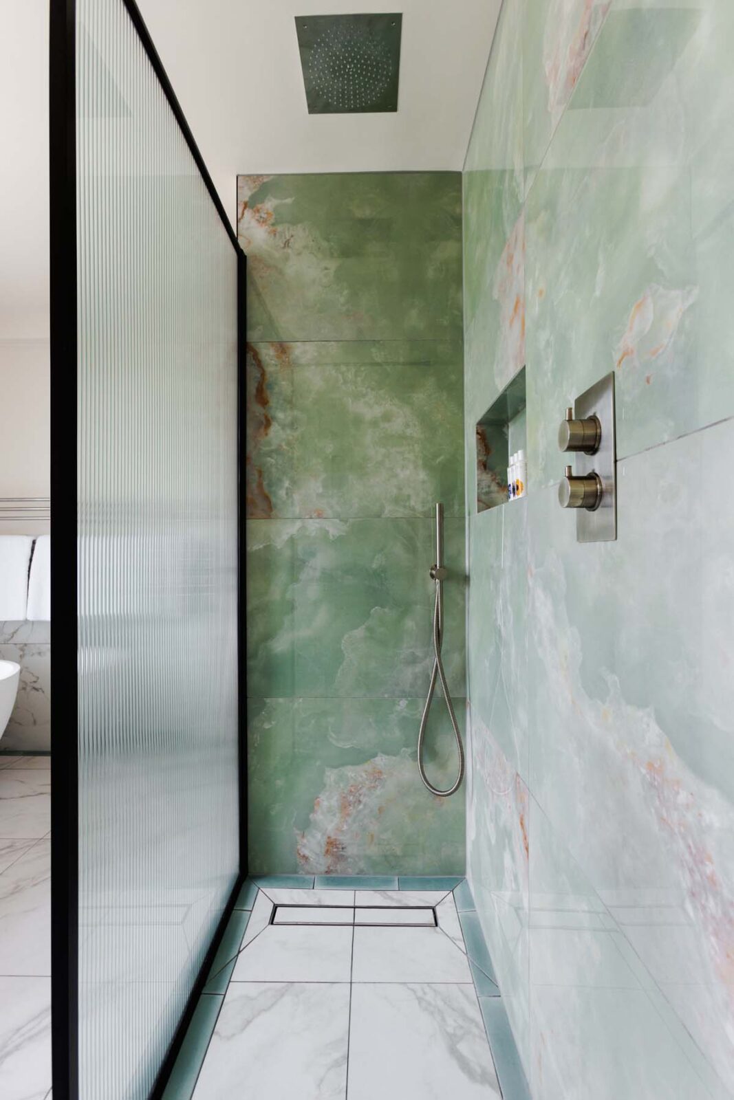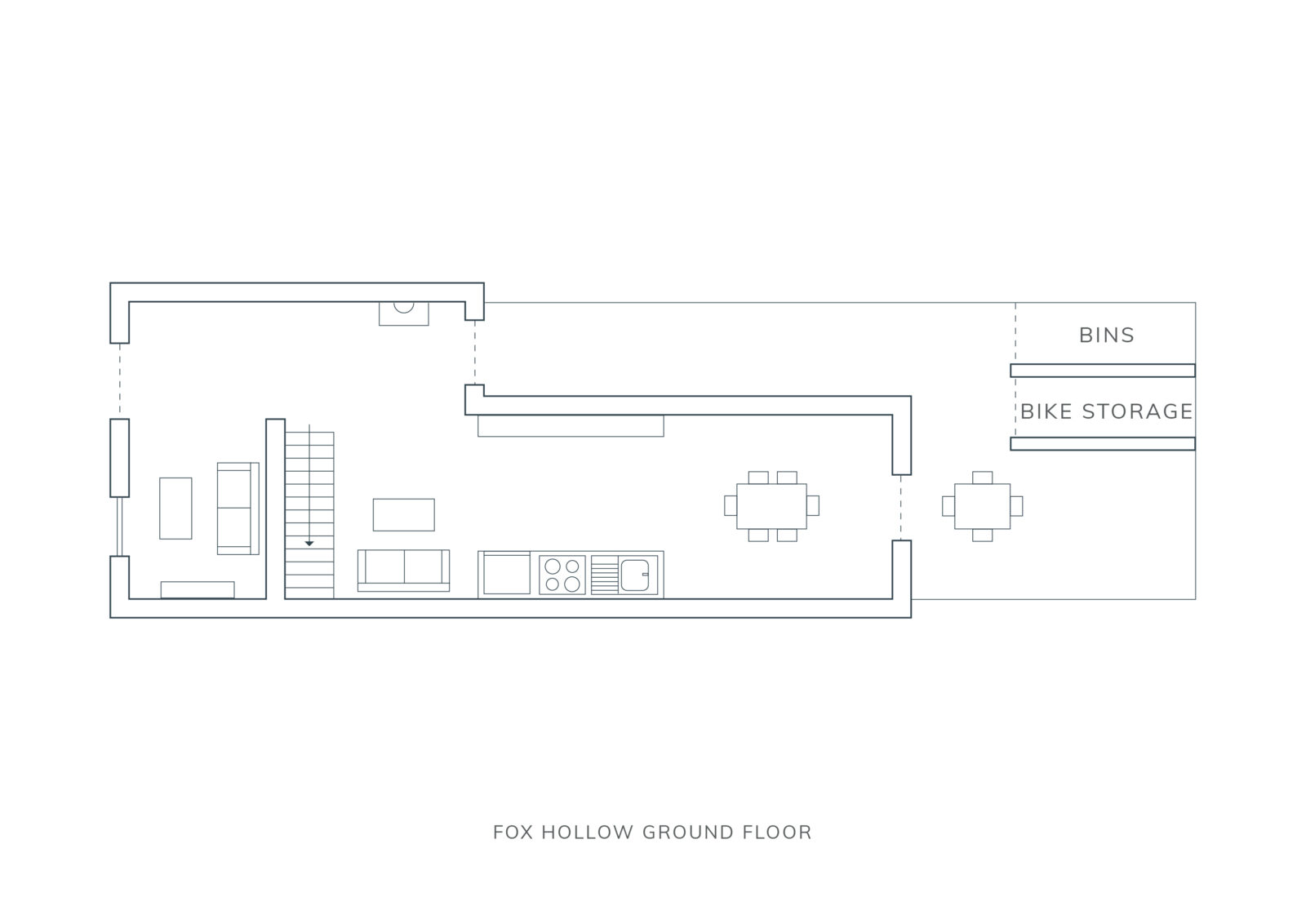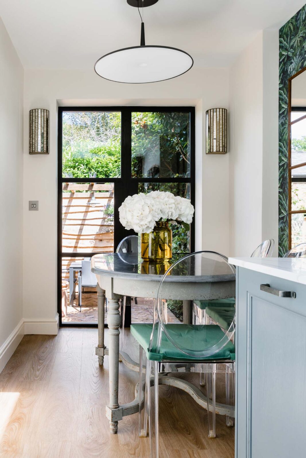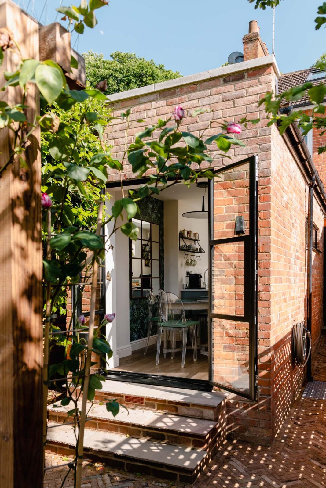 The living room centres around an electric fireplace and then extends past the staircase into a separate TV space with a sofa bed fit for a king. This open plan space continues into the galley-style kitchen and dining area. Think marble kitchen counters, skylights and all the high-spec kitchen appliances you could possibly need. The dining table seats 4 and sits in front of the Crittall-style glass French doors, overlooking the decked out patio garden oasis. You’ll also find a stylish downstairs loo tucked away under the stairs.