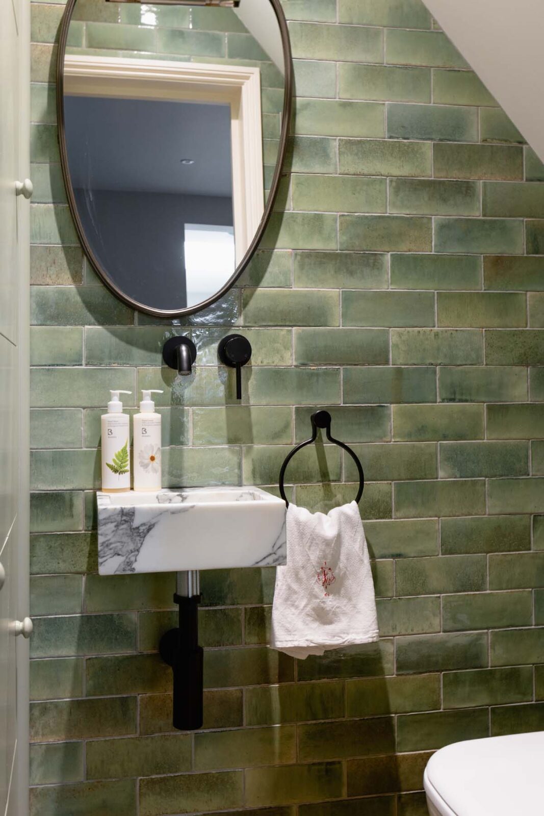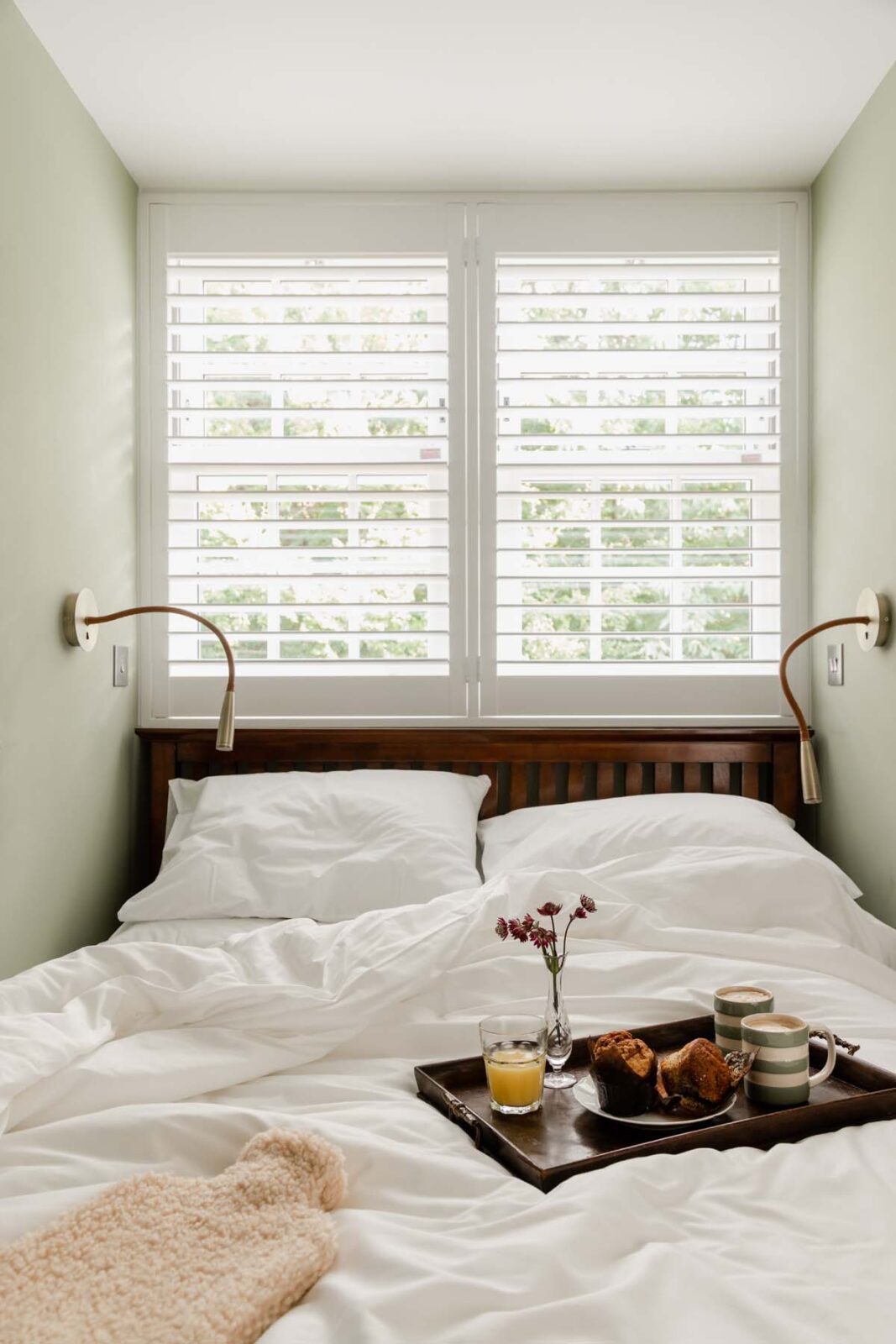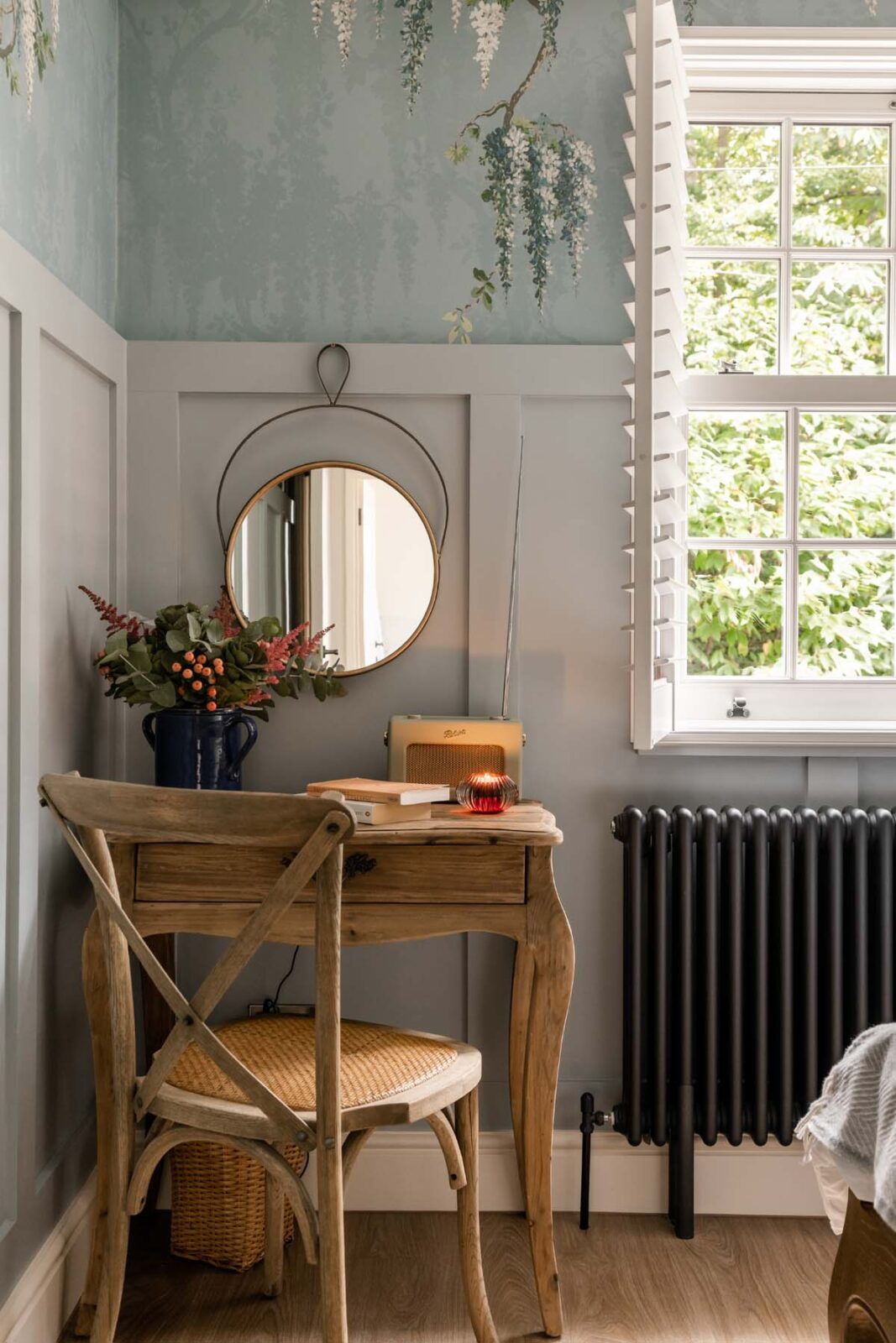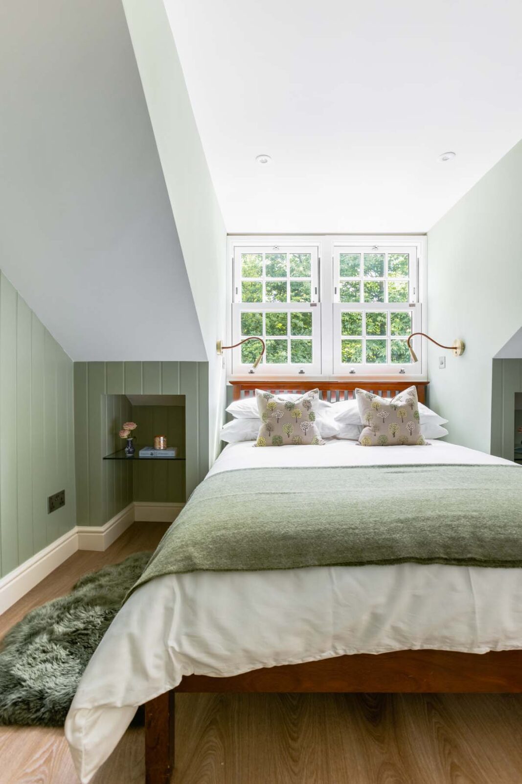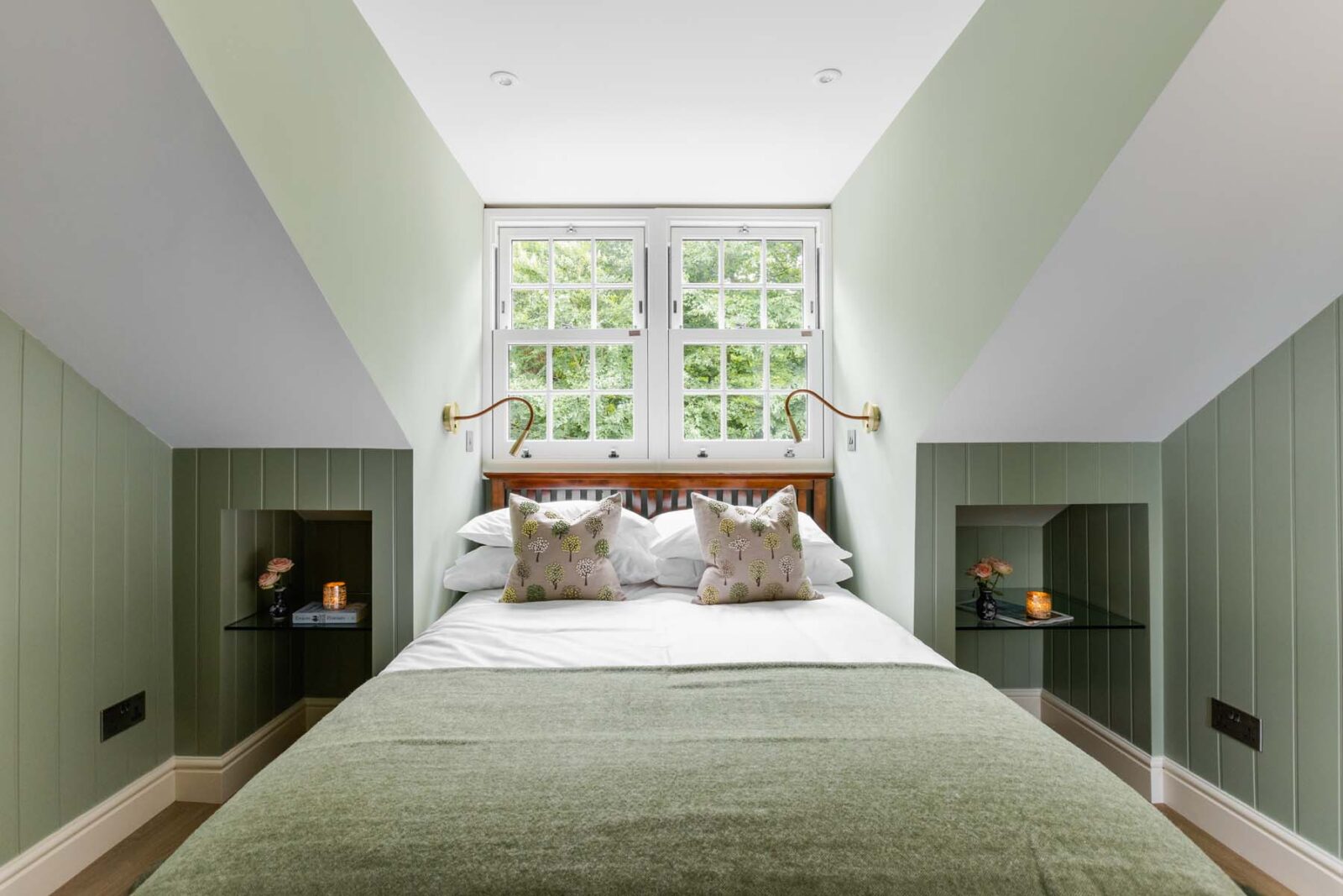 Follow the stairway around and up the second flight of stairs, where en route you’ll find a hidden reading nook (with a roll out single bed should you require it). It is here, within the eaves of the cottage, that you’ll find another expertly designed second bedroom — with sage green coated walls and a bed nestled into the alcove underneath the window, so you can gaze up at the park’s ancient oak treetops whilst you doze.