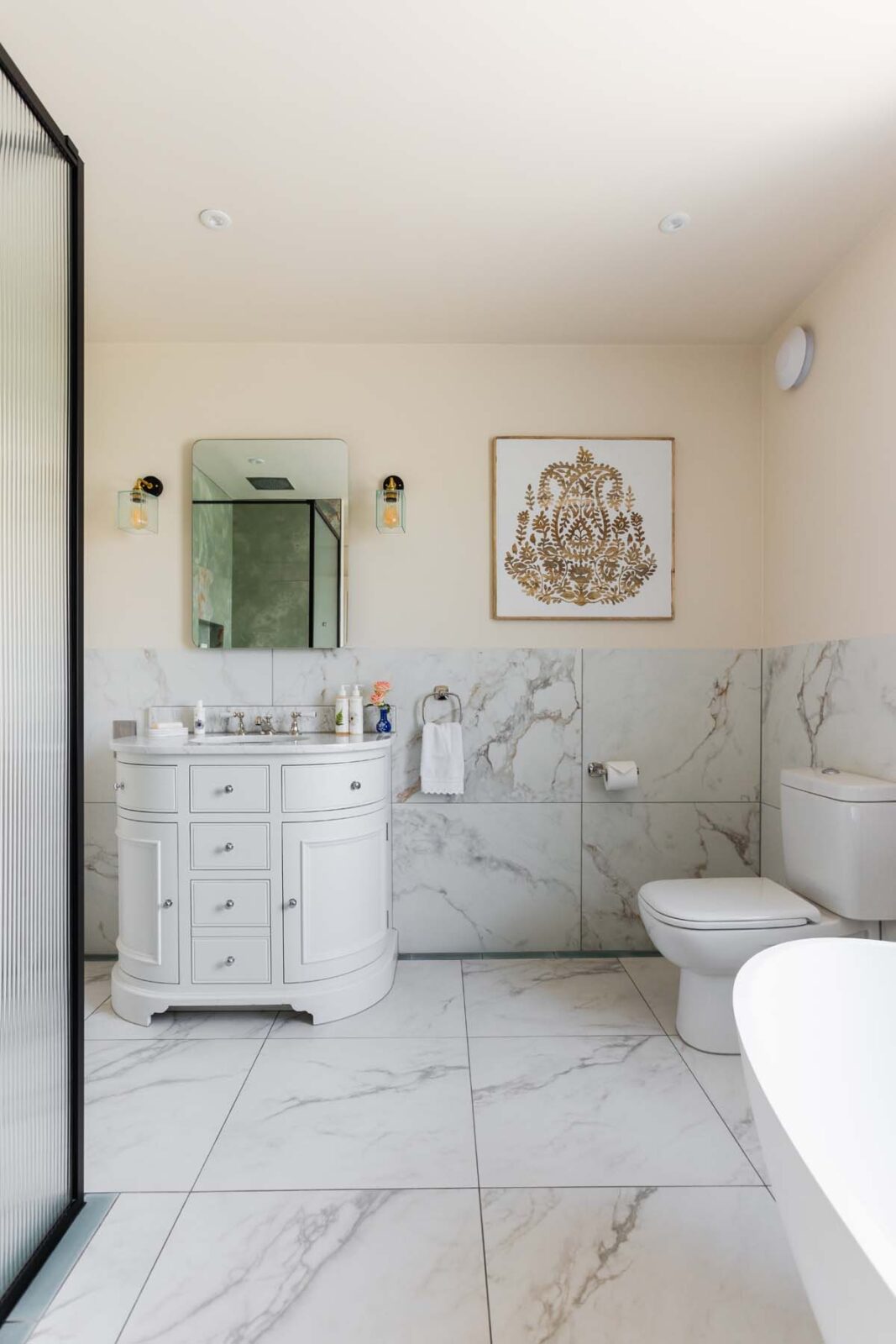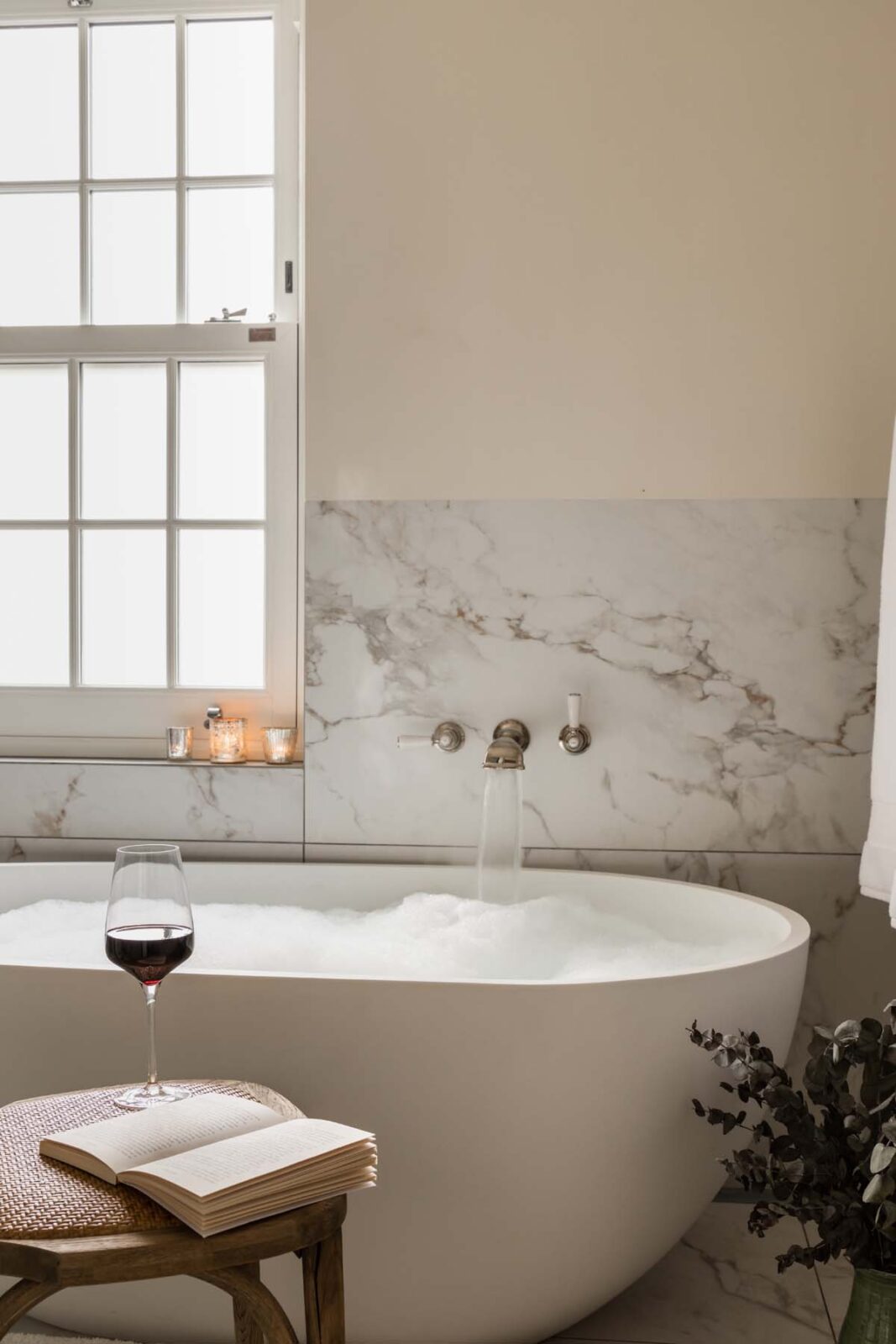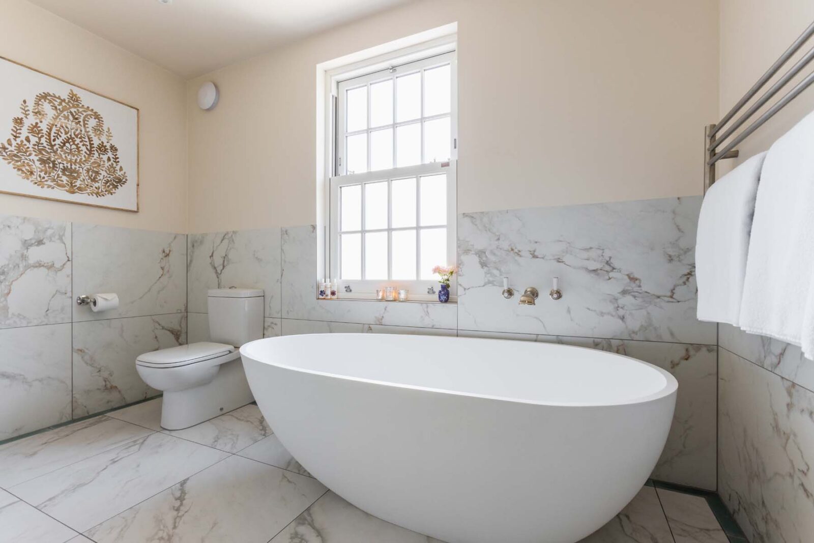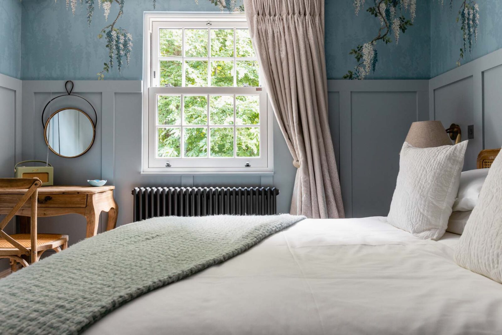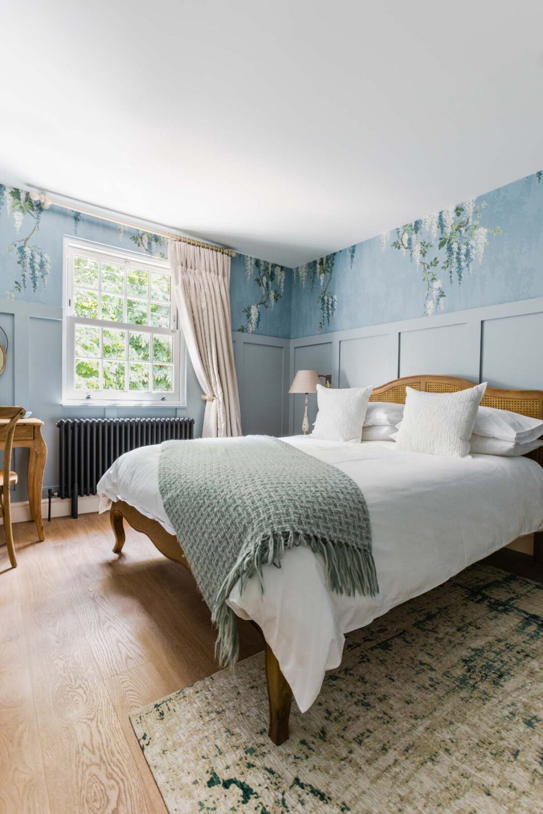 Upstairs, you have the Master Bedroom to your right and a large family bathroom to your left. The Master Bedroom is its very own peaceful sanctuary, with fresh white linens and a statement rattan headboard, all enveloped by striking wisteria mural wallpaper. The family bathroom sings of style and grandeur, with its peachy-pink coated walls, giant pear-shaped bathtub and marble-lined rainfall shower.
