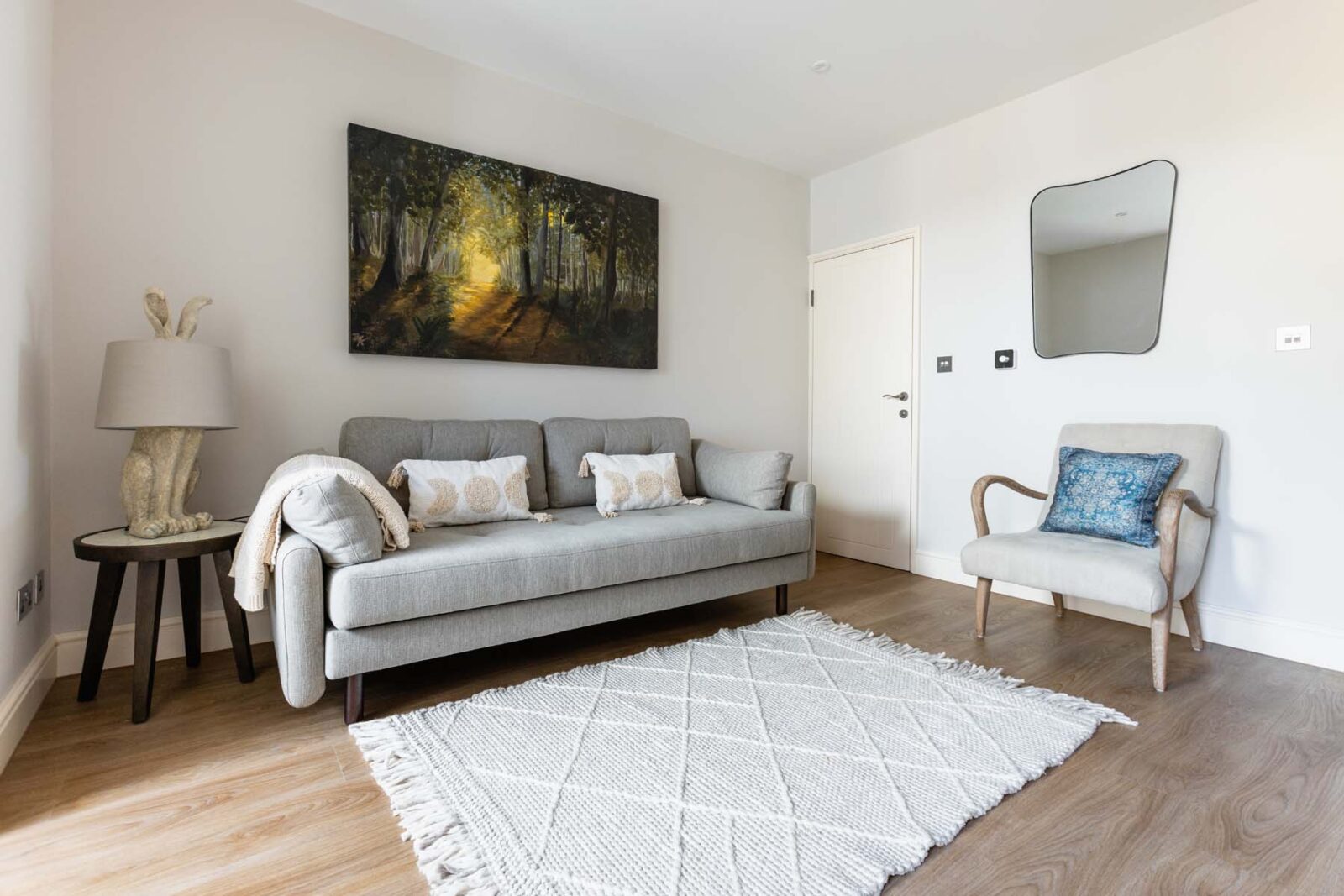 You enter the cottage through the front door which opens up into the open-plan living room, from where you can see all the way through to the light flooded kitchen at the back of the property. A natural palette of warm Farrow & Ball neutrals, sky blues and woodland greens weave their way throughout the cottage, helping to bring the surrounding parkland indoors with you as you check-in to your very own park-side haven.