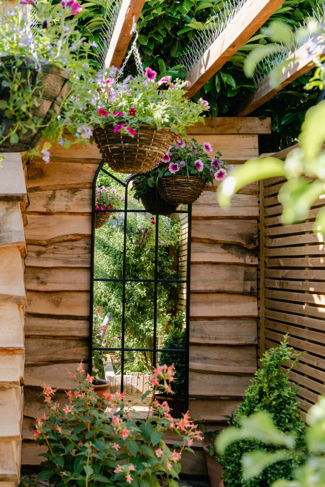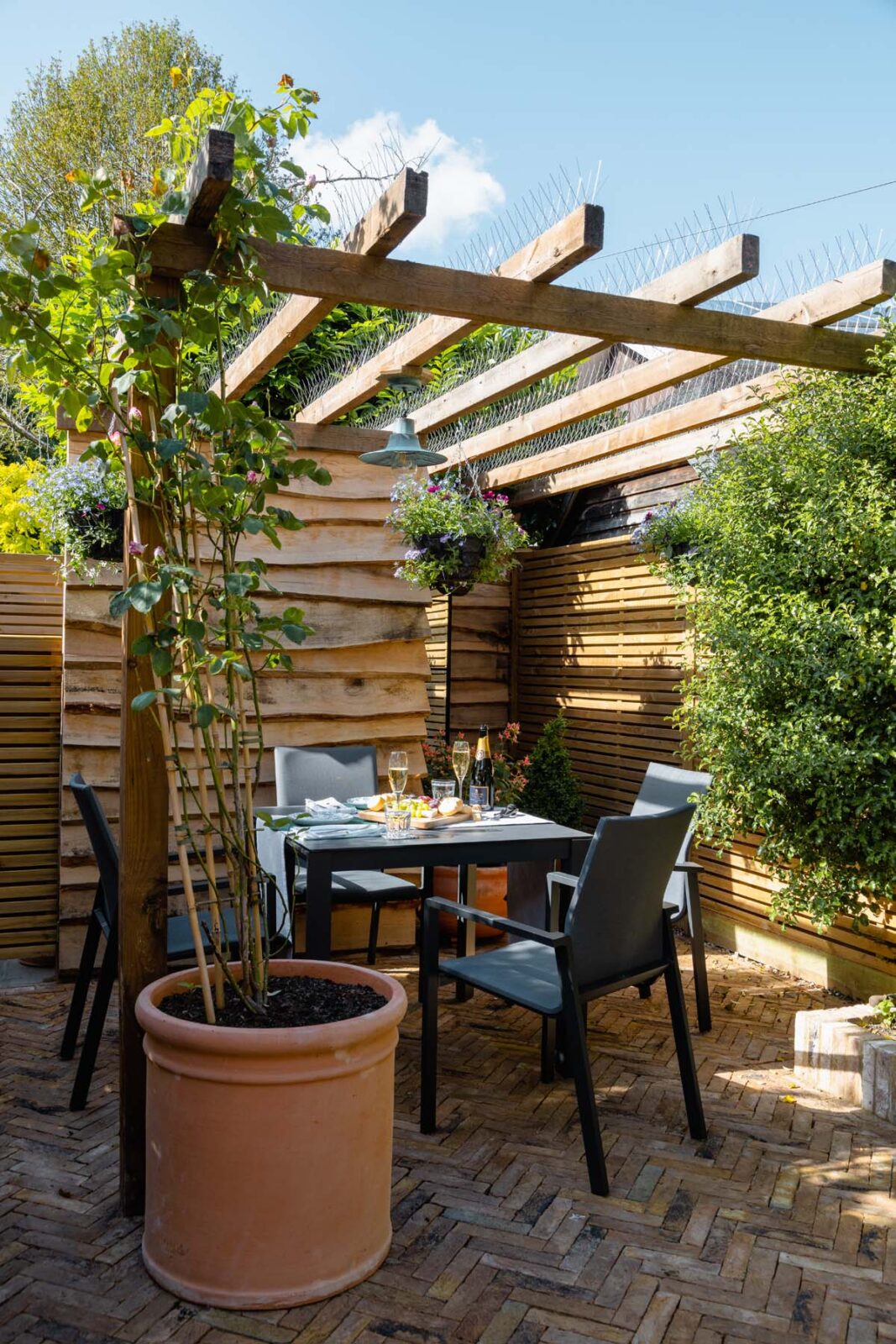 Through the French doors from the kitchen (and separate side door from the TV room) you can access the enclosed patio garden filled with freshly planted blooms. There’s an outdoor dining table and chairs underneath the pergola with overhead lighting for those warmer evenings and suppers under the stars.