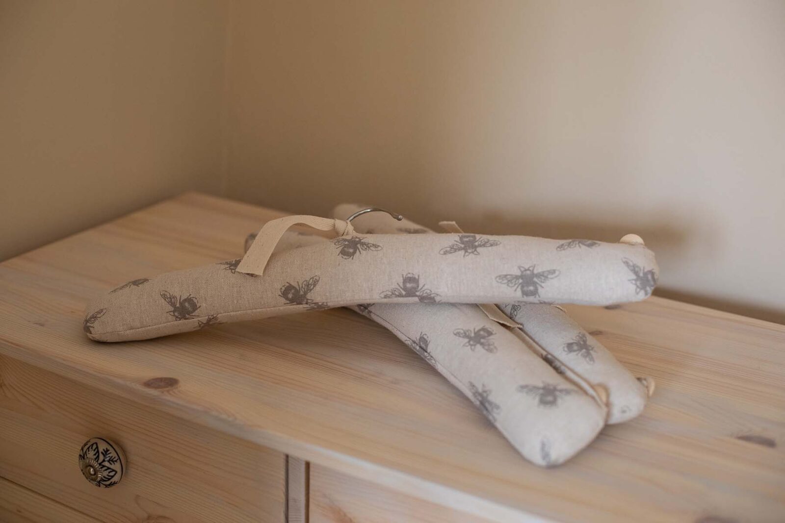 Upstairs, there are two stylish bedrooms and a family bathroom with a bathtub and overhead shower. The cosy, cabin-esque bedrooms are individually designed, each featuring their own unique decor and artwork. One is dressed with neutral, earthy tones, and finished with floral prints. The other has a more contemporary feel, with a bold royal blue headboard and peach throws from the Secret Linen Store.
