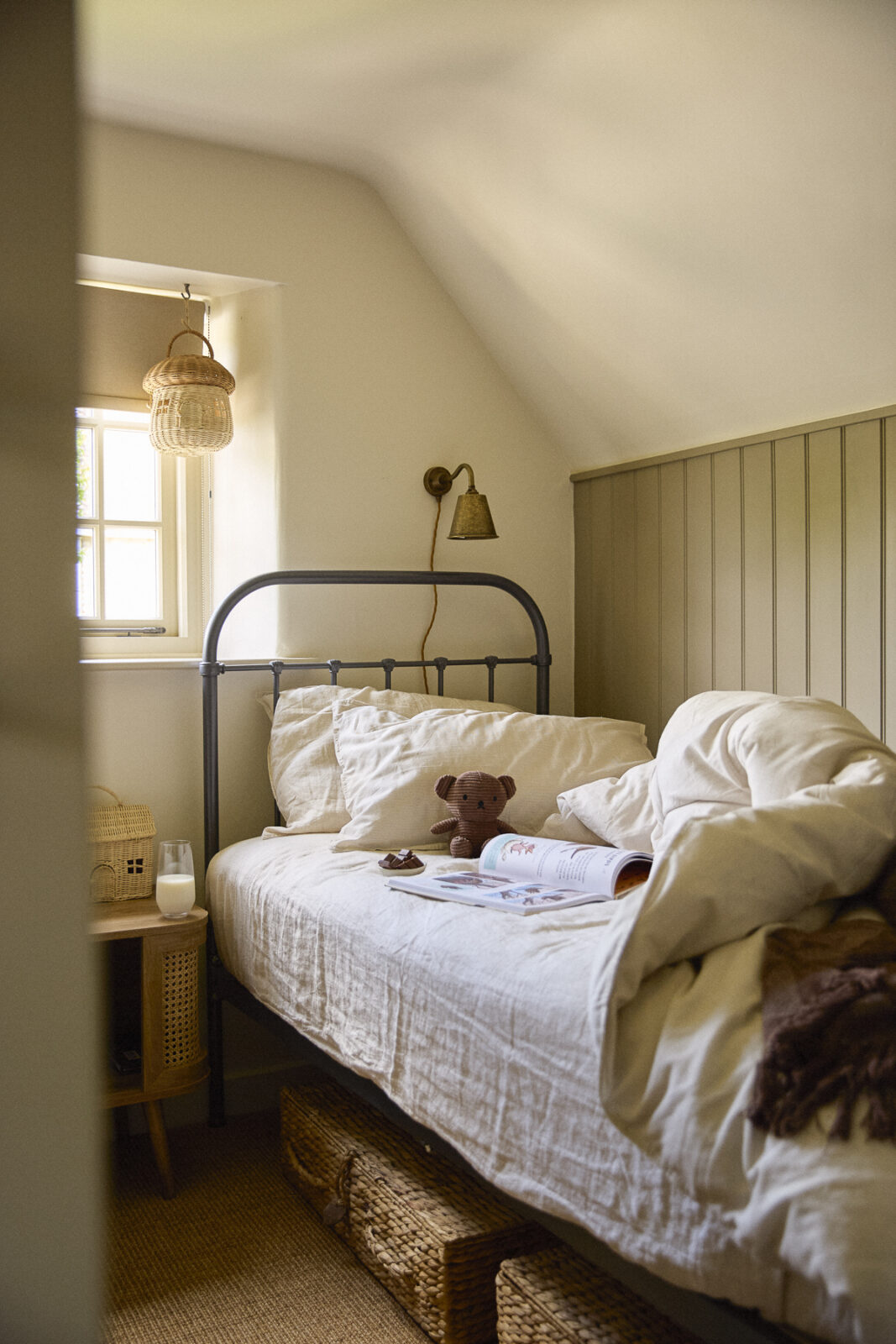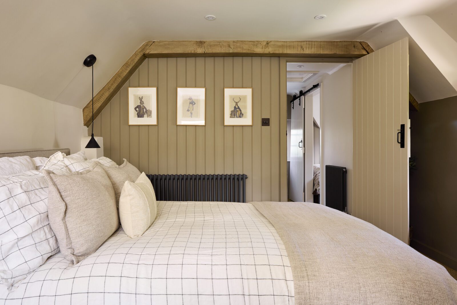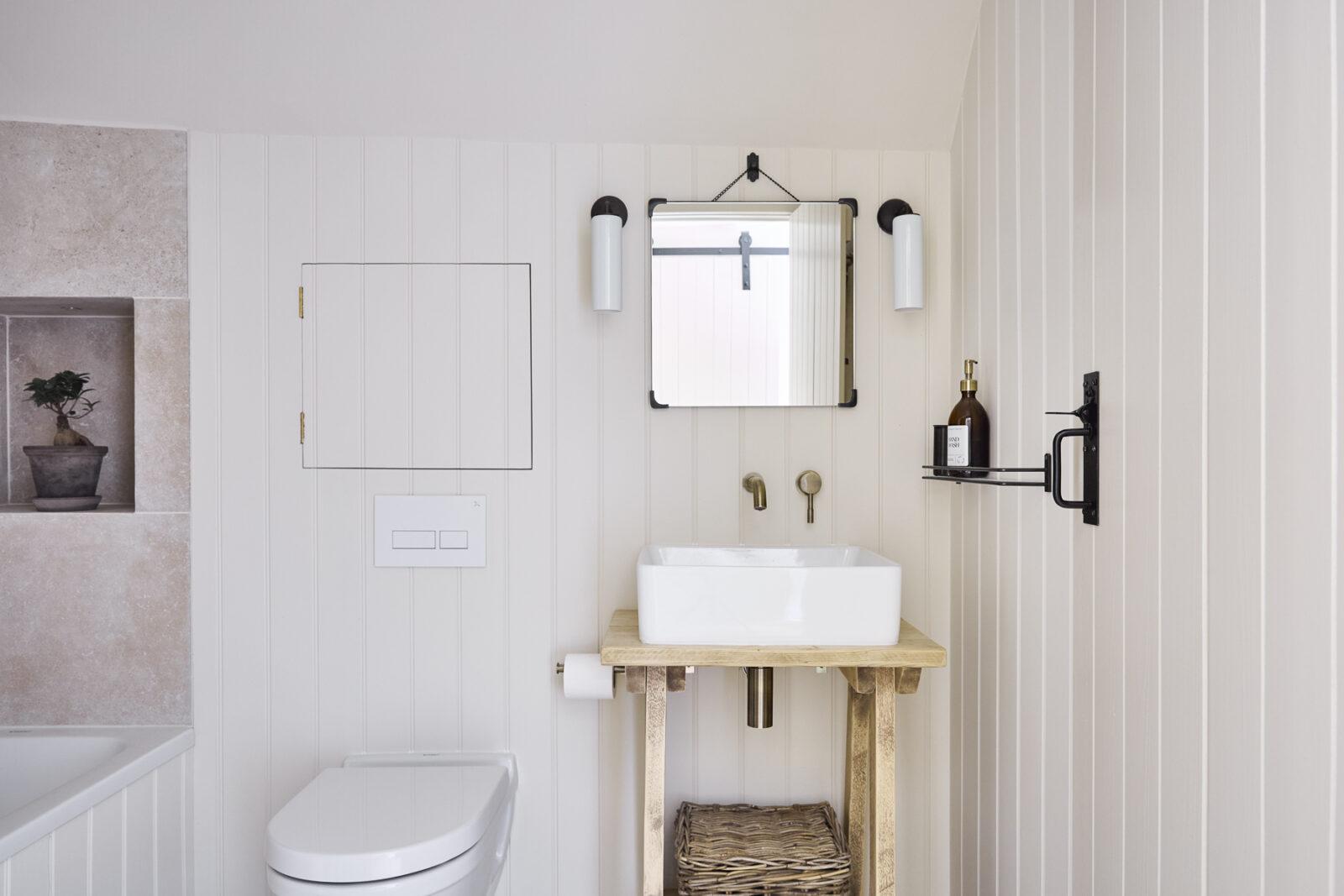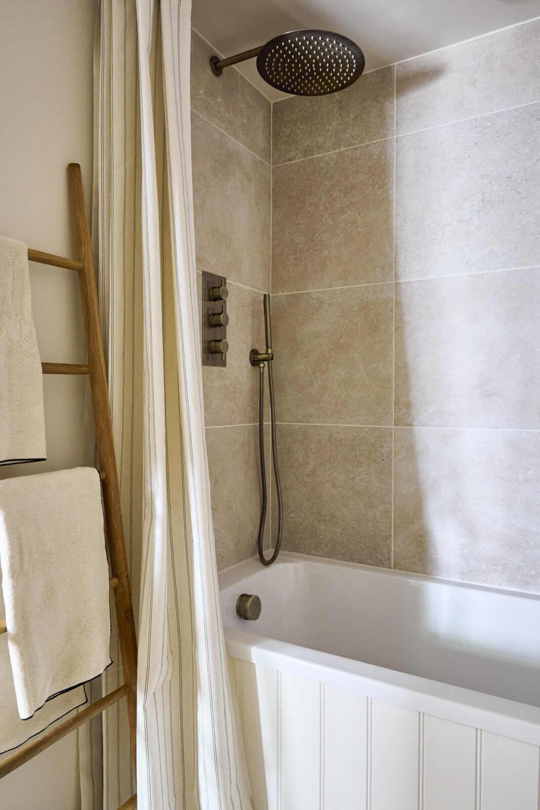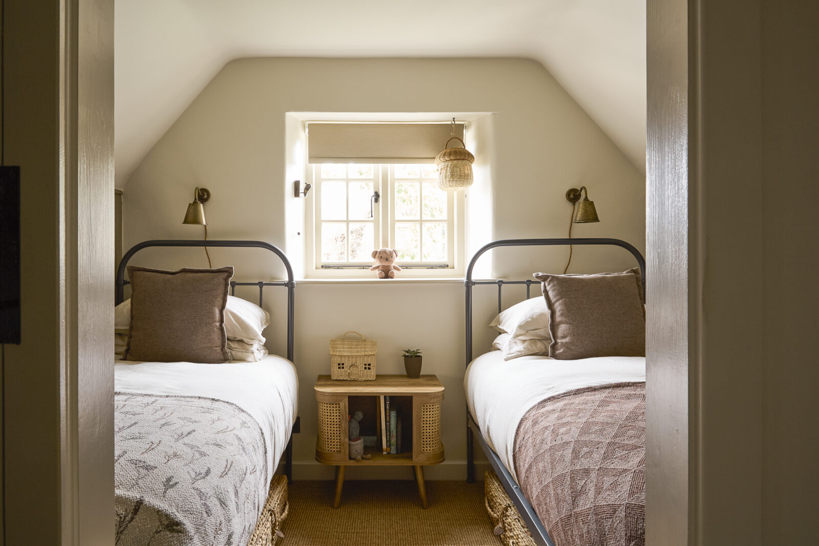 Upstairs you’ll find two beautiful bedrooms that are so cosy, they almost have a subtle alpine feel to them. There’s one double room and one twin room, and they benefit from wooden panelled walls, charming sloped ceilings, old wooden beams and chic brass light fittings. The panelling continues into the family bathroom, where you’ll find a bath tub with an overhead rainfall shower.