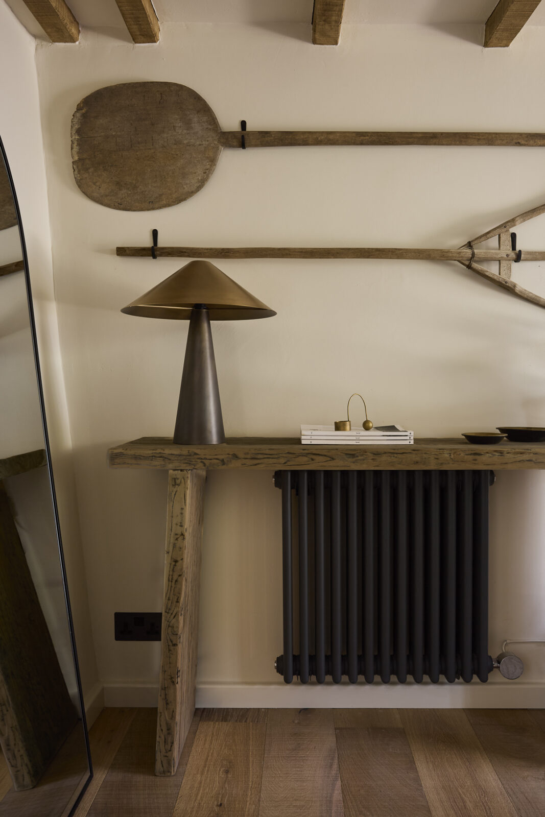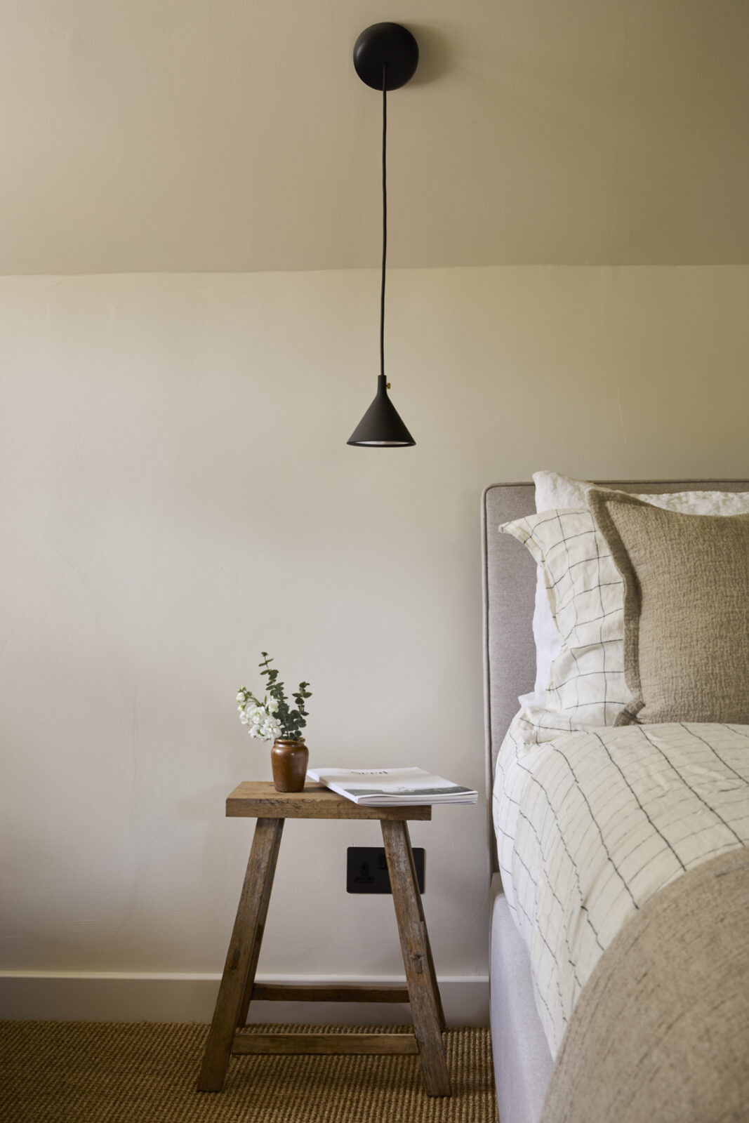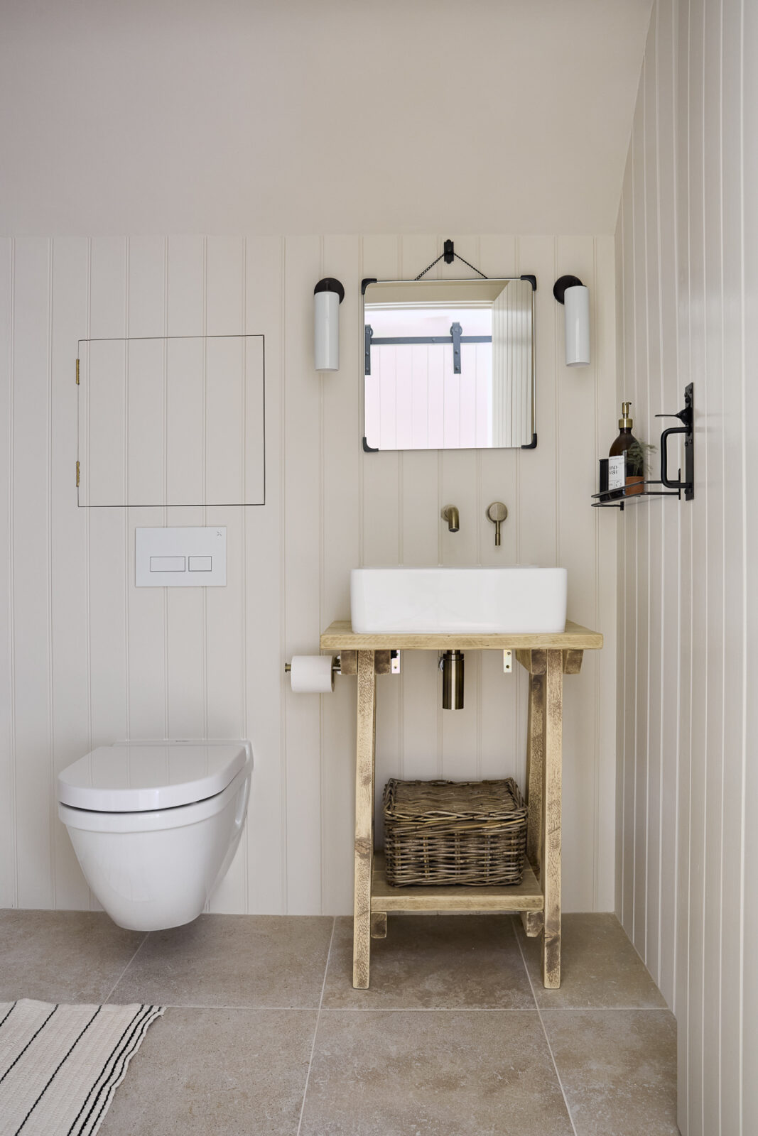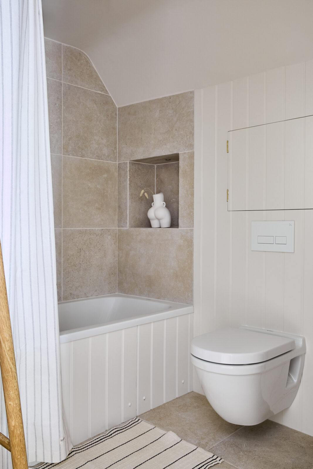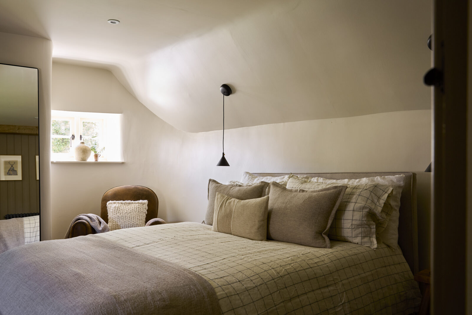 Upstairs you’ll find two beautiful bedrooms that are so cosy, they almost have a subtle alpine feel to them. There’s one double room and one twin room, and they benefit from wooden panelled walls, charming sloped ceilings, old wooden beams and chic brass light fittings. The panelling continues into the family bathroom, where you’ll find a bath tub with an overhead rainfall shower.