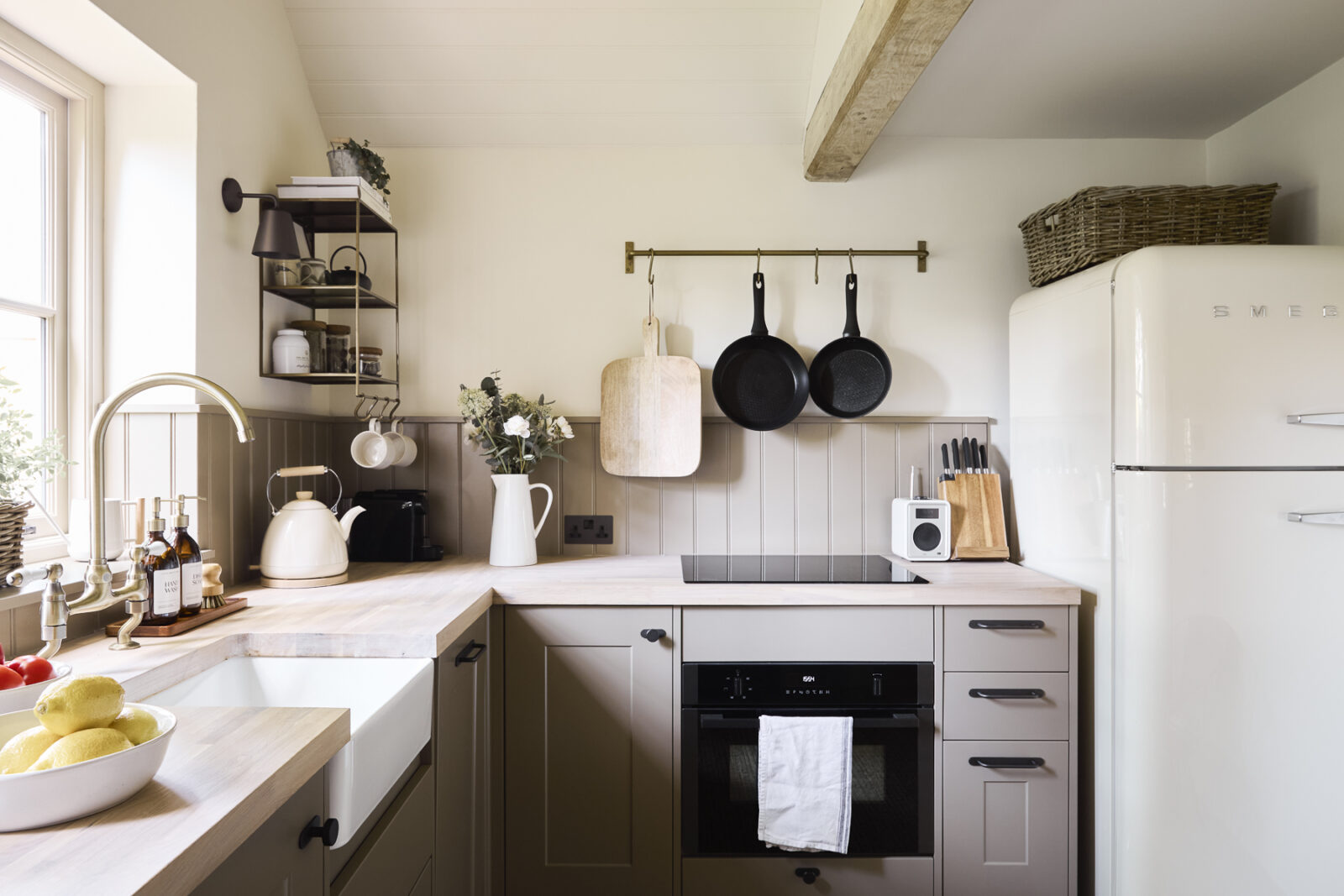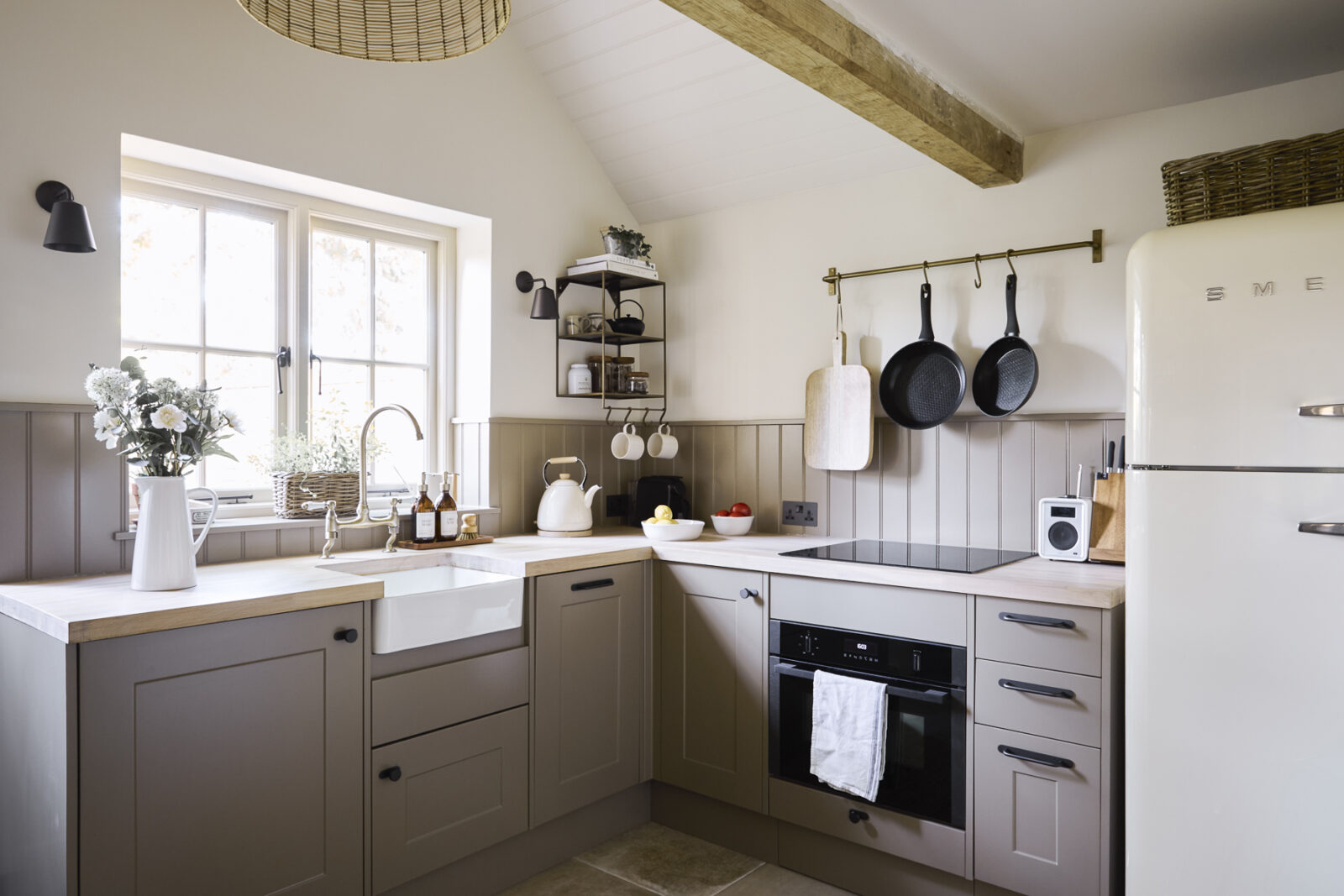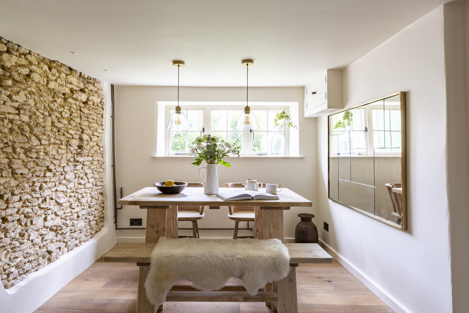 The dining area features an exposed brick wall, a wooden table with a bench and two chairs, and hanging pendent lights. The clever use of mirrors in this escape makes the cottage feel spacious and helps brings the natural light indoors. From here, you access the separate modern country-style kitchen, where you’ll find everything you need for rustling up feasts. We love the large oatmeal-hued SMEG fridge and the classic farmhouse-style sink.