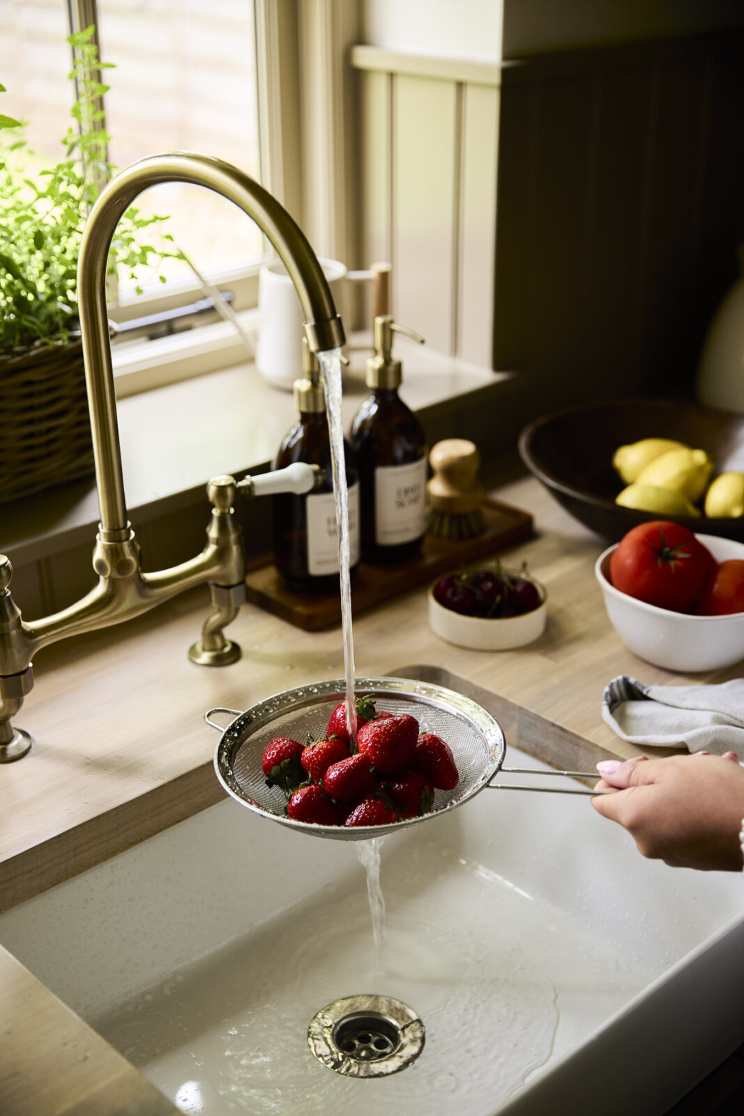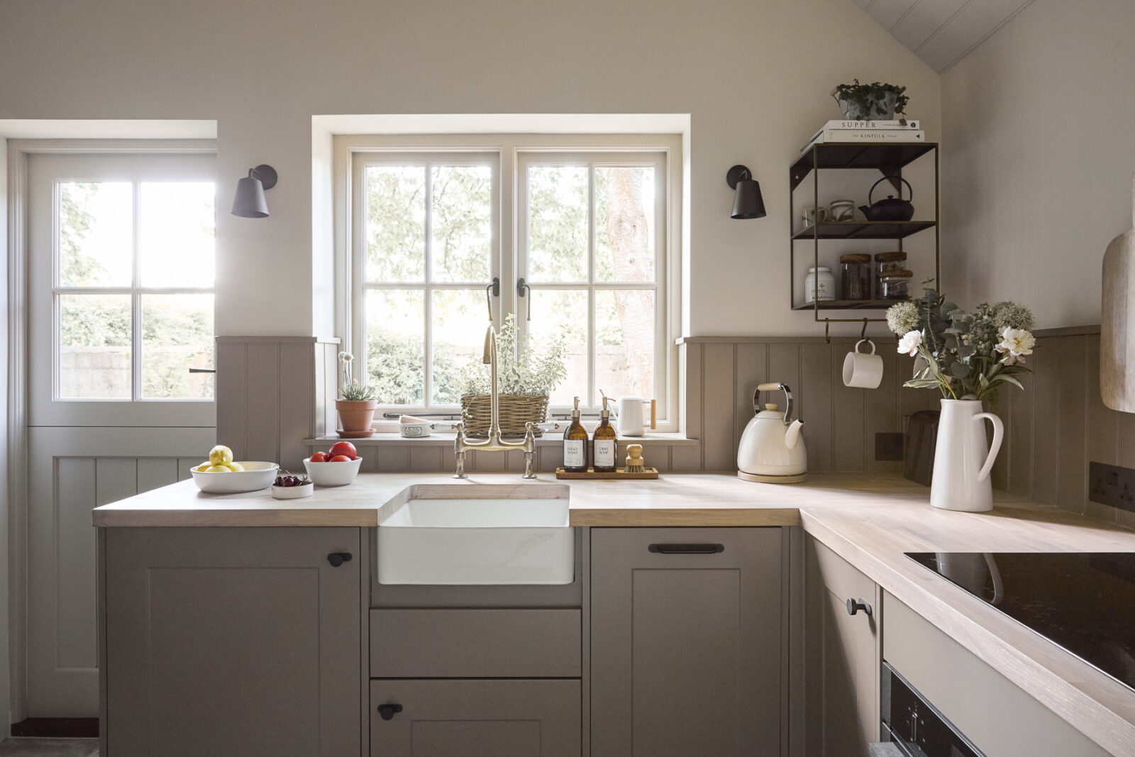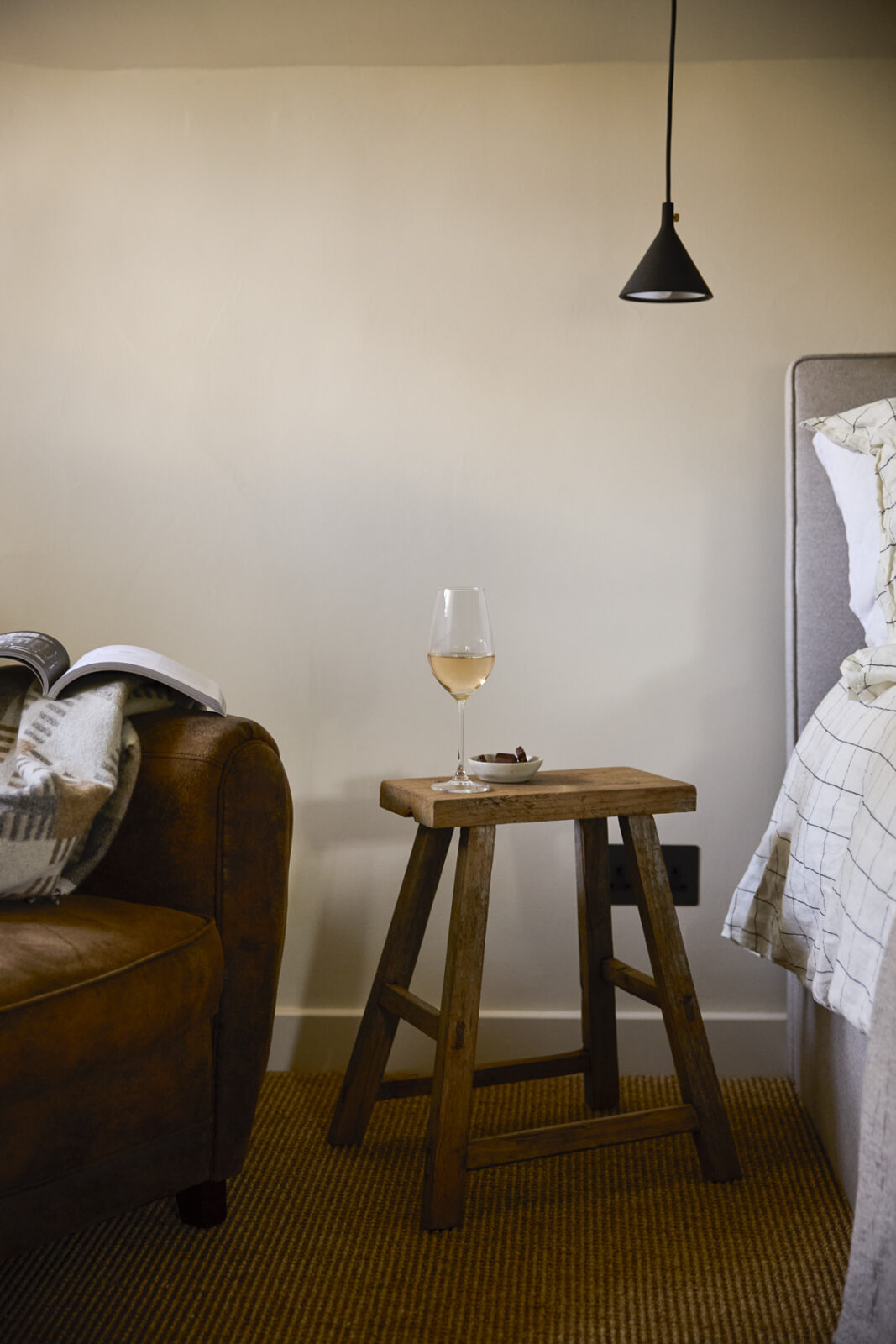 The dining area features an exposed brick wall, a wooden table with a bench and two chairs, and hanging pendent lights. The clever use of mirrors in this escape makes the cottage feel spacious and helps brings the natural light indoors. From here, you access the separate modern country-style kitchen, where you’ll find everything you need for rustling up feasts. We love the large oatmeal-hued SMEG fridge and the classic farmhouse-style sink.