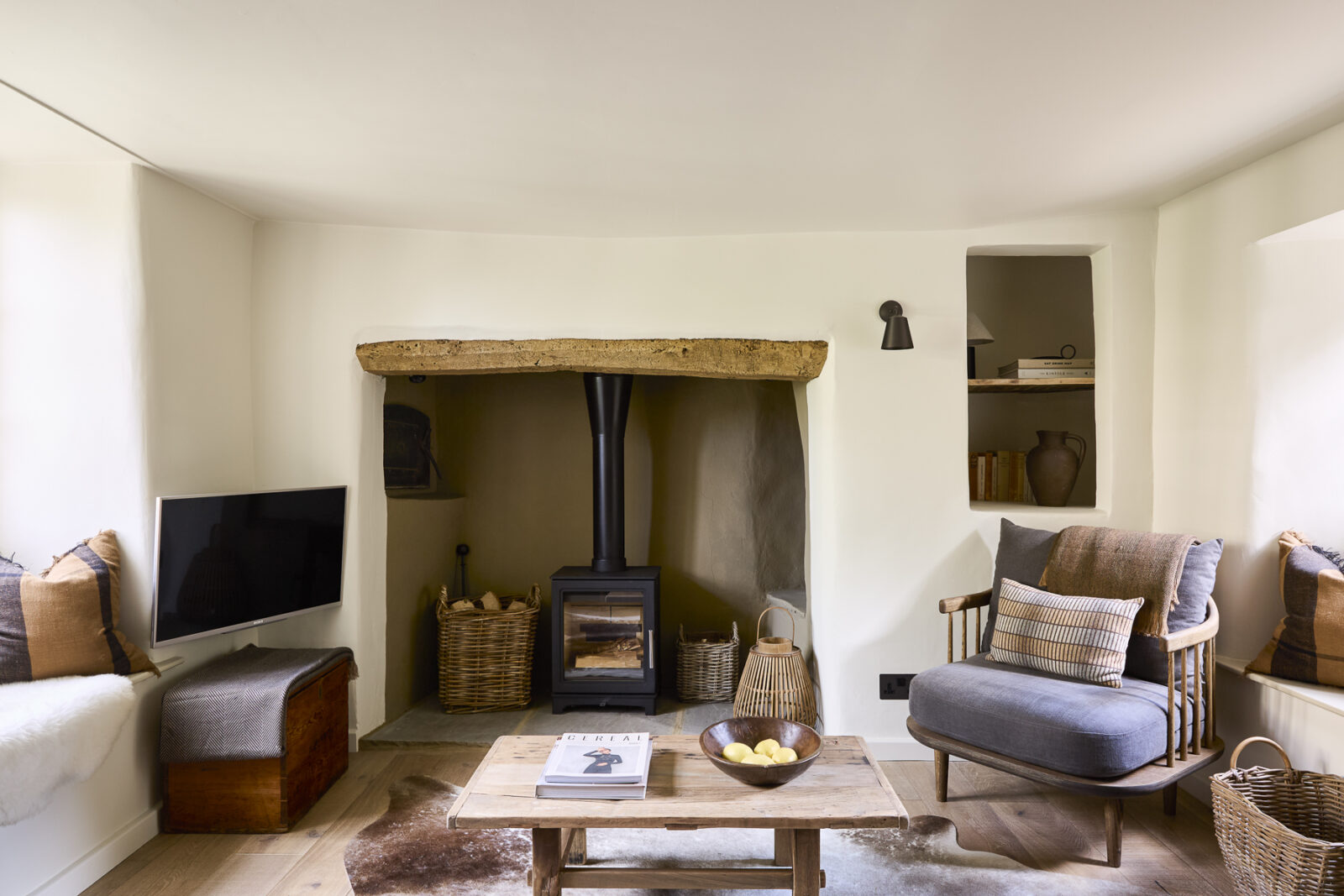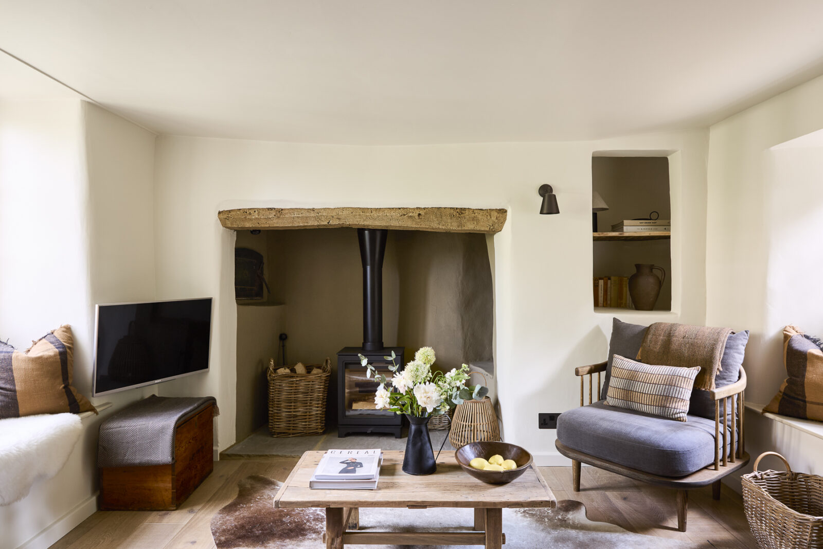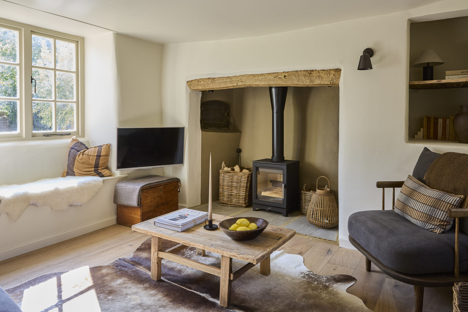 The open-plan living space is cosy and characterful with a subtle nod to Danish design. The sitting area centres around a log burner within the old original fire place, framed by an overhead wooden beam. There’s a sofa, arm chair and window seat, accompanied by cosy throws and sheepskins for hunkering down in front of a film or a crackling fire.