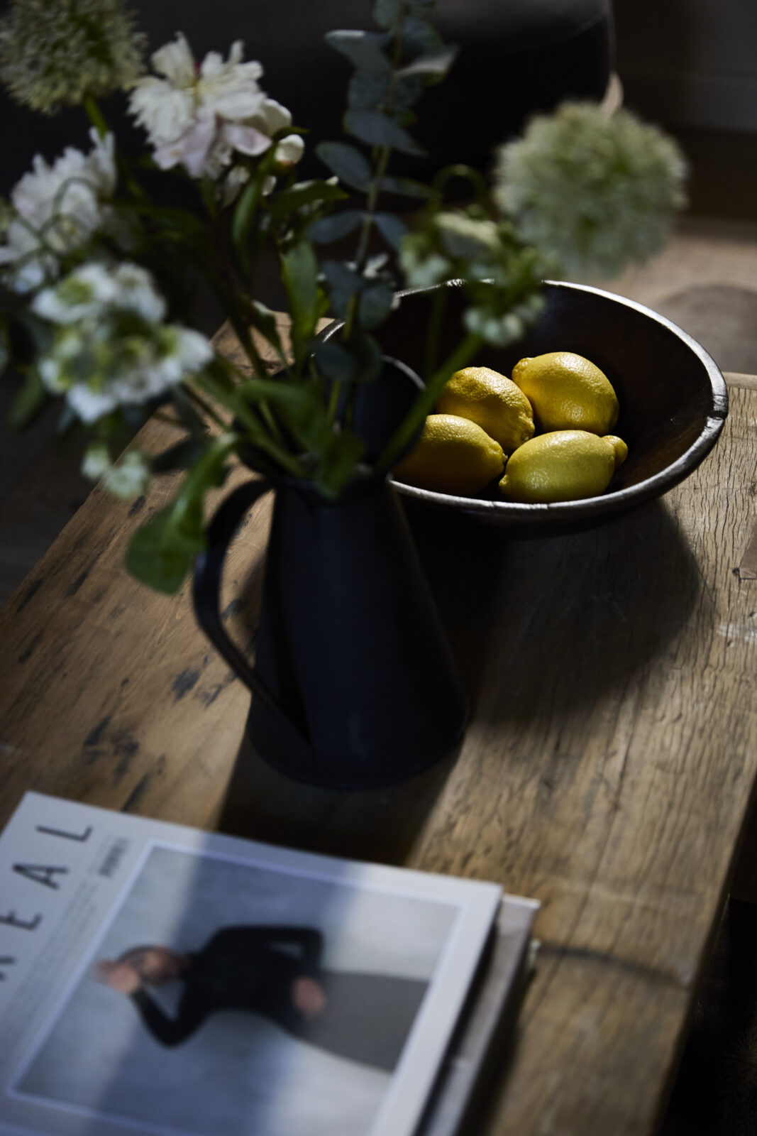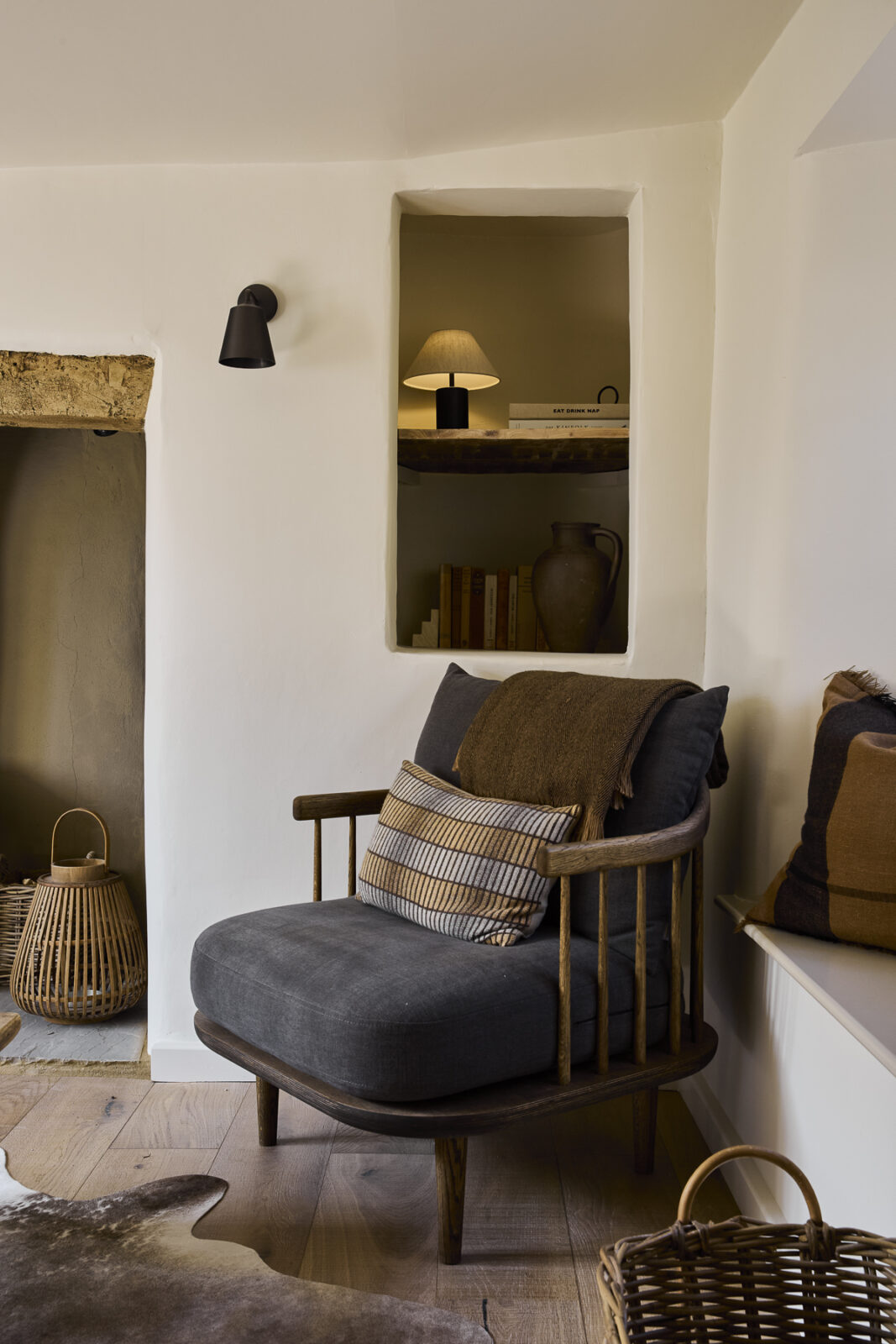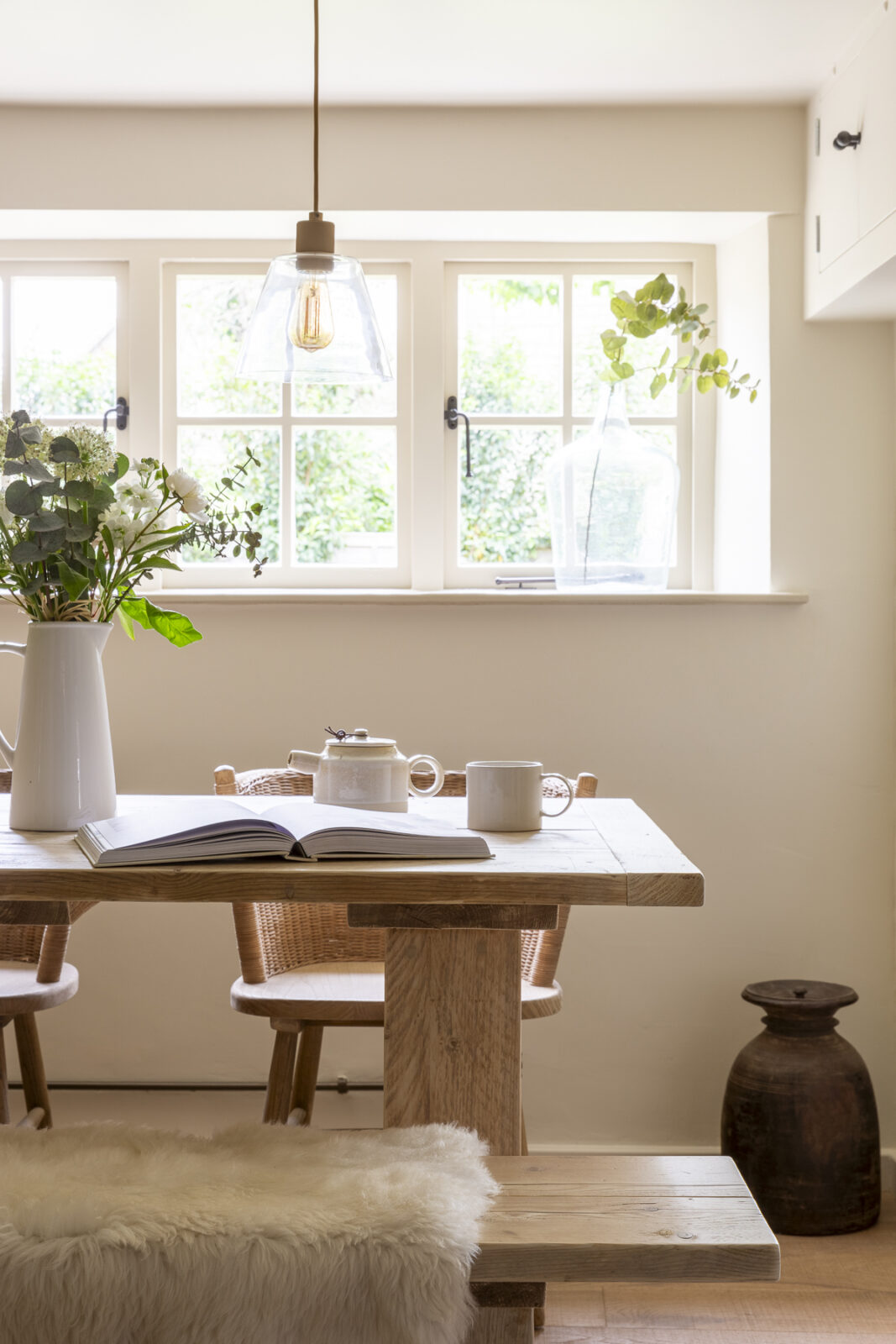 The open-plan living space is cosy and characterful with a subtle nod to Danish design. The sitting area centres around a log burner within the old original fire place, framed by an overhead wooden beam. There’s a sofa, arm chair and window seat, accompanied by cosy throws and sheepskins for hunkering down in front of a film or a crackling fire.