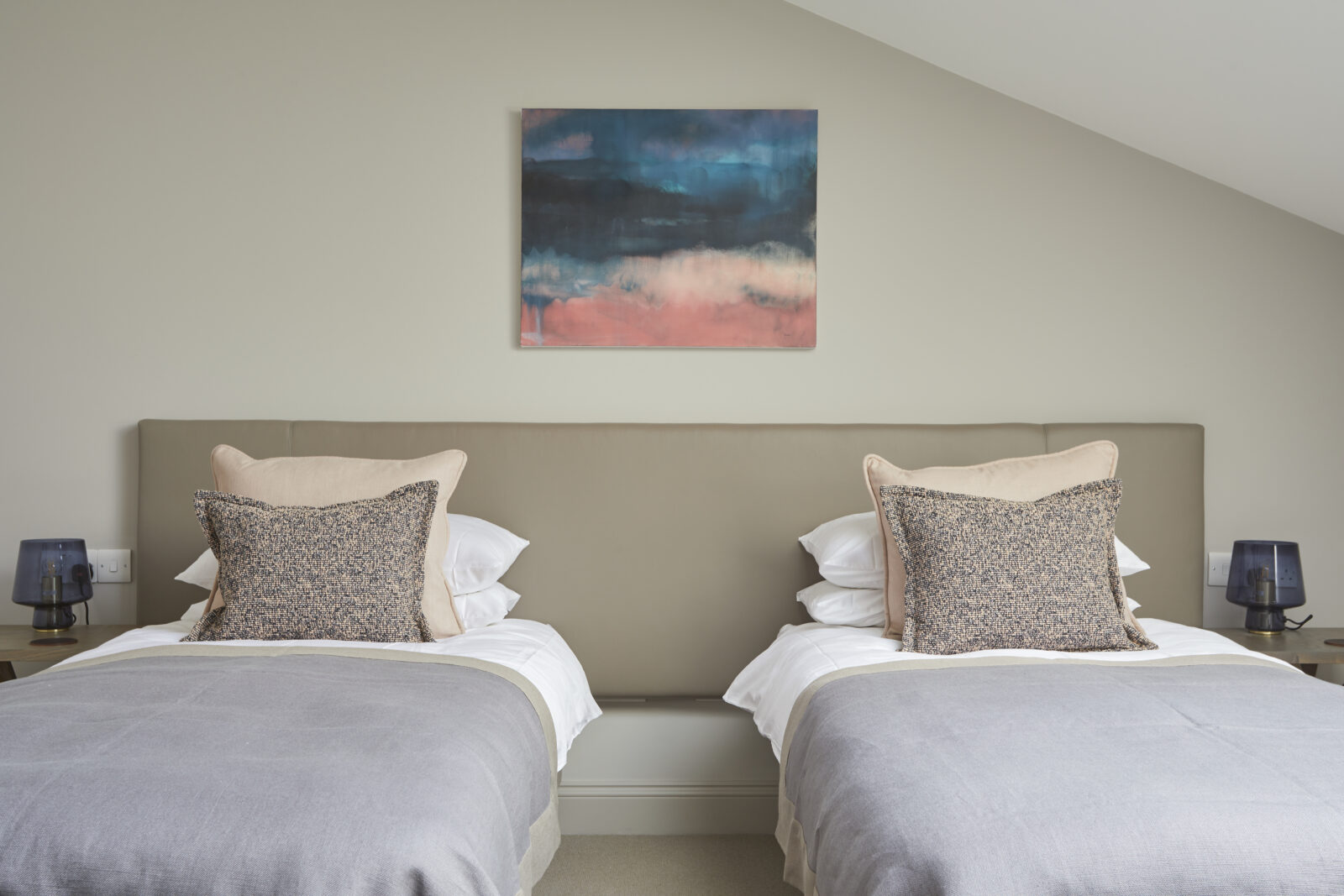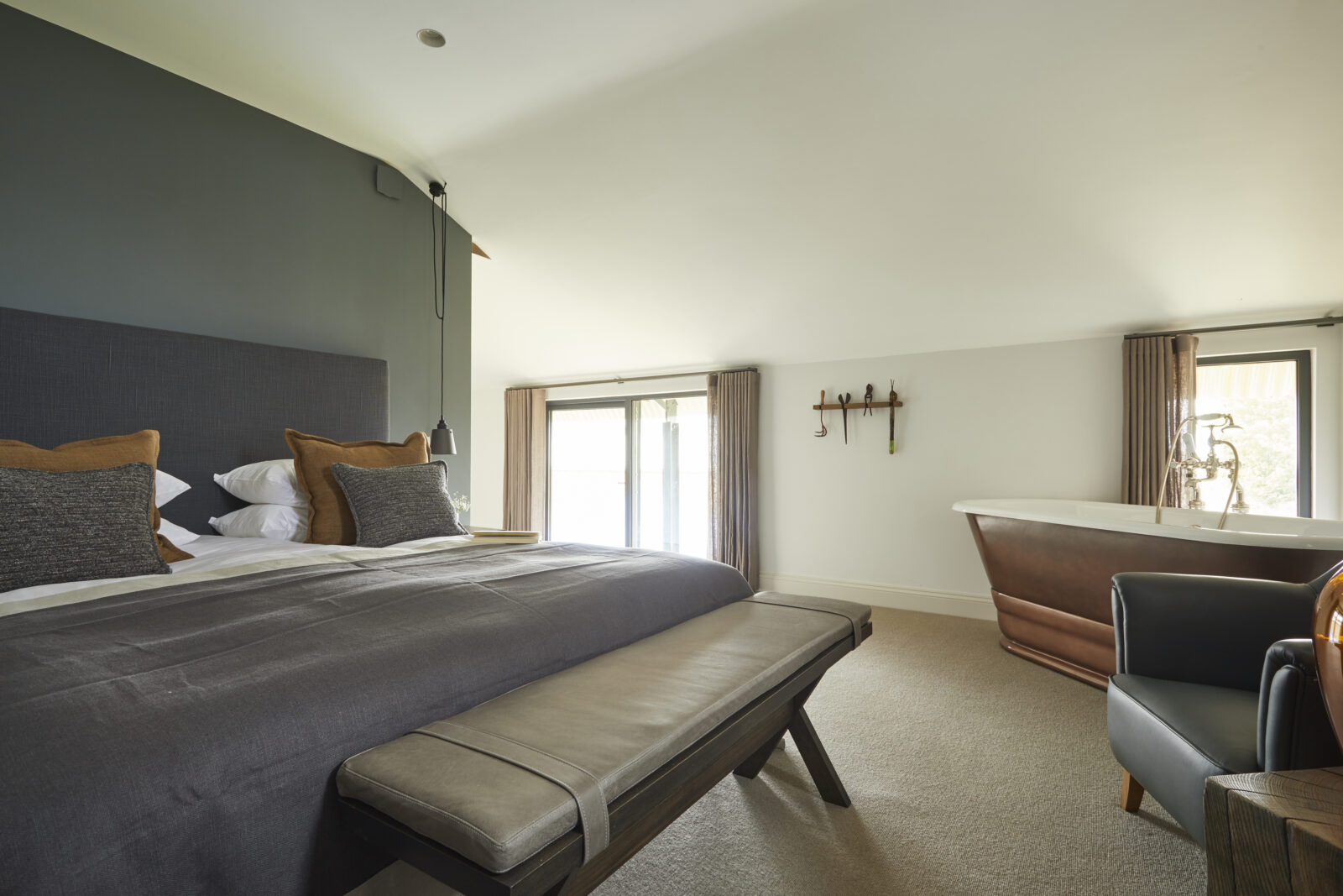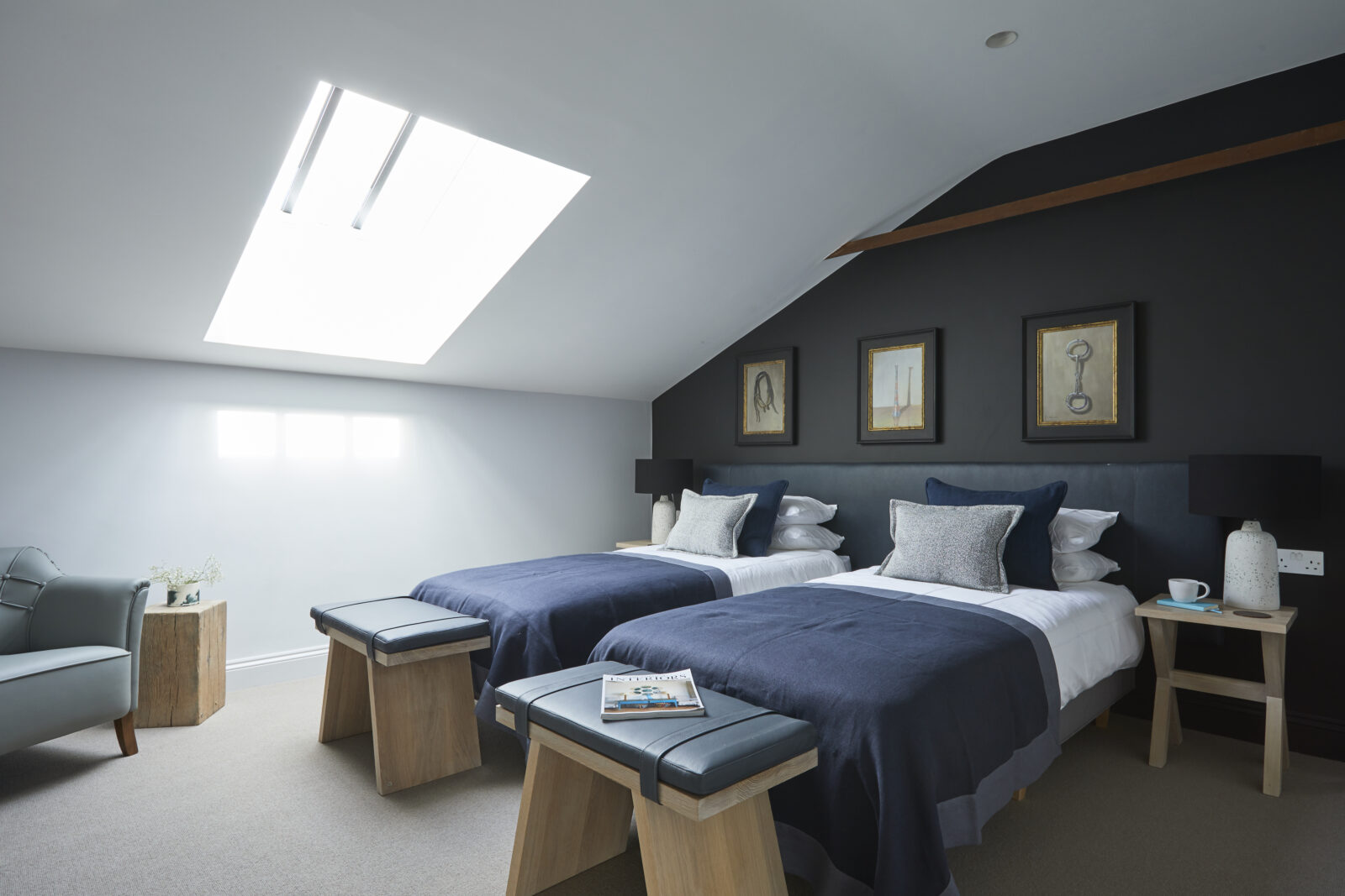 Climb a central staircase to find four adjoining super-king bedrooms along a corridor high in the rafters. Two of these rooms can be made into twins, and all include vast views of the Cotswold countryside and exude luxury with designer touches.