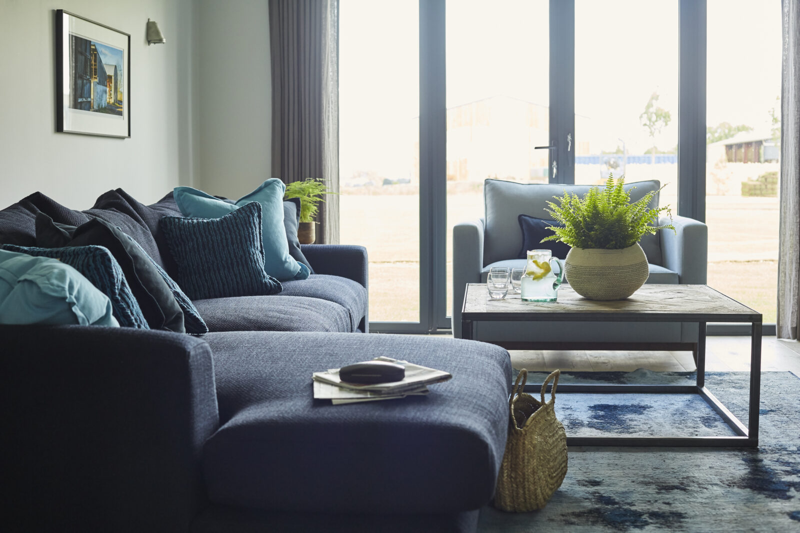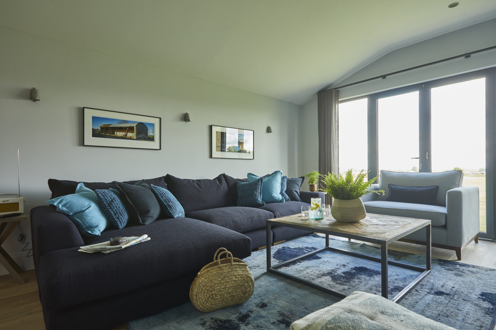 As you enter, a spacious, glass-fronted hallway transforms into a large living space with log-burning fire and a trio of sofas to relax on. The floor-to-ceiling windows really make use of the expansive views the Old Hay Barn boasts. And for the little ones, the next door snug room provides space for the younger travellers amongst you to settle down. There is also a separate games room with a ping pong table and a football table.