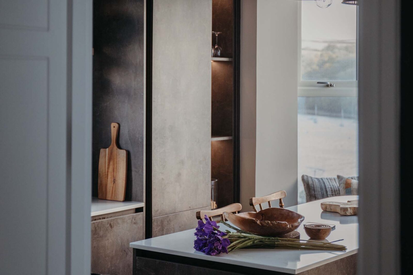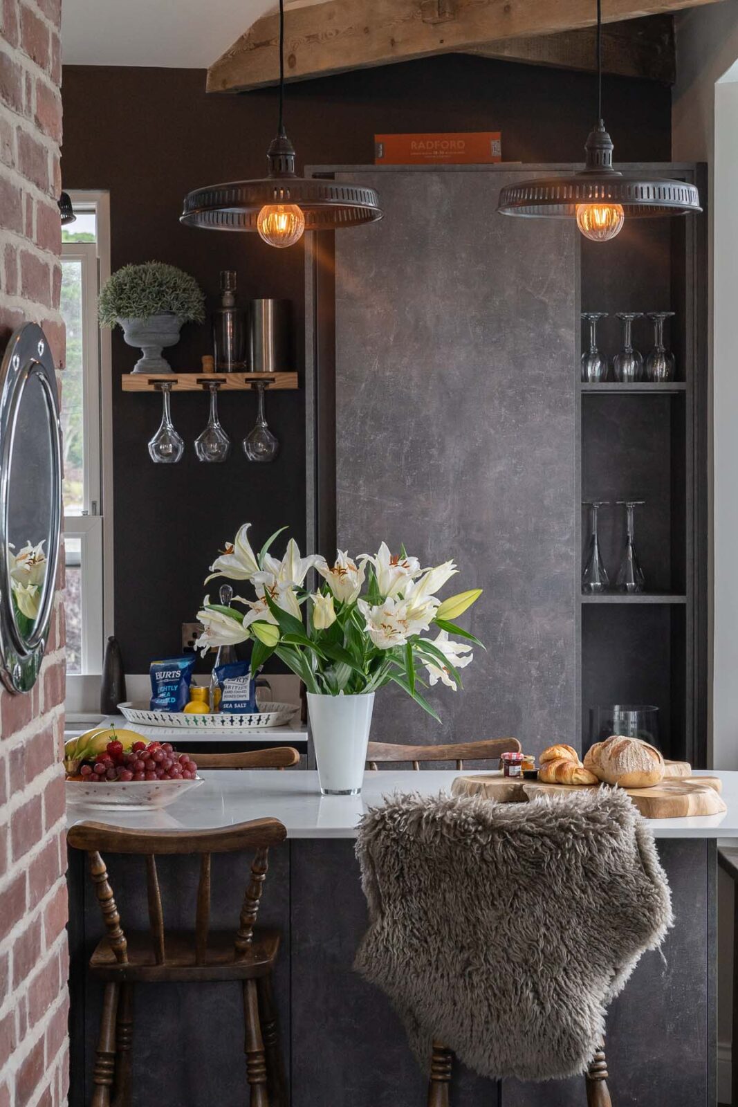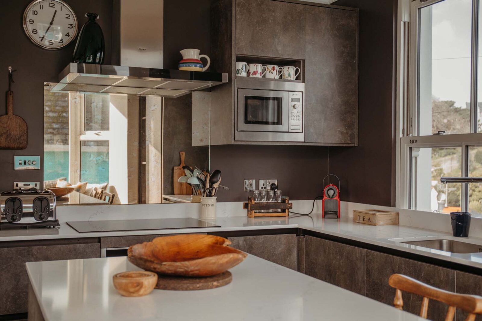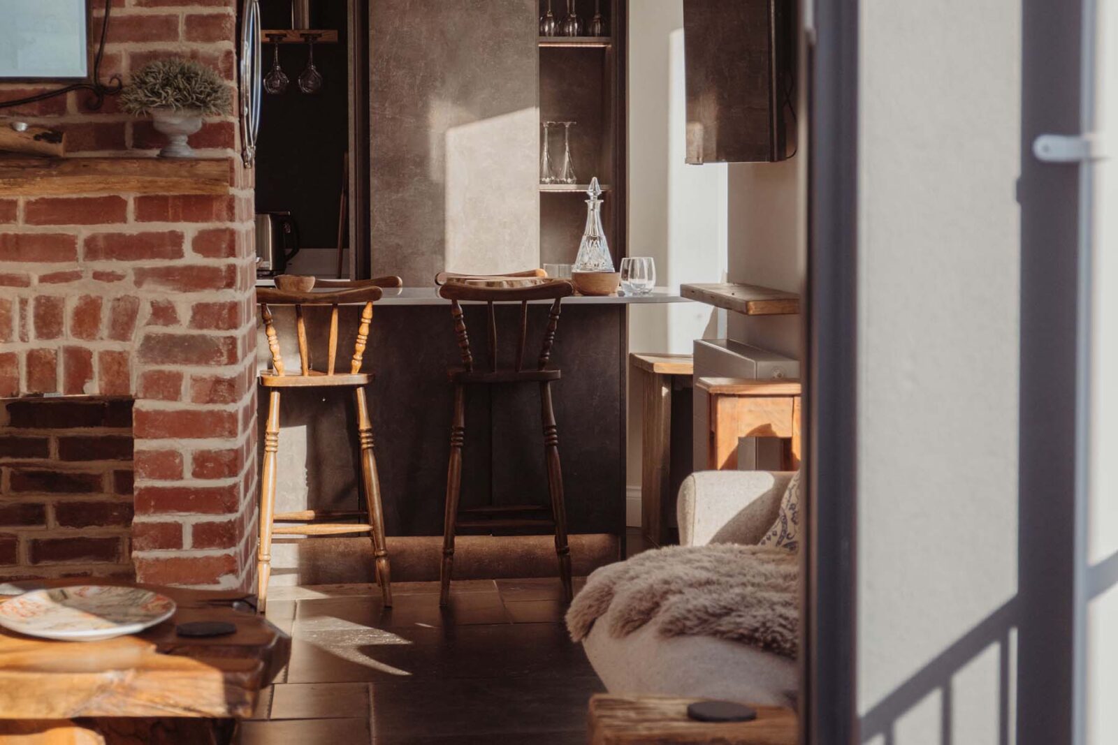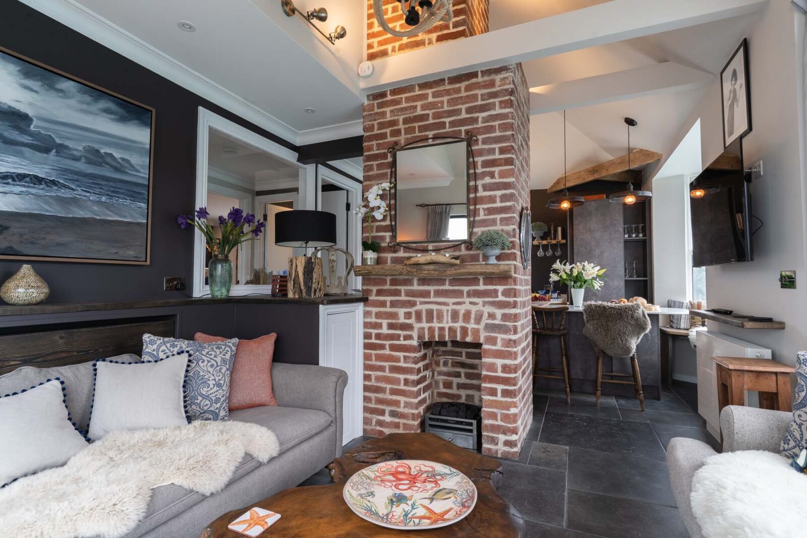 There’s a modern, fully equipped kitchen with an island beside a bright bay window for counter top dining seating up to 8 people. The adjacent open-plan living area centres around the feature chimney breast. With ceilings that open up to the eaves, this is a light, spacious and characterful living area with a Smart TV and a coal-effect gas fire.