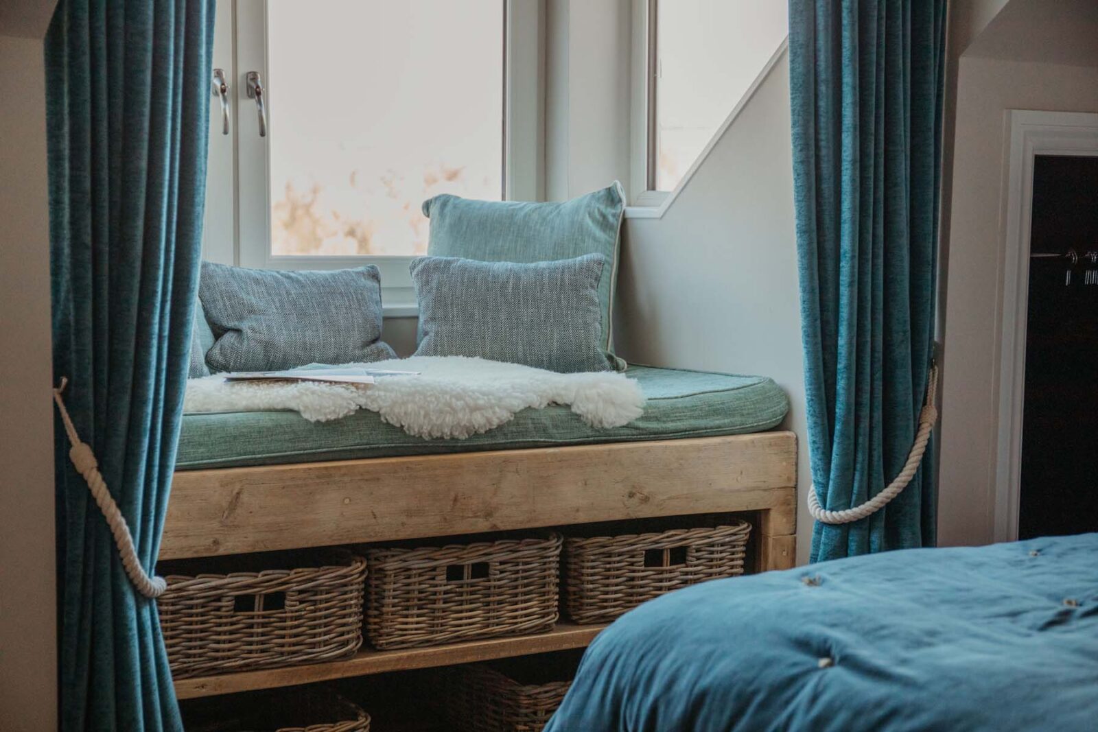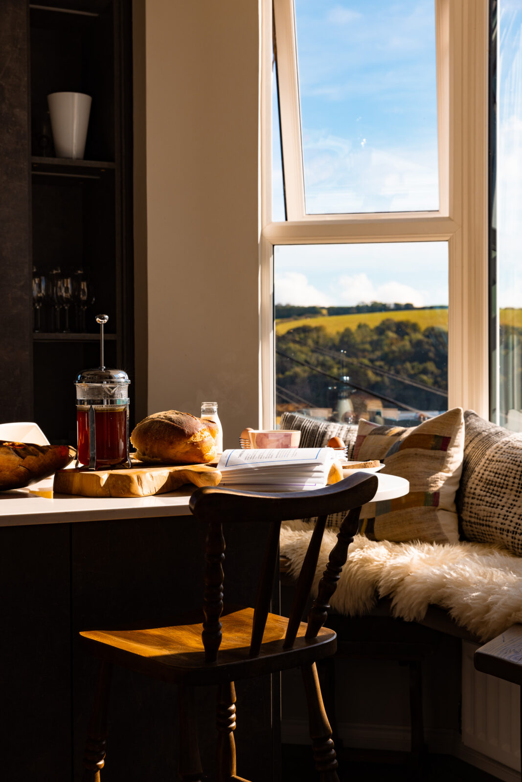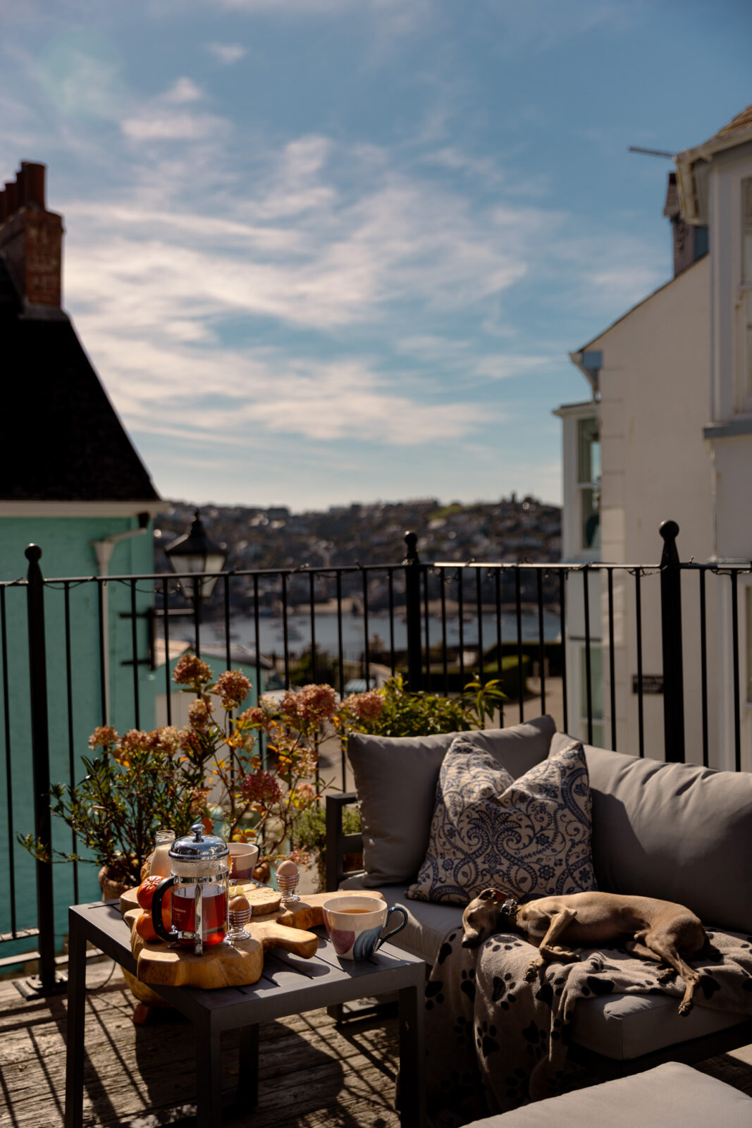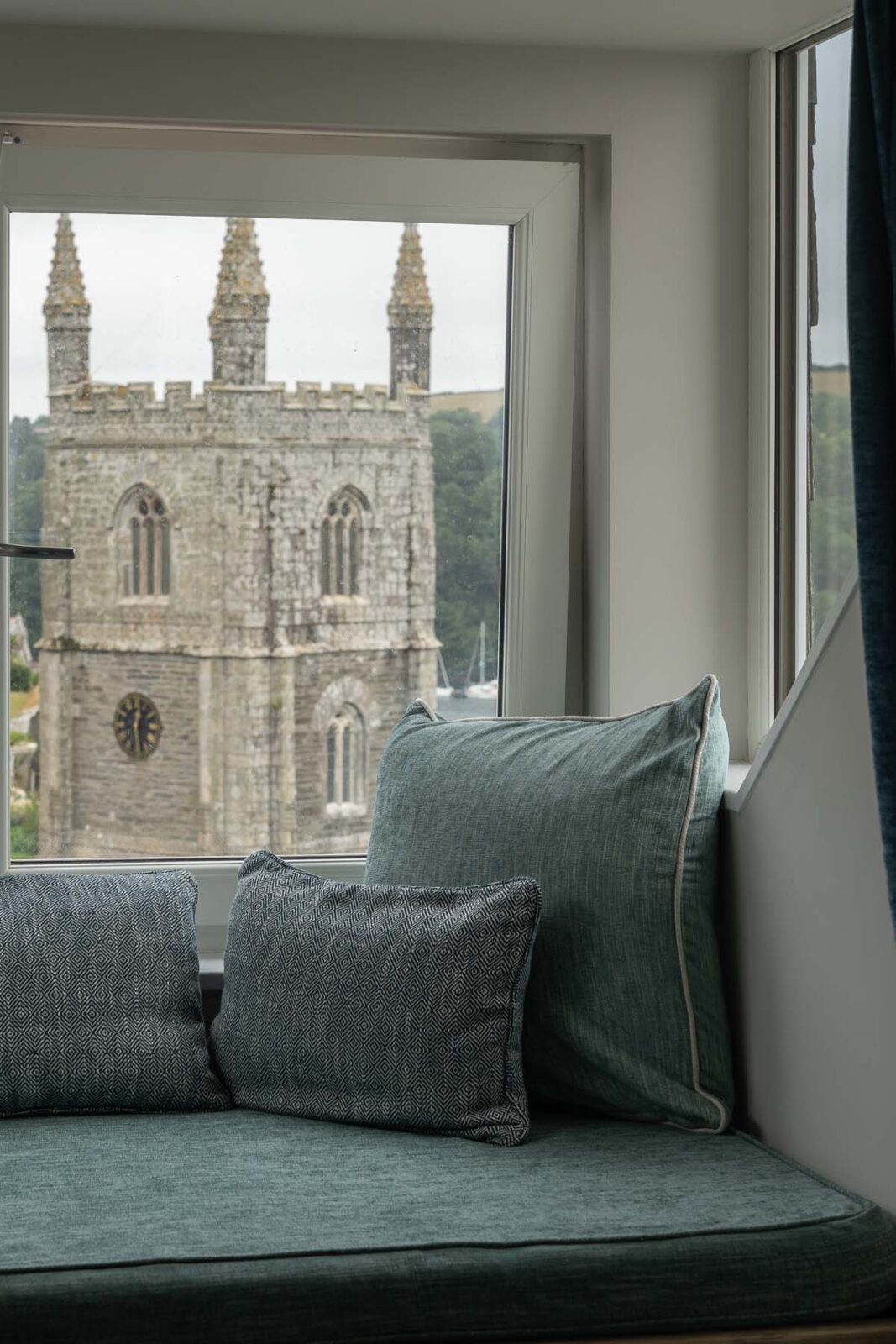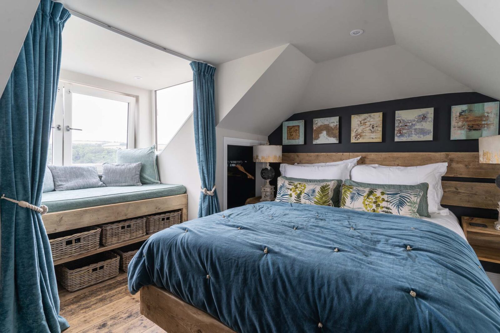At the top of the house you’ll find the loft-style master suite with a king-size bed made by local craftsmen, more fabulous Fowey Estuary views, and en-suite bathroom with a separate bath and shower. The built-in daybed makes for the perfect cosy nook to watch the world go by.