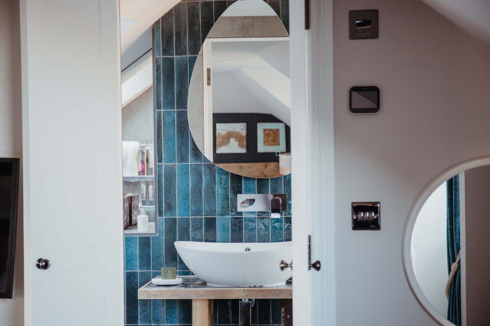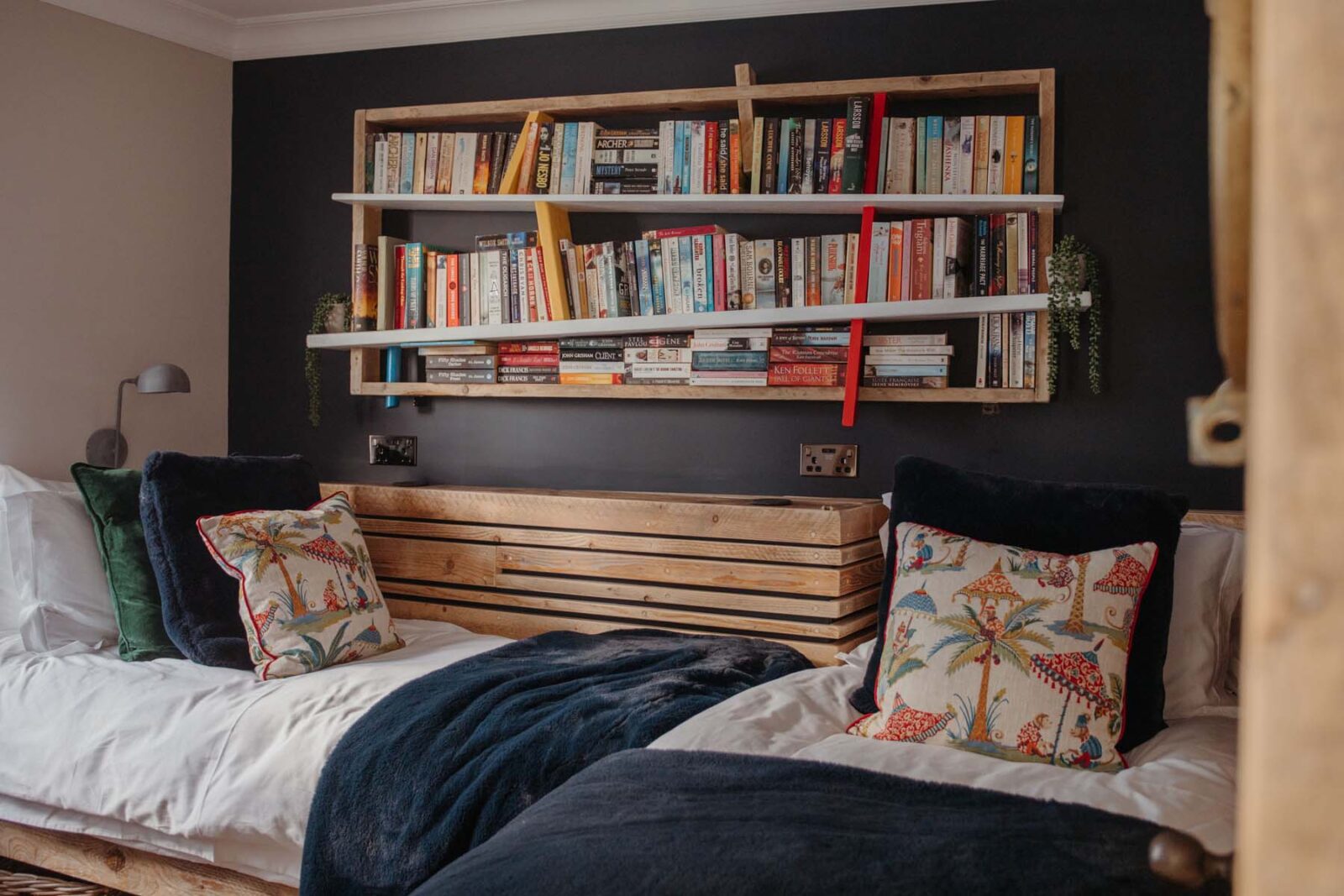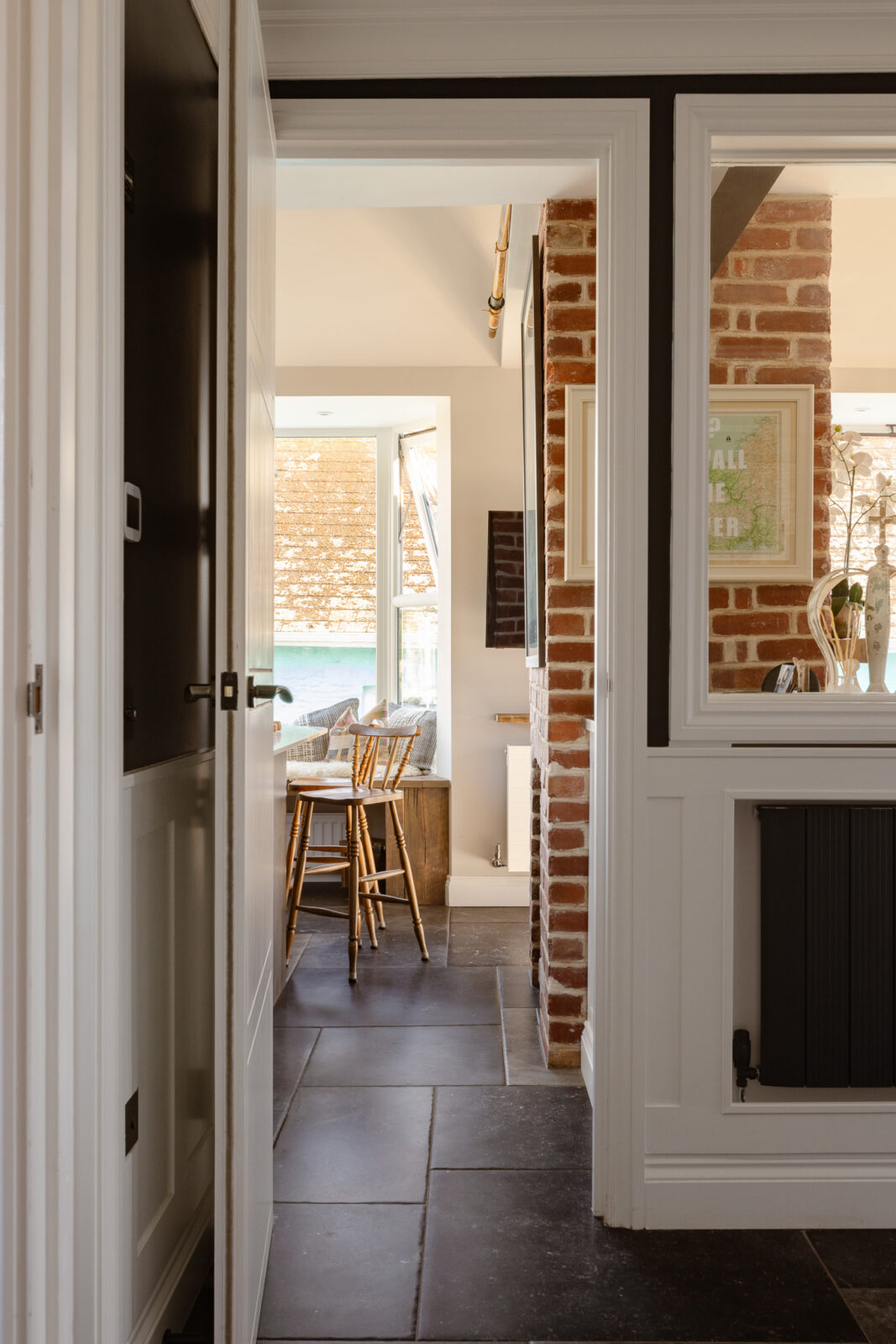 There are two bedrooms on this floor. The first has a super-king size bed (with the option of twins if preferred) and beautiful far-reaching views. The second, nicknamed ‘the cabin’, has two single beds* designed by local craftsmen, that also doubles up as a kids snug room with a TV. Next door is a shared bathroom with a large walk in shower, stone basin and original arched window.