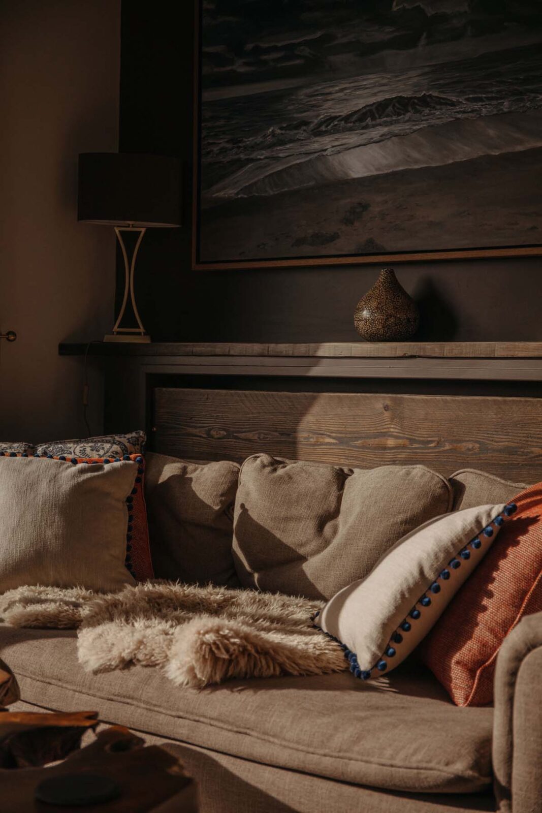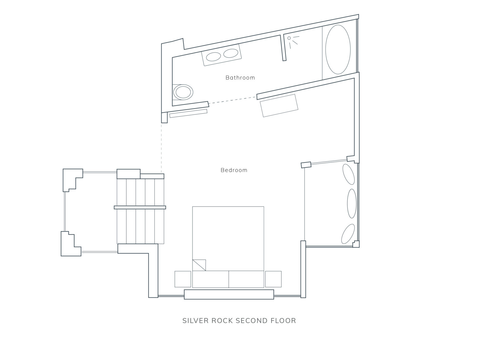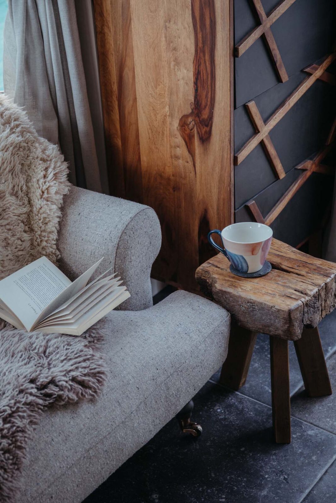 There are two bedrooms on this floor. The first has a super-king size bed (with the option of twins if preferred) and beautiful far-reaching views. The second, nicknamed ‘the cabin’, has two single beds* designed by local craftsmen, that also doubles up as a kids snug room with a TV. Next door is a shared bathroom with a large walk in shower, stone basin and original arched window.