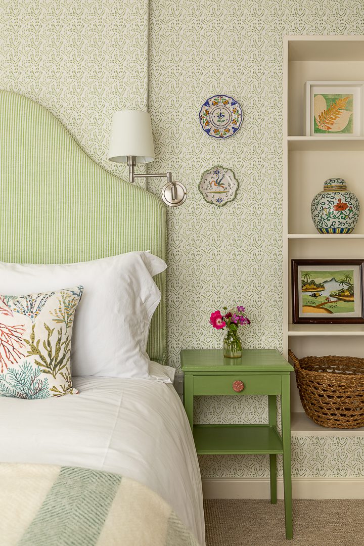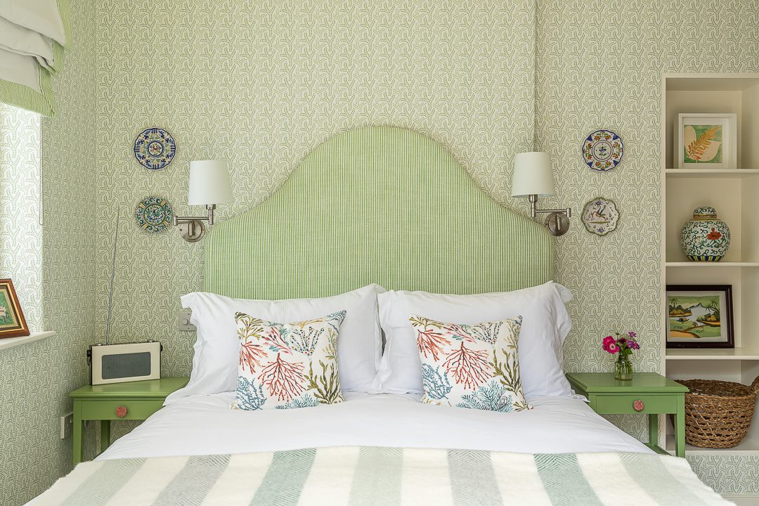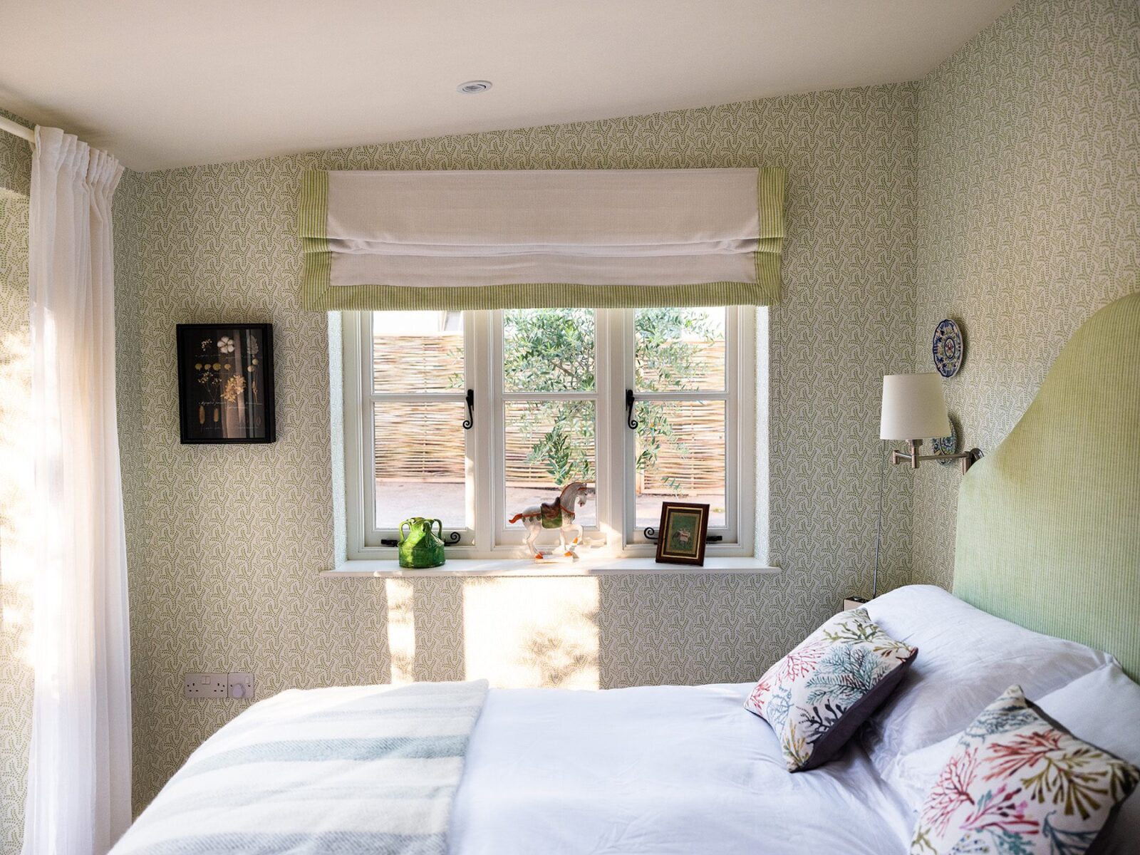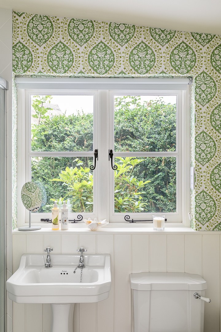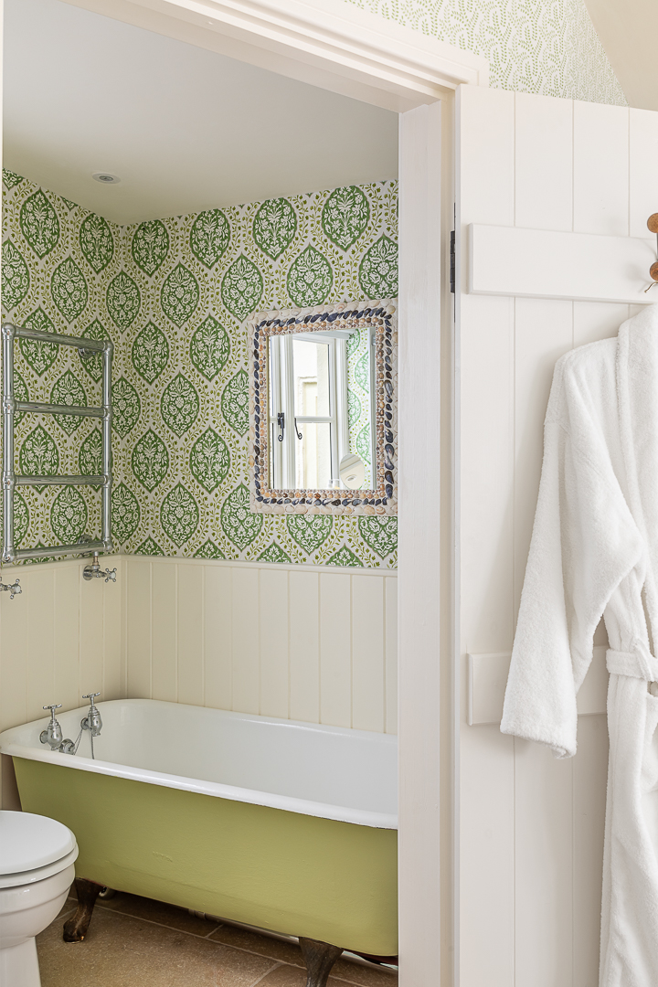 The bedroom is a real treat and sings of the British countryside; with its trio of leafy green printed walls, lime green ticking stripe headboard and matte forest green side tables. The king-size bed is dressed with fresh white linens and accompanied by chic brass bedside wall lamps and a terracotta orange scalloped-edge dresser opposite. Draw back the draped white linen curtains and you’ll find a set of double French doors overlooking the garden. Next door, the paisley print en-suite bathroom with its roll-top bath tub and separate shower, filled with glorious details from natural botanical Bramley products to the sea shell lined window.