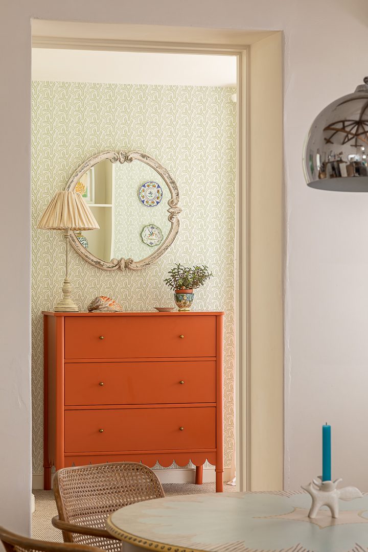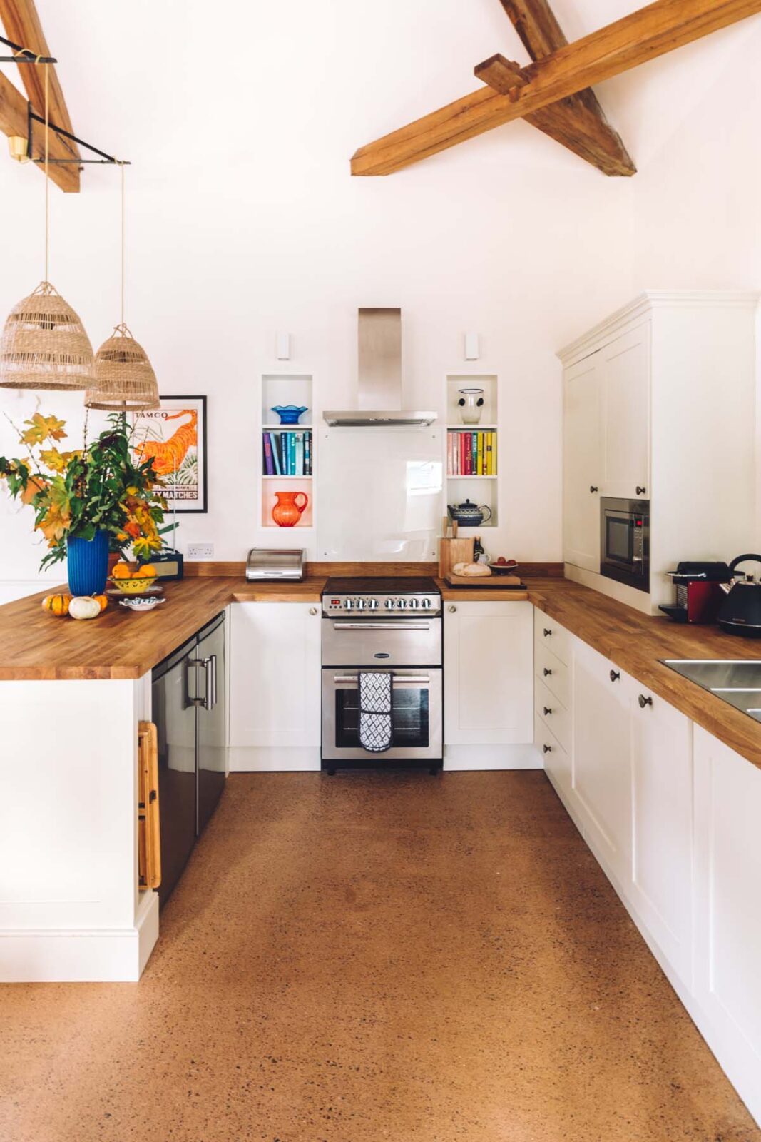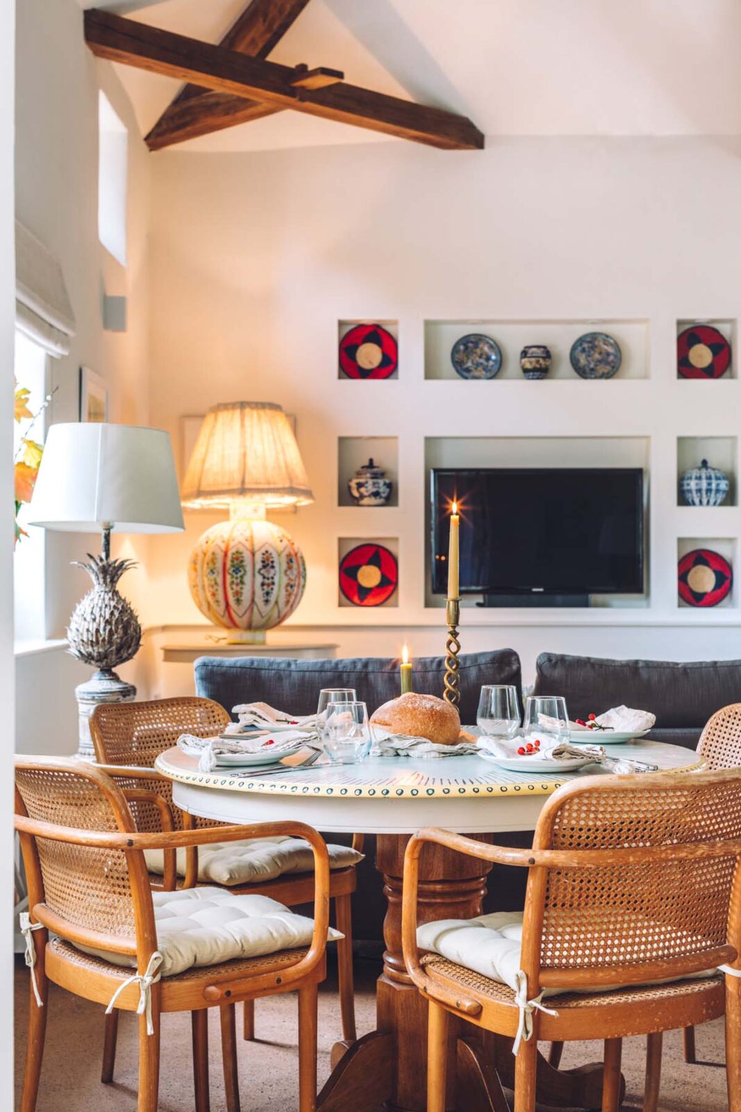 The open-plan space is well thought out, with each area displaying its own little pocket of charm. Interiors are chic, stylish and carefully sourced. Think jute rugs, rattan backed chairs and weaved bamboo pendant lights, meet bobbin tables, vintage finds and art deco statement pieces. The walls are dotted with little alcove windows and filled with a fun and colourful curation of prints, original artwork and hand-painted crockery.