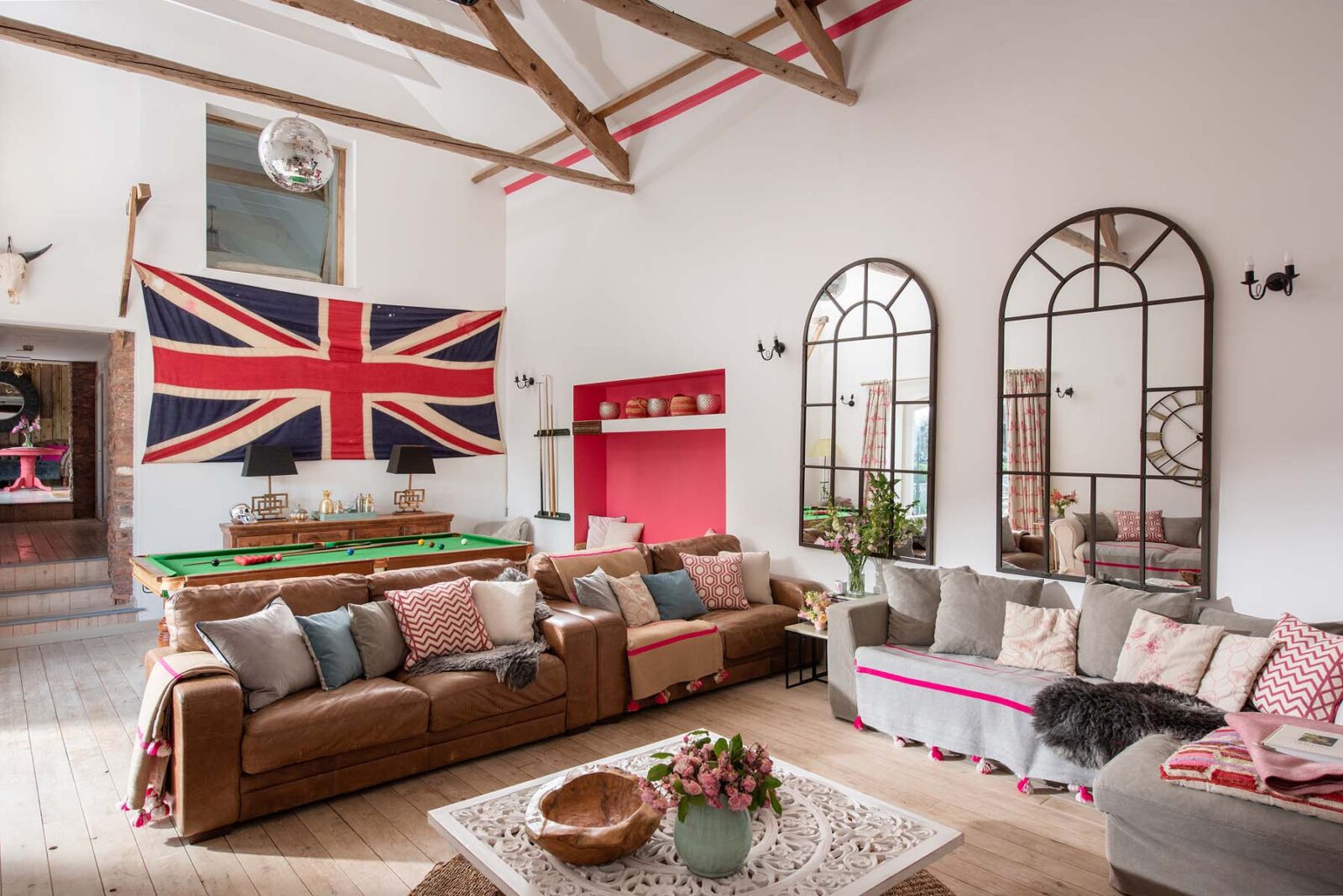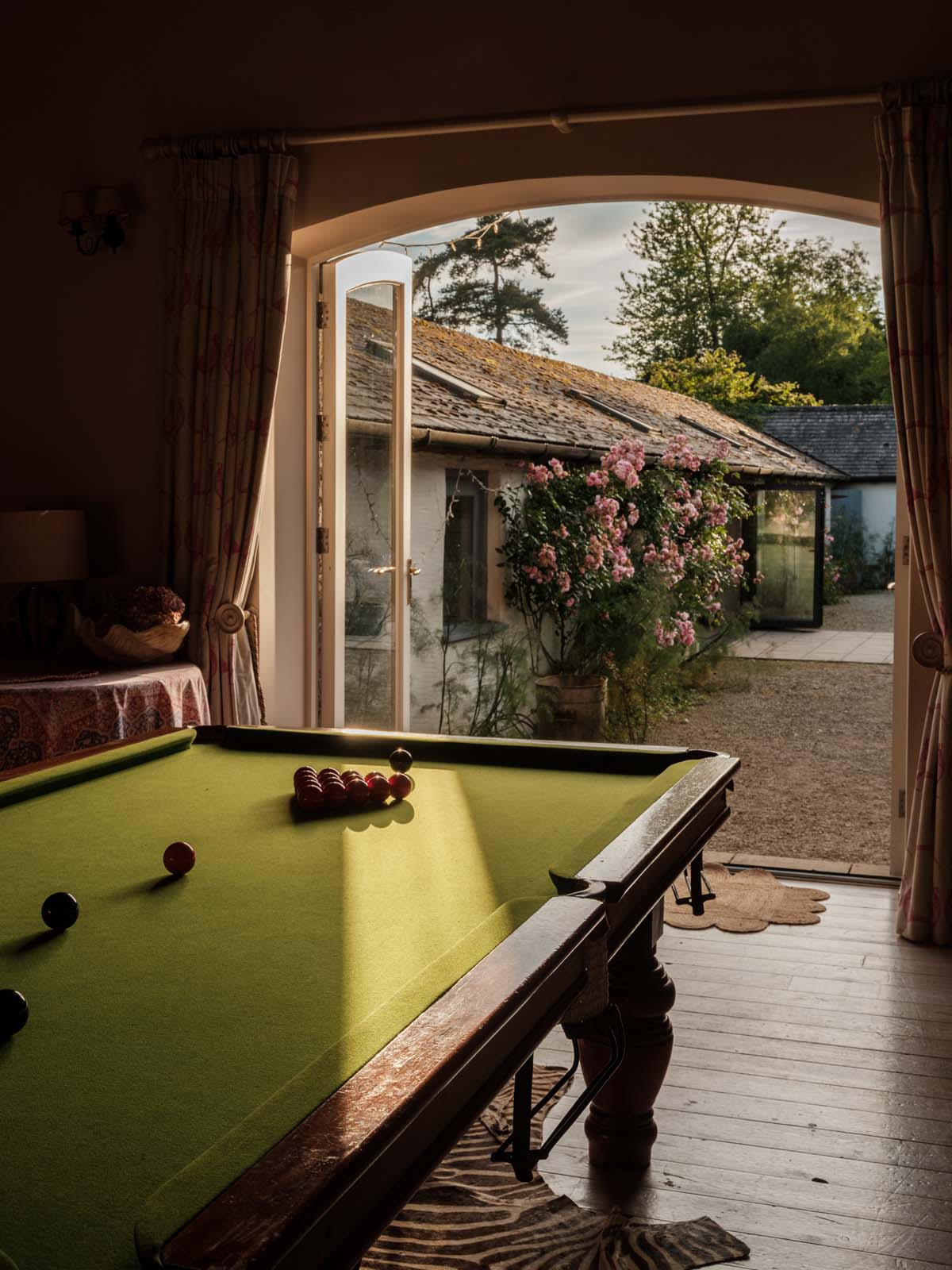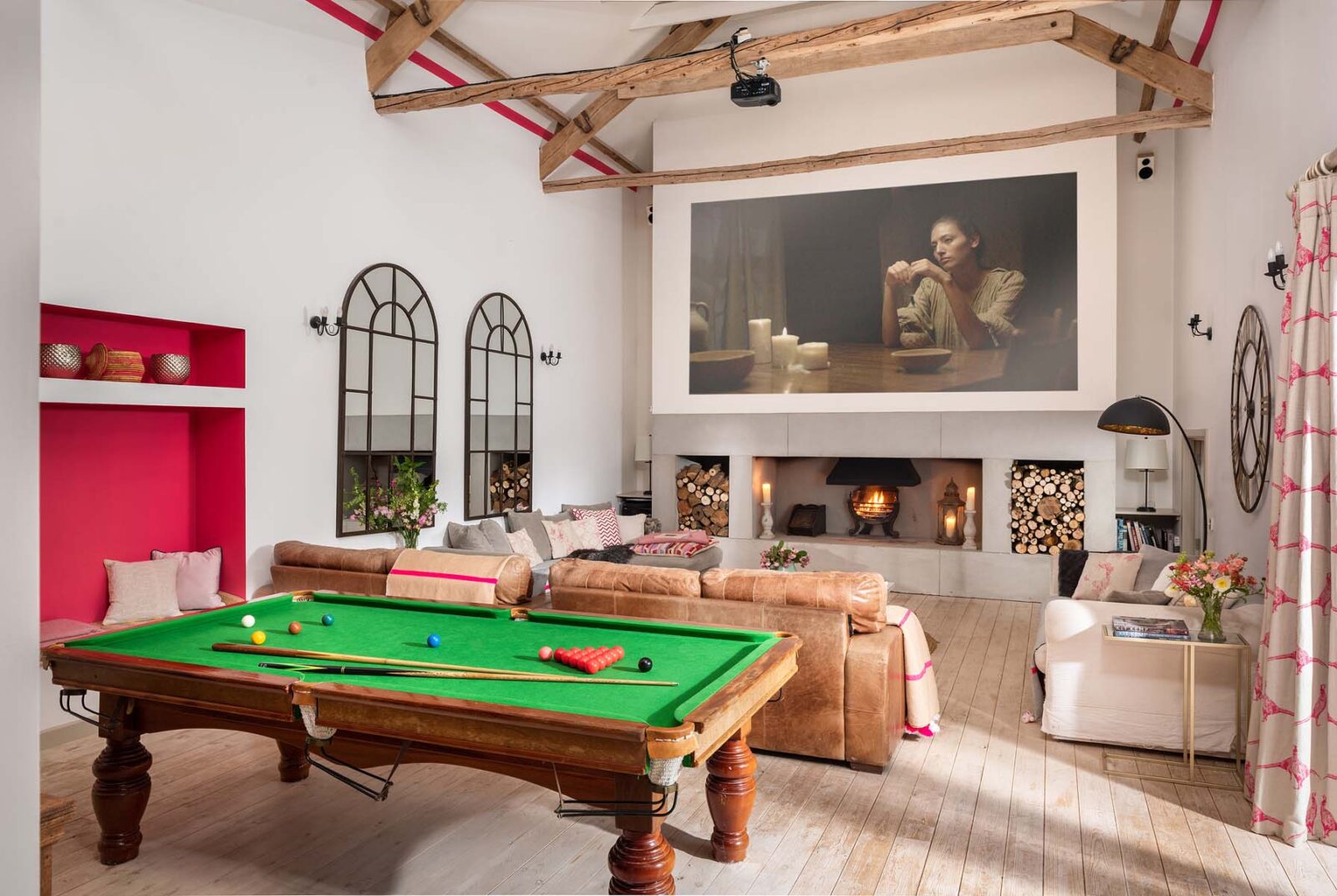 The magazine-worthy cinema and games room with its impressive vaulted ceiling is complete with a snooker table, a giant projector wall for film nights, and an open fire.