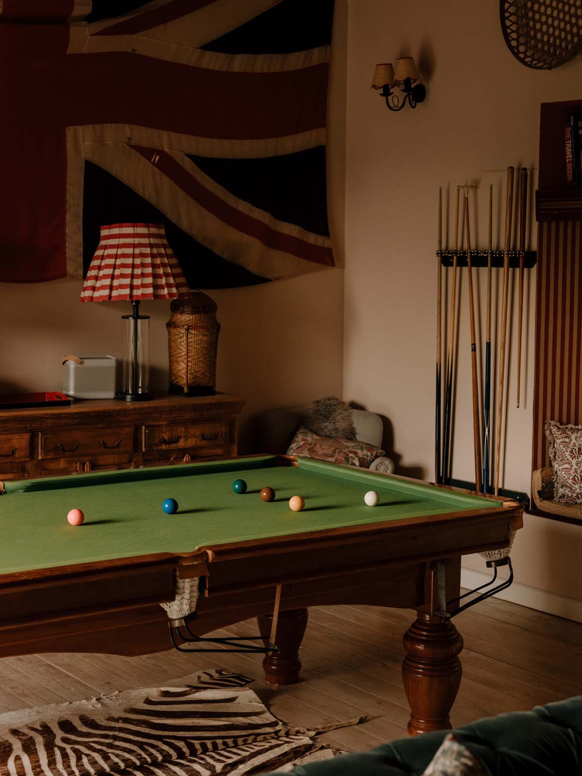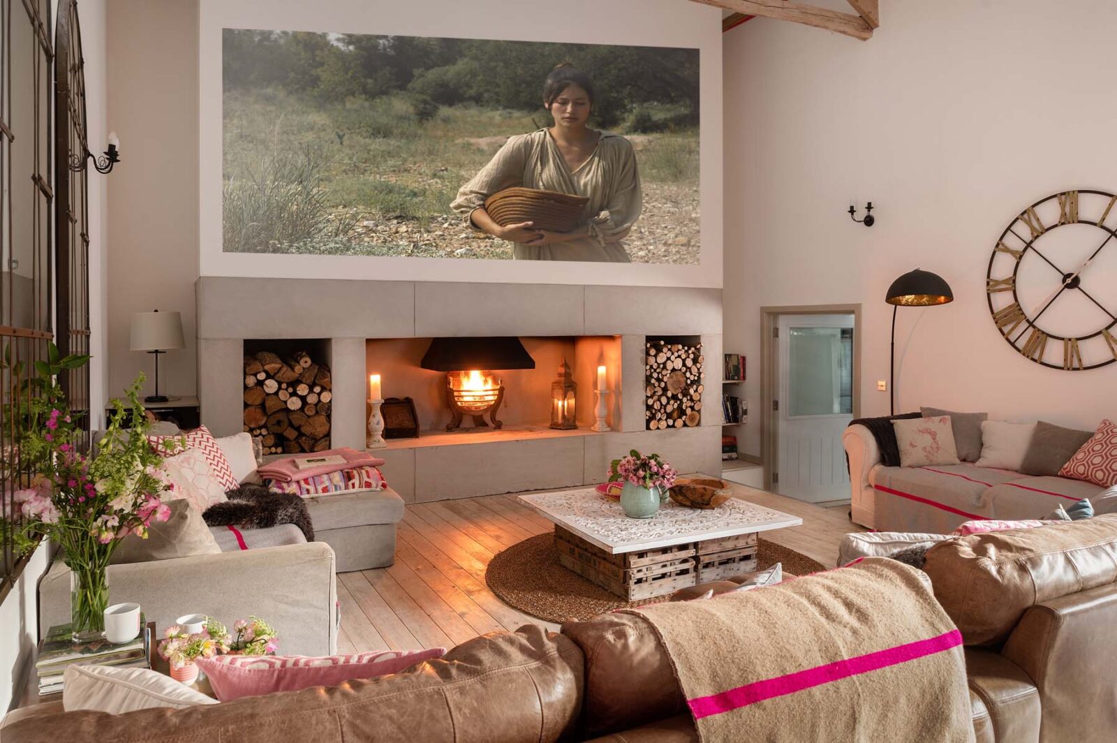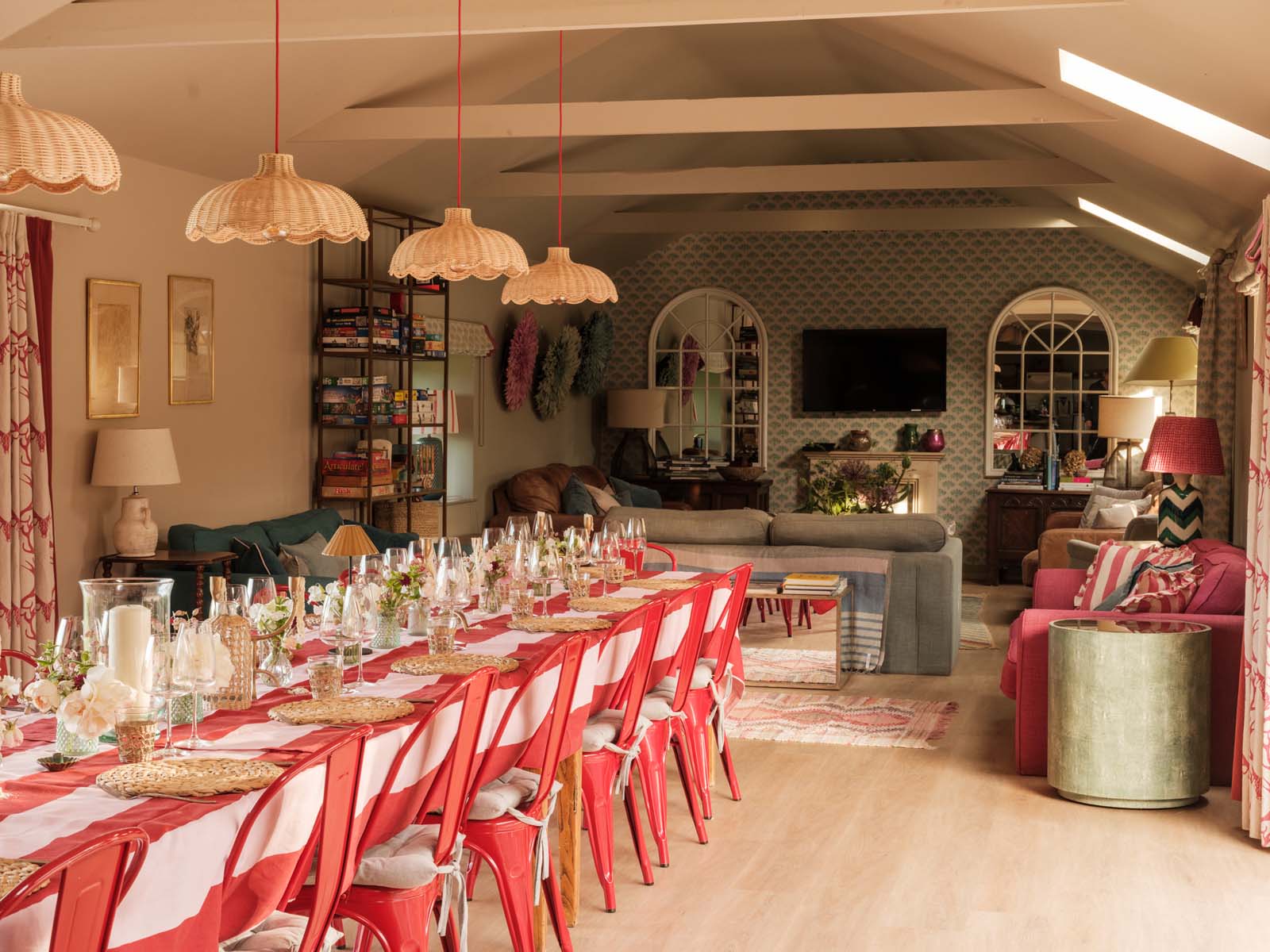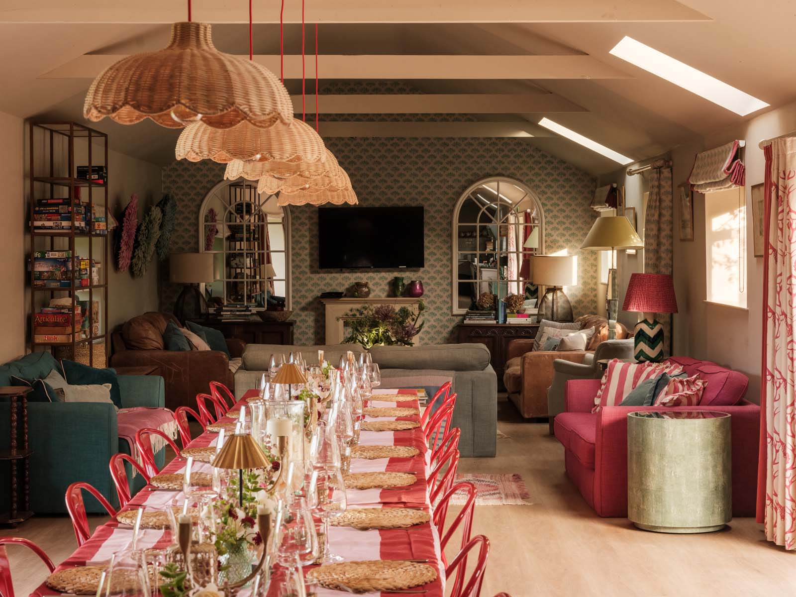 The magazine-worthy cinema and games room with its impressive vaulted ceiling is complete with a snooker table, a giant projector wall for film nights, and an open fire.