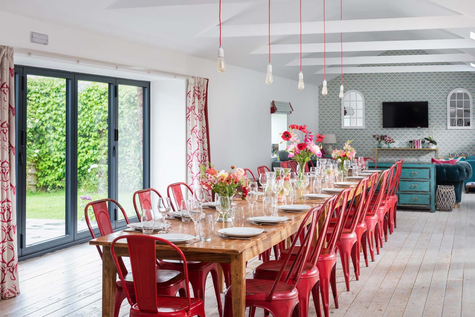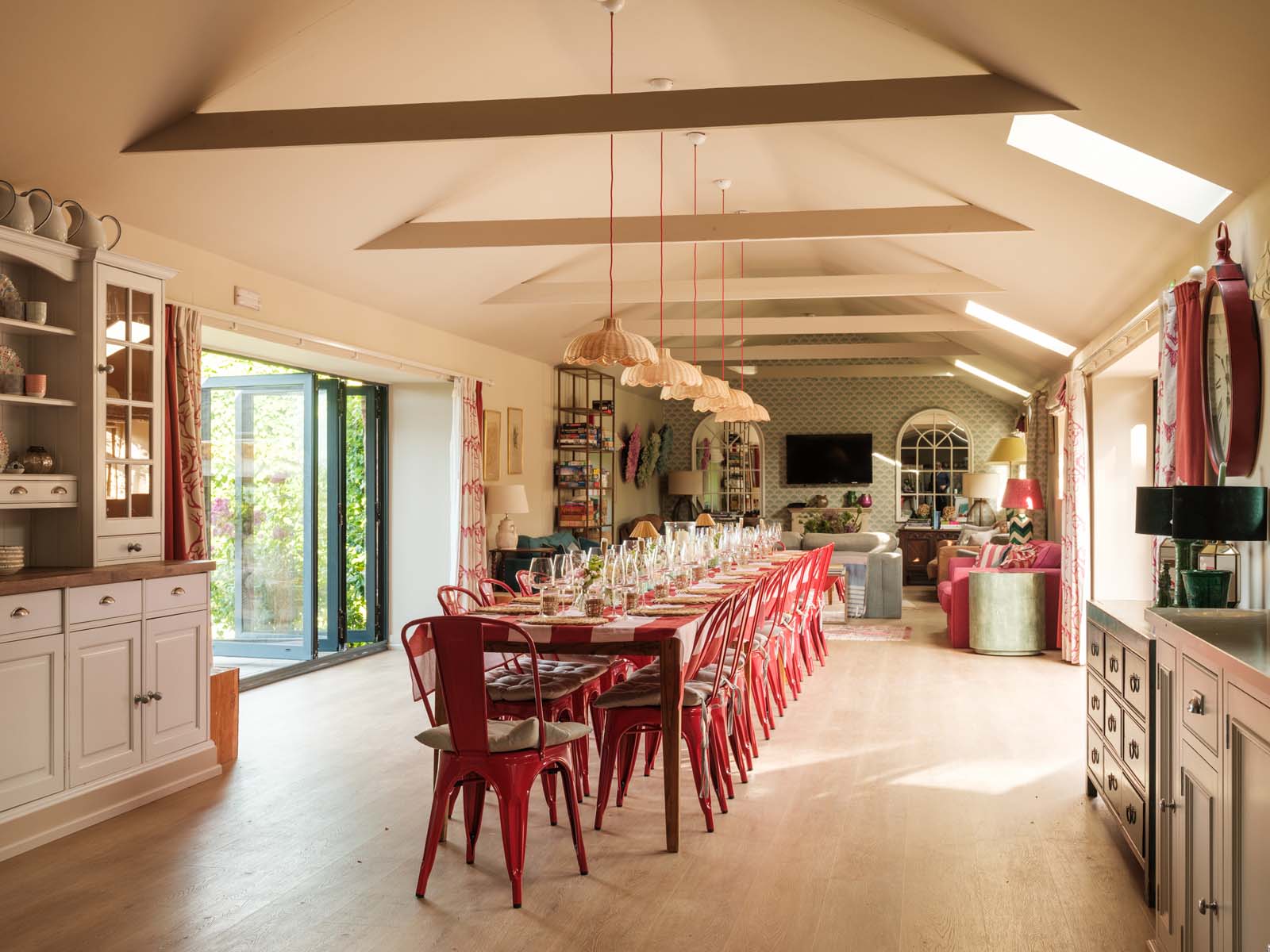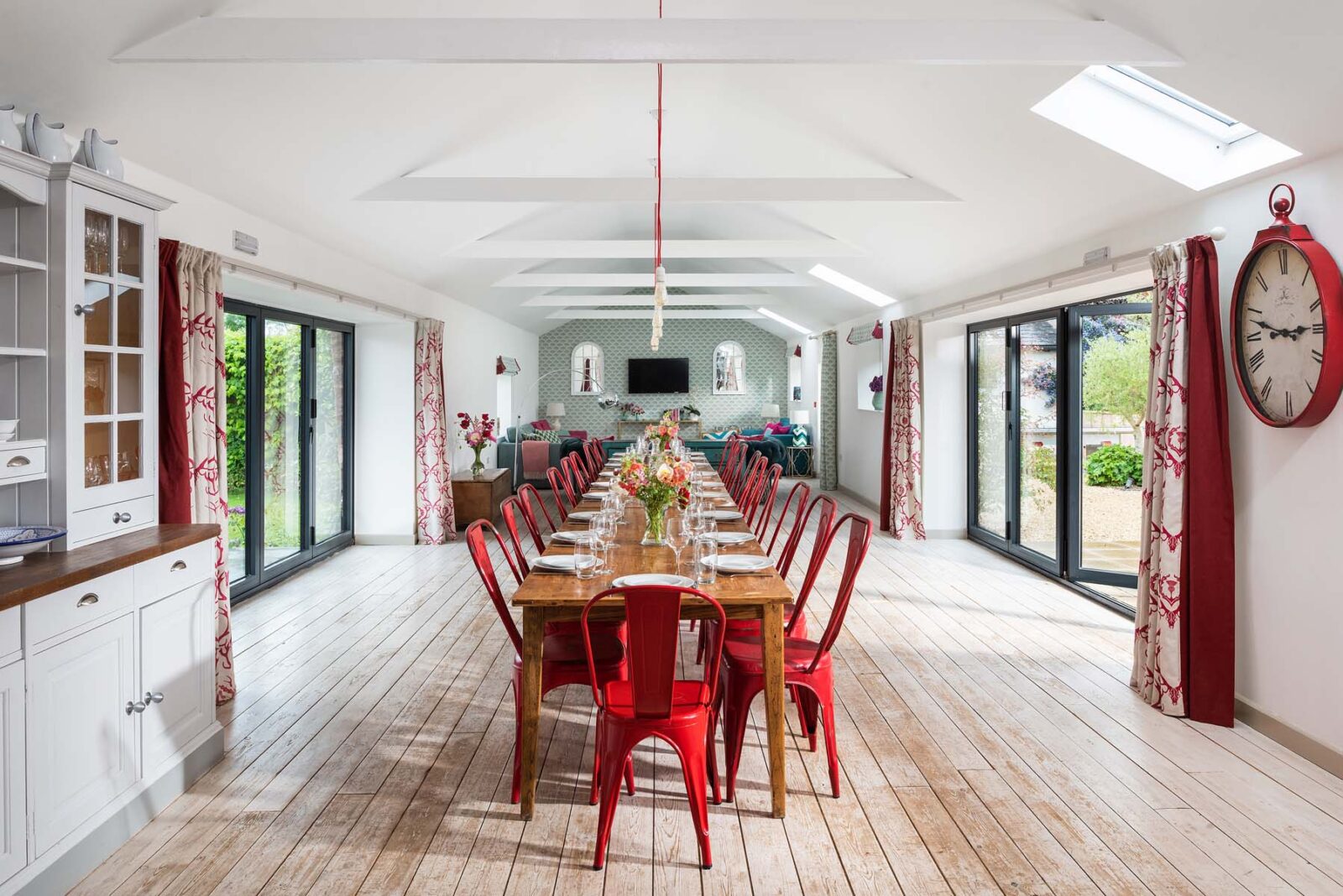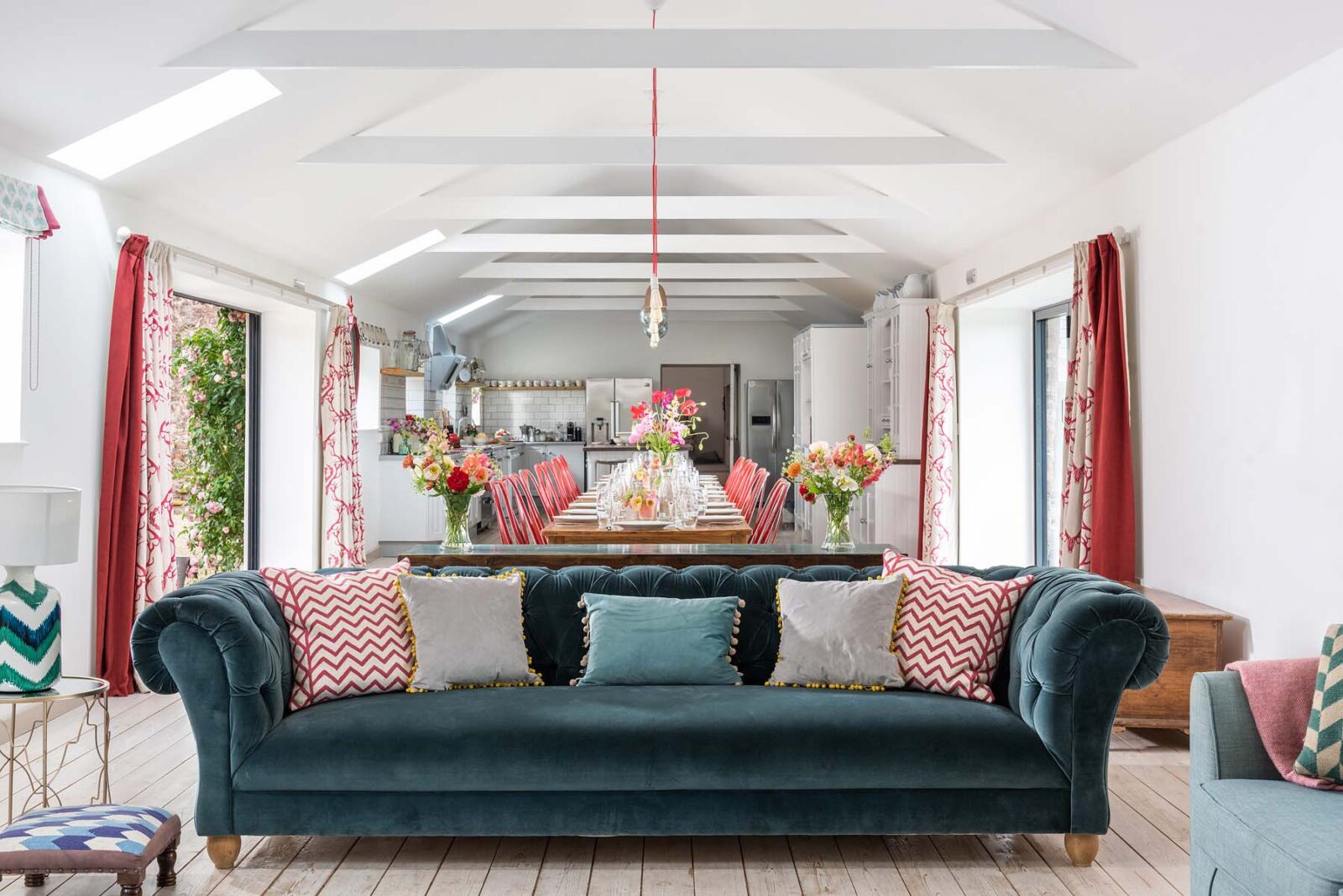 Entertaining spaces don’t come much better than these. The fully-equipped kitchen and spacious dining area has floor to ceiling windows, bi-fold doors and a long dining table overlooking the dreamlike garden and grounds beyond. Expect colourful reclaimed and upcycled furnishings, striking restored features and uninterrupted countryside vistas.