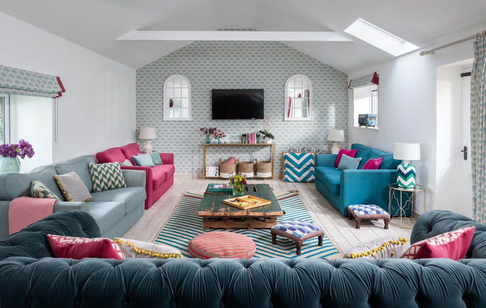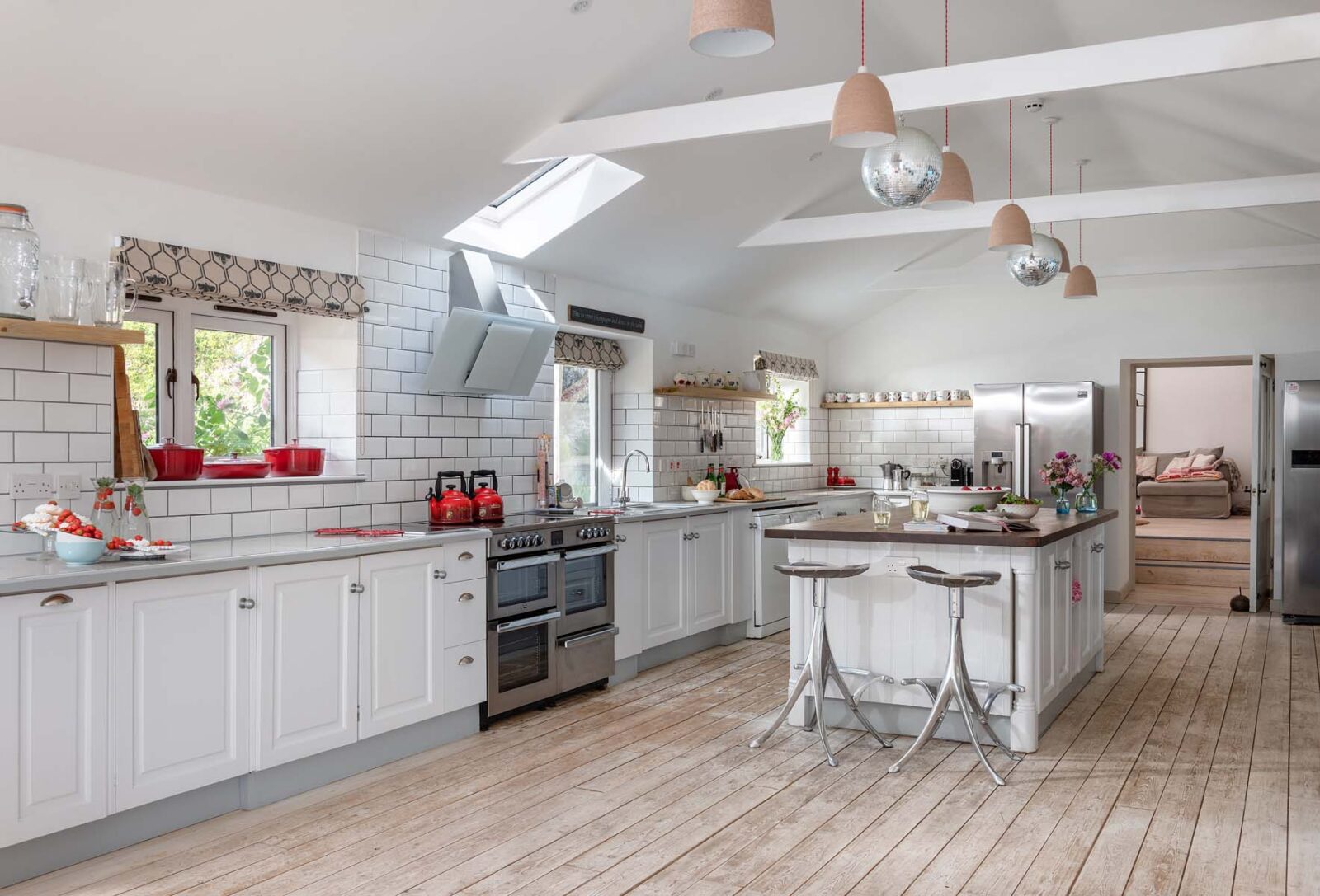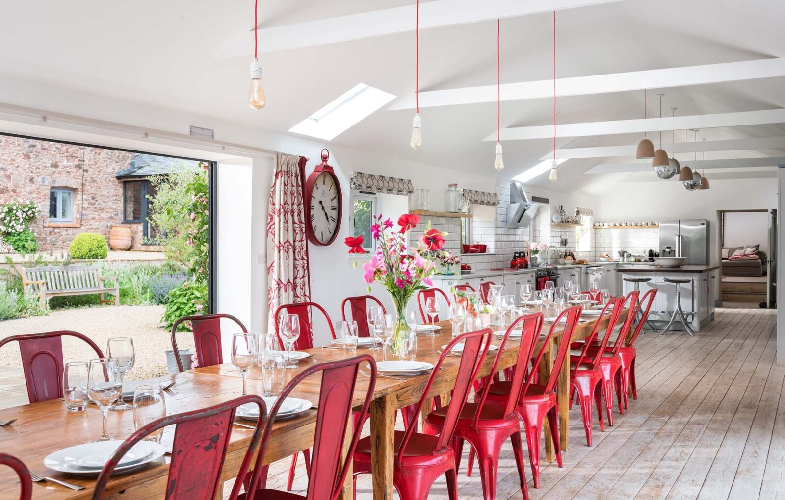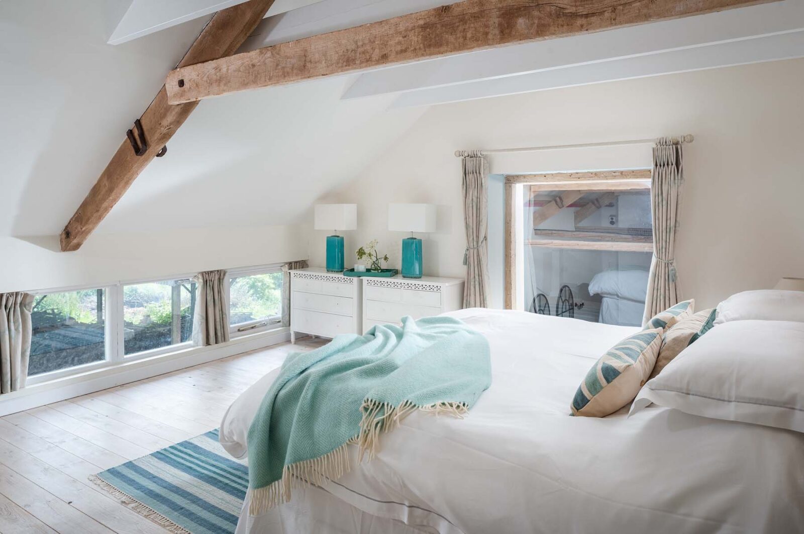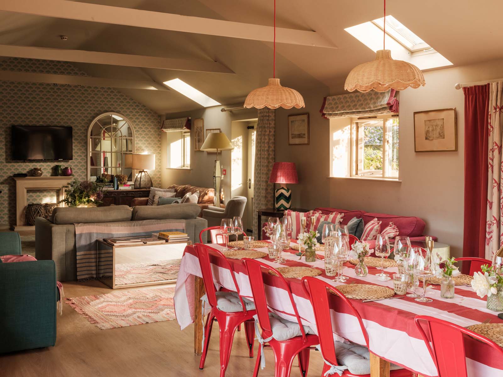 Entertaining spaces don’t come much better than these. The fully-equipped kitchen and spacious dining area has floor to ceiling windows, bi-fold doors and a long dining table overlooking the dreamlike garden and grounds beyond. Expect colourful reclaimed and upcycled furnishings, striking restored features and uninterrupted countryside vistas.