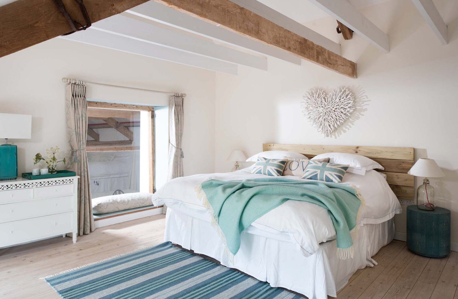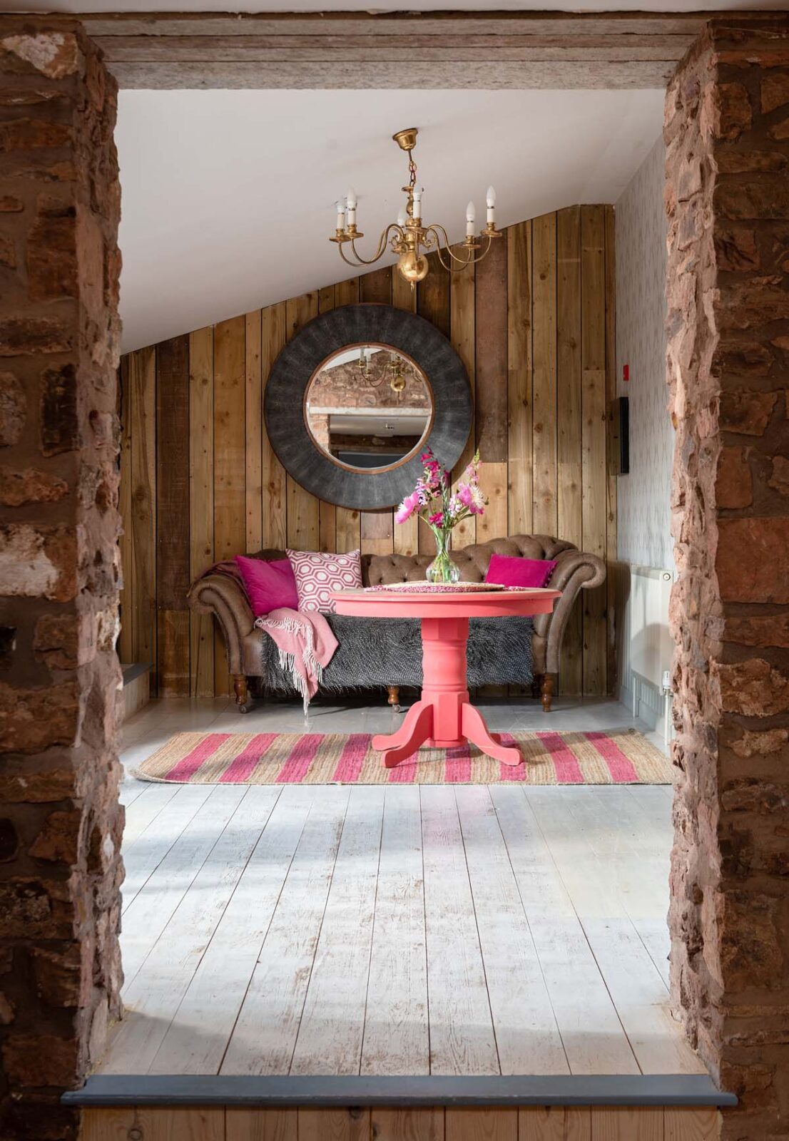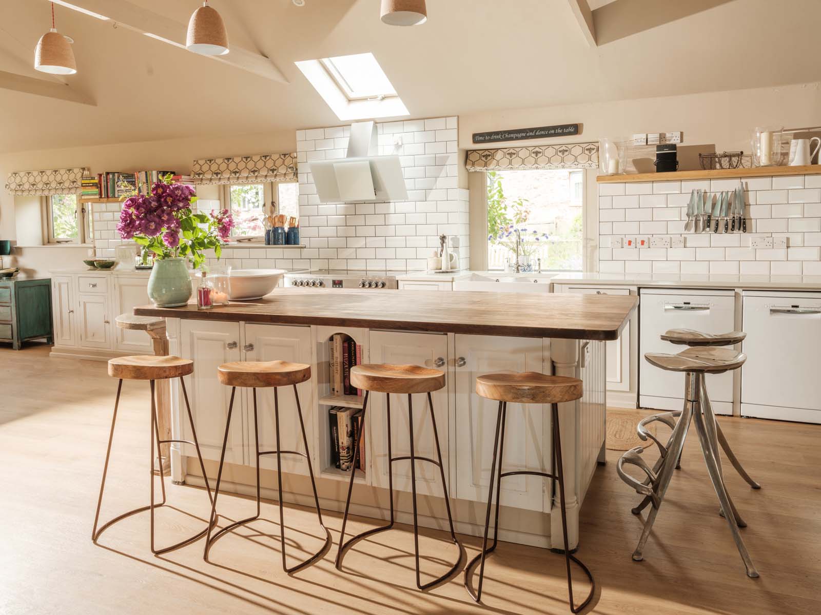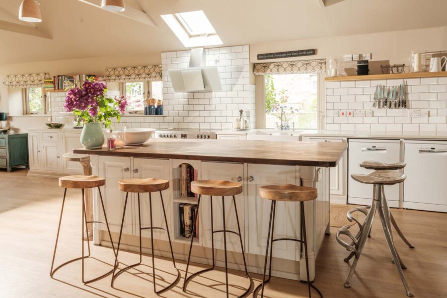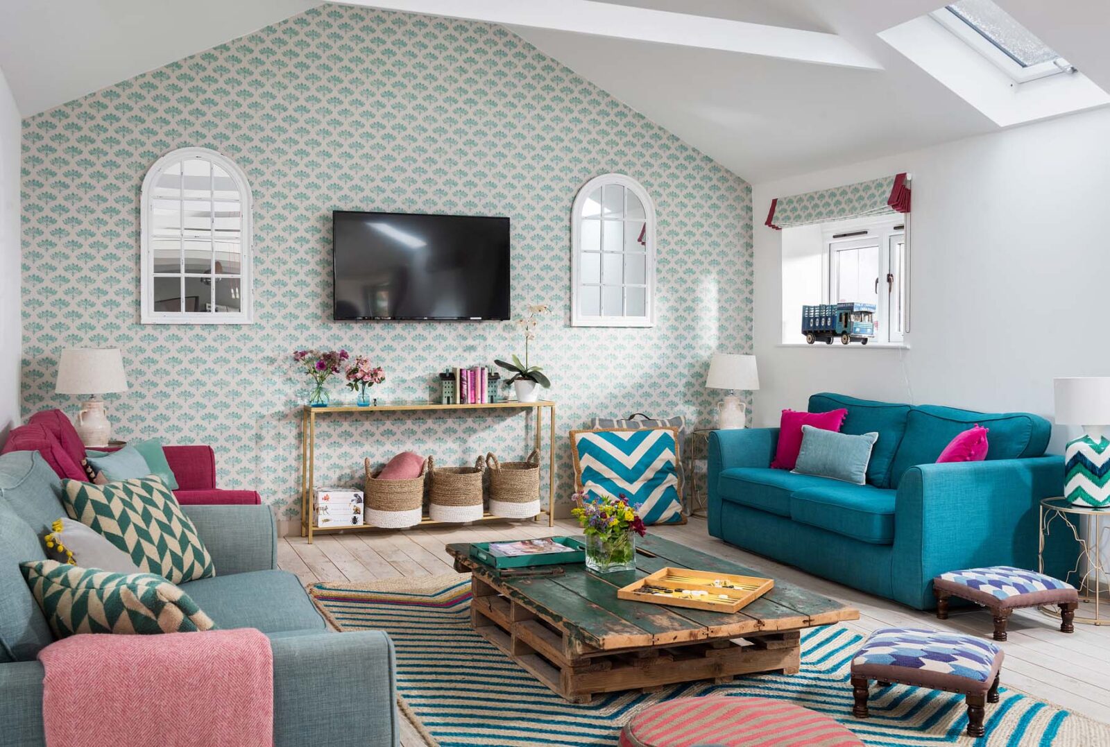 Entertaining spaces don’t come much better than these. The fully-equipped kitchen and spacious dining area has floor to ceiling windows, bi-fold doors and a long dining table overlooking the dreamlike garden and grounds beyond. Expect colourful reclaimed and upcycled furnishings, striking restored features and uninterrupted countryside vistas.