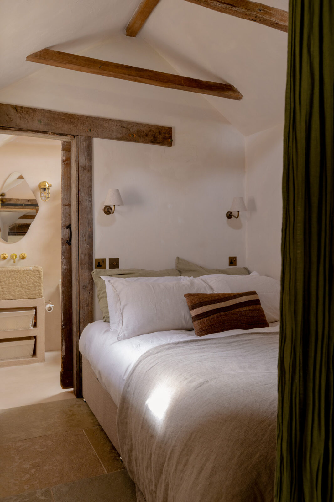 A curtain separates you from the King-sized bedroom, with a sliding door leading you to the shower room beyond.