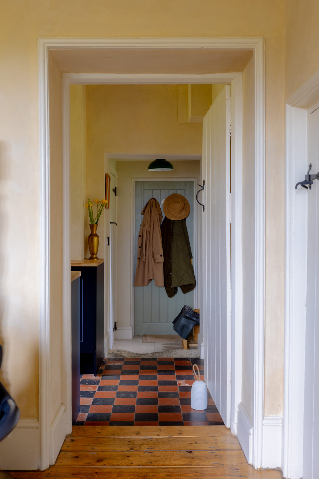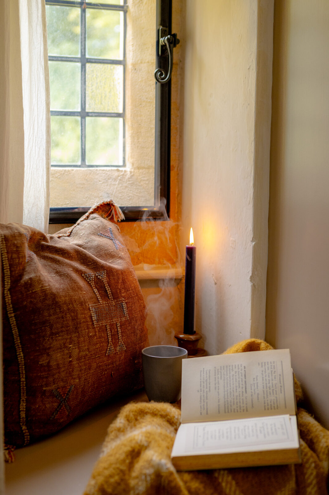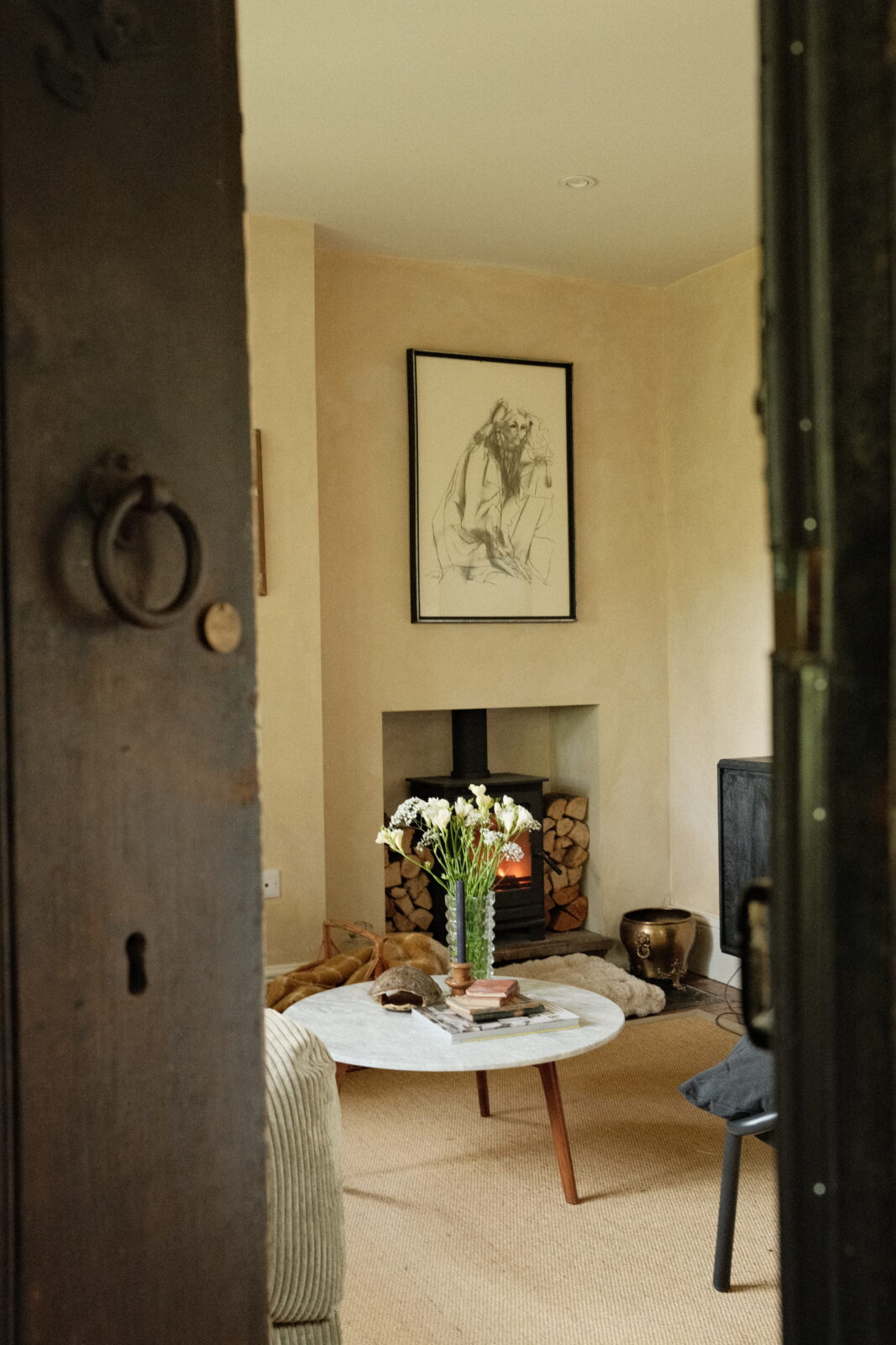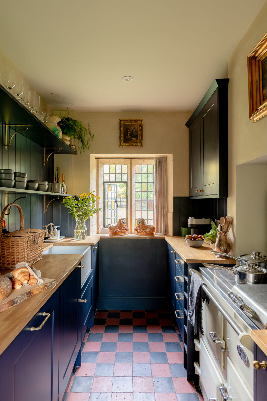The beautiful galley kitchen is decorated in a rich shade of royal blue, and is a lovely place to whip up culinary delights while overlooking the picture-perfect garden. The living room is cosy and chic, with tasteful furnishings and a wood burner.