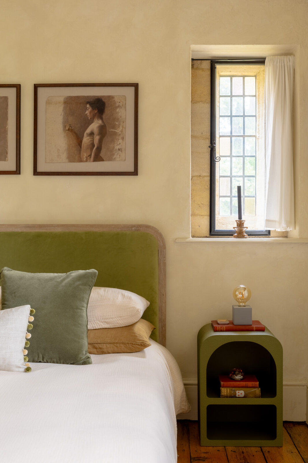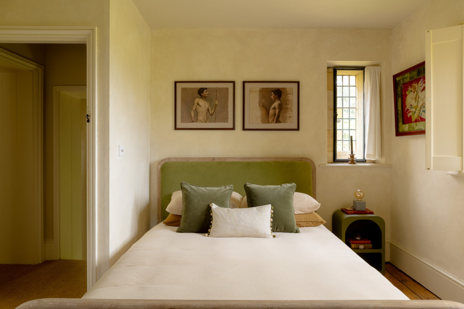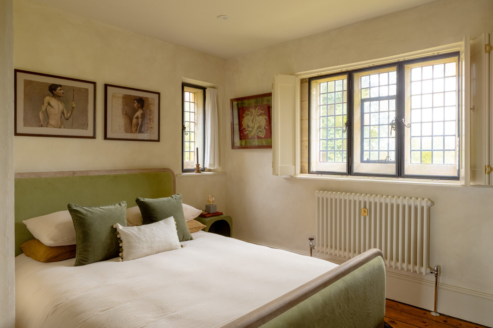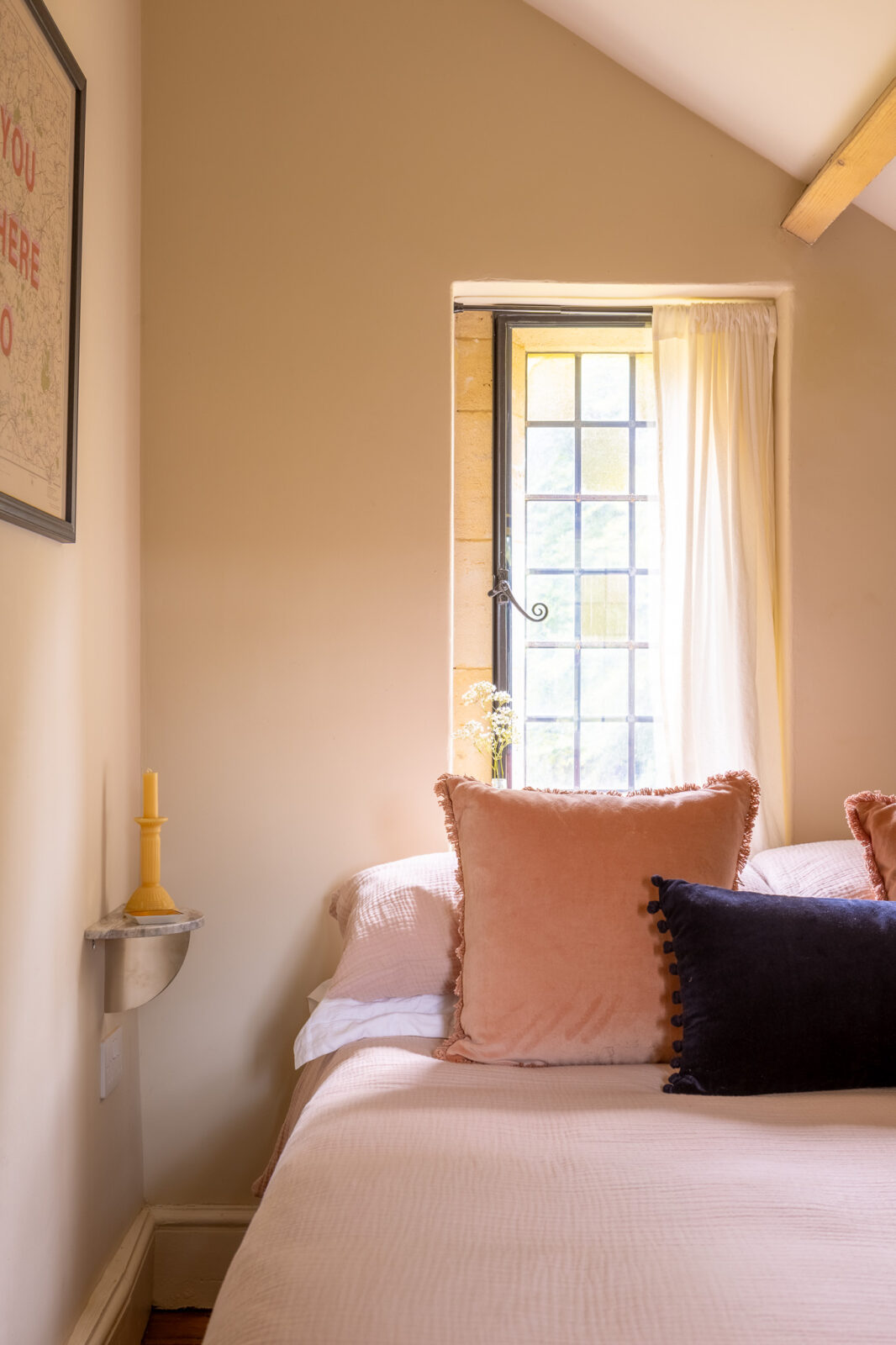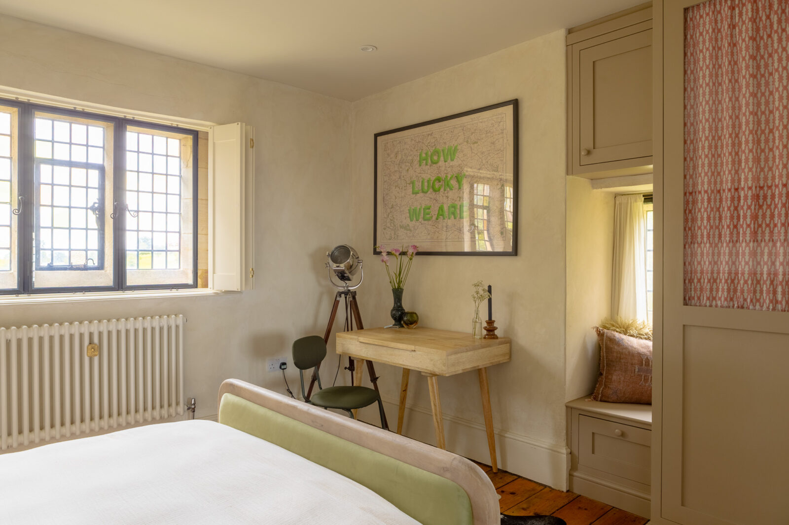 There are two bedrooms at The Lodge, each one decorated in soothing green or pink. The main, King-size bedroom overlooks the neighbouring paddock and the horses that graze in it, and has a small window seat where you can curl up with a good book. The second bedroom has a double bed and faces the local church. They share a brand-new ground-floor shower room with its own pretty pastel palette.