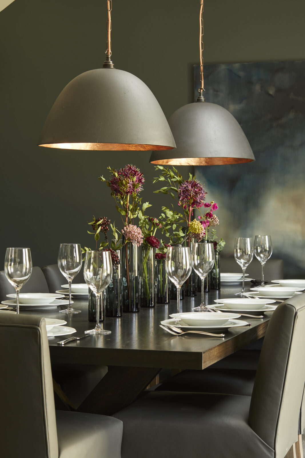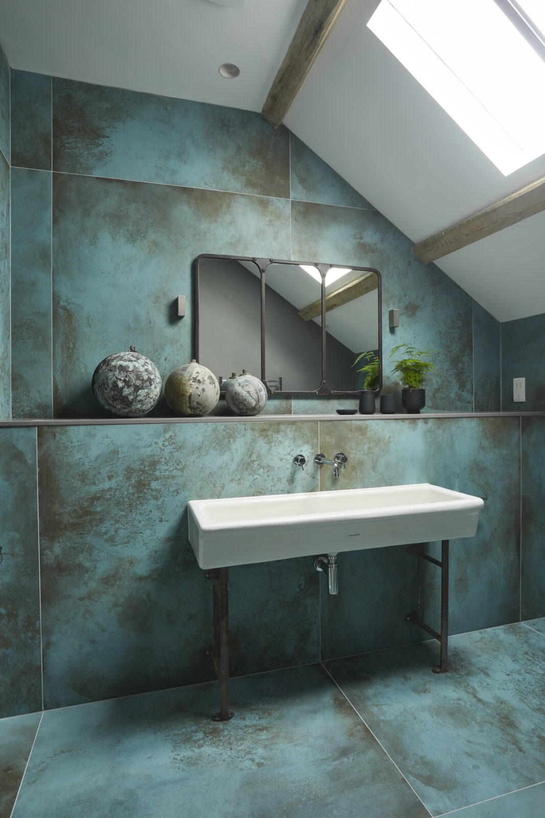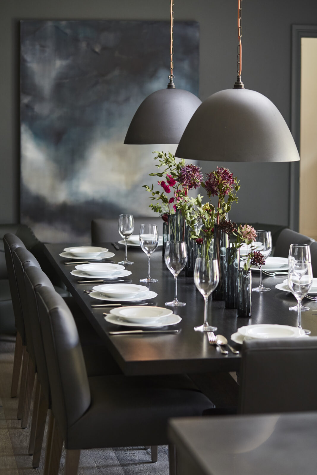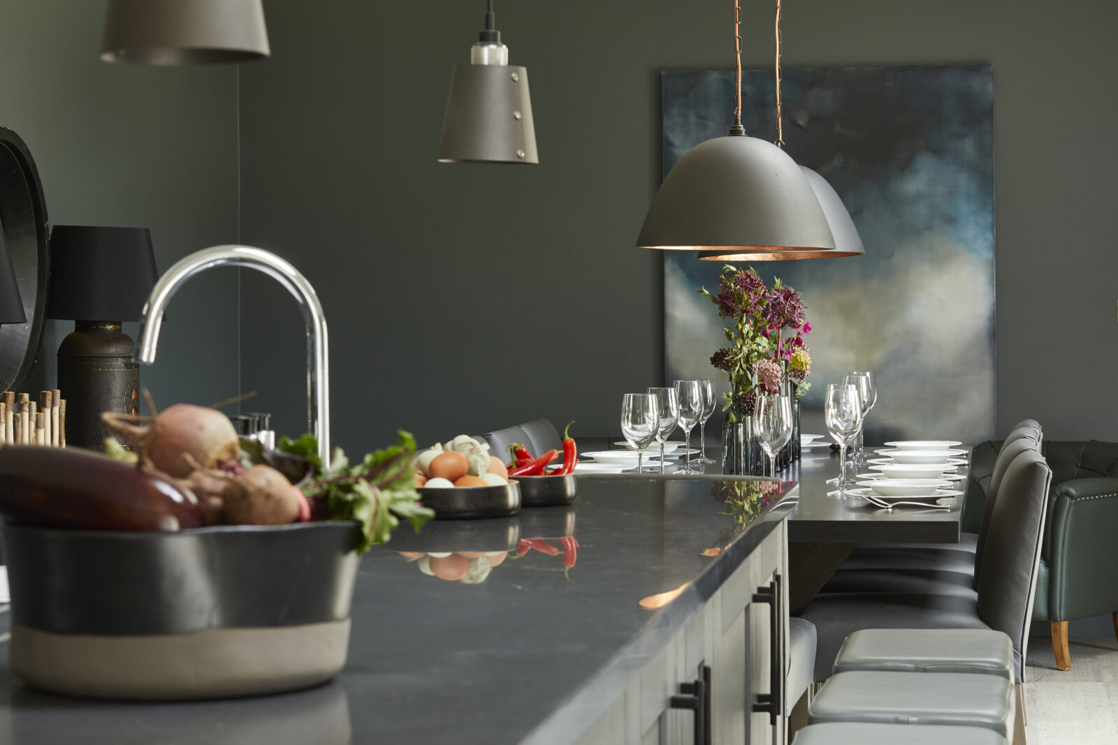 The wonderfully dramatic dining area makes for the ideal spot to host a dinner party alongside the large kitchen island which sits beneath hanging lights. The Stables is very much an artist’s paradise with walls adorned with artwork and photography that complement the greys and creams of the interior décor.