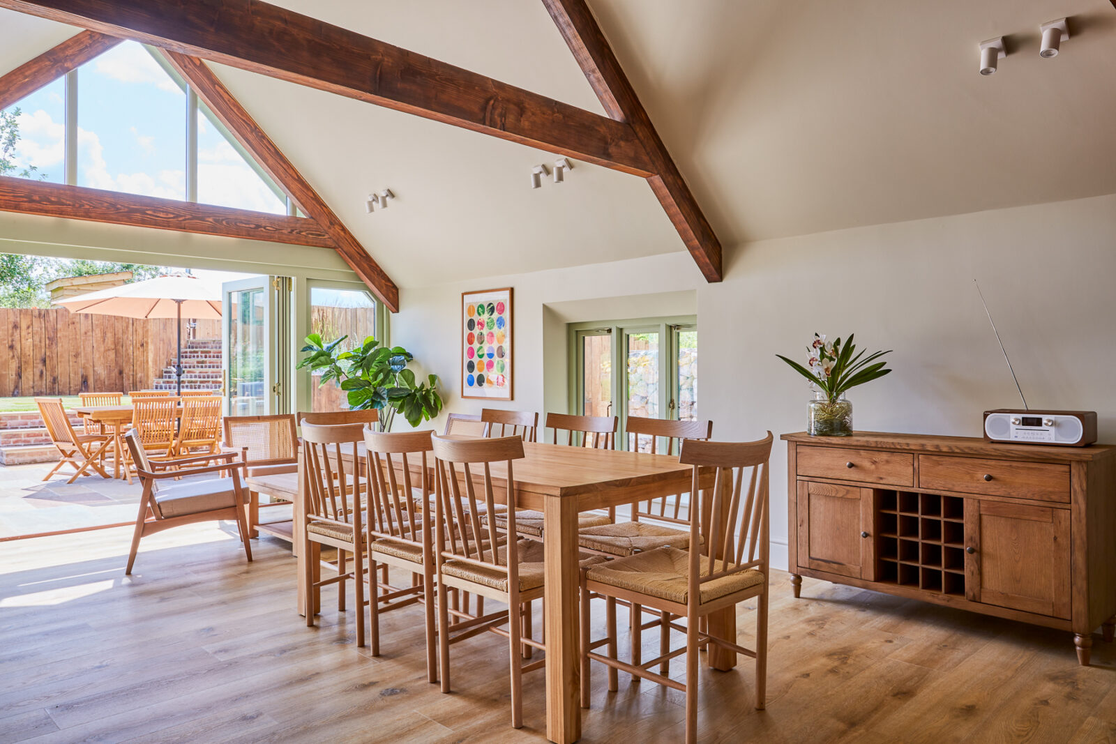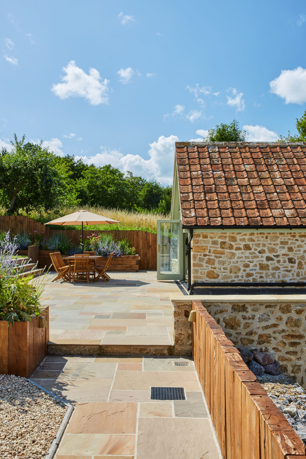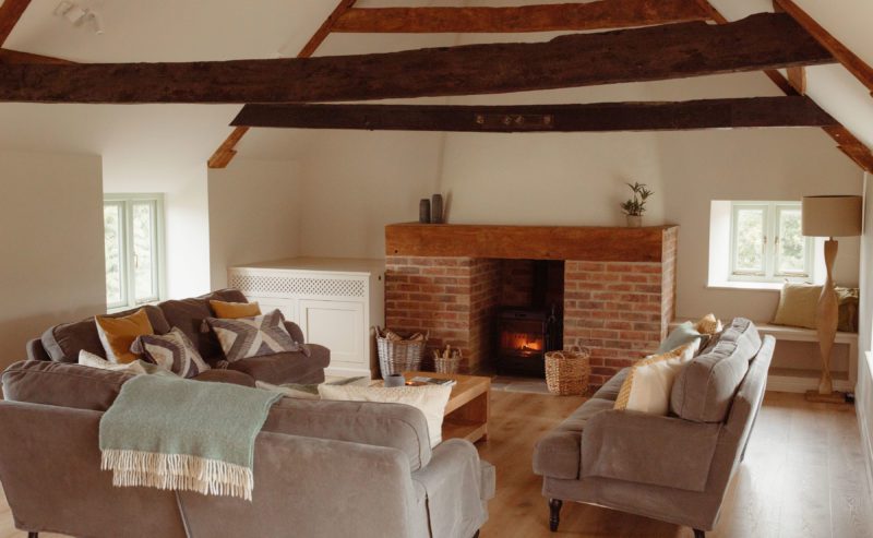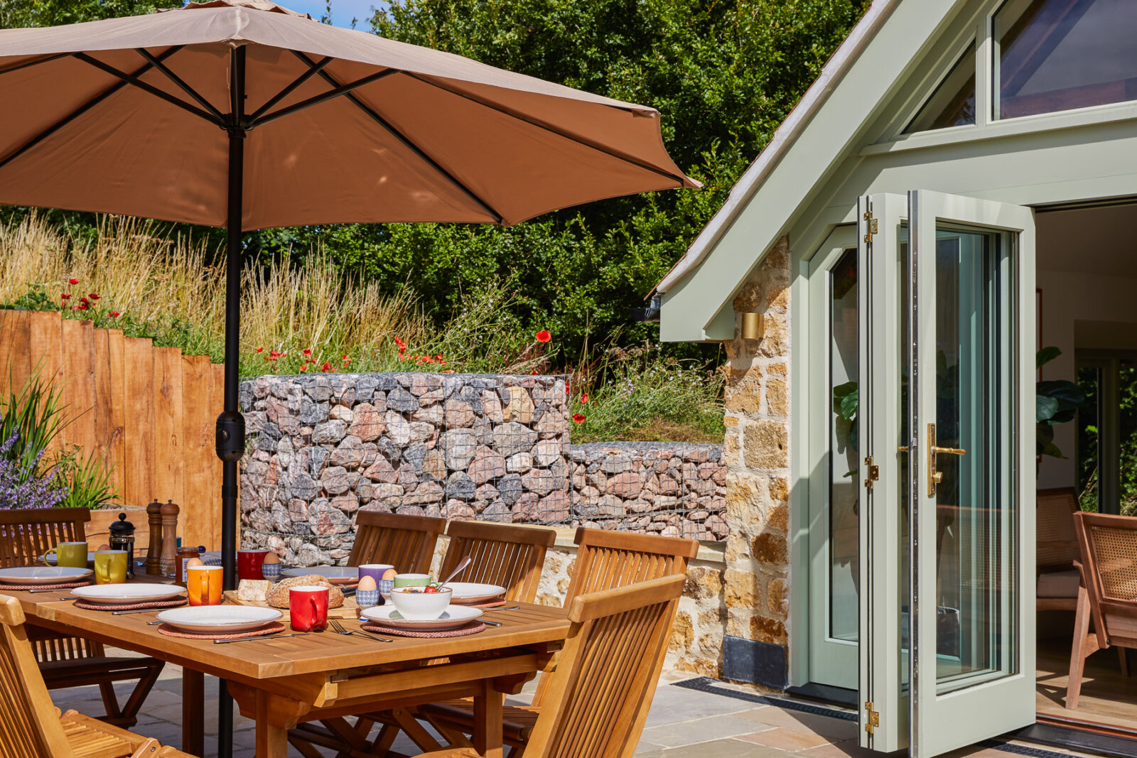 There’s a patio terrace with an outdoor dining set up with a parasol, perfect for balmy days, plus a charcoal BBQ, so you can roll into the night. You’ll also find an outdoor sofa for soaking up those pretty pastoral views with a sunny afternoon tipple.