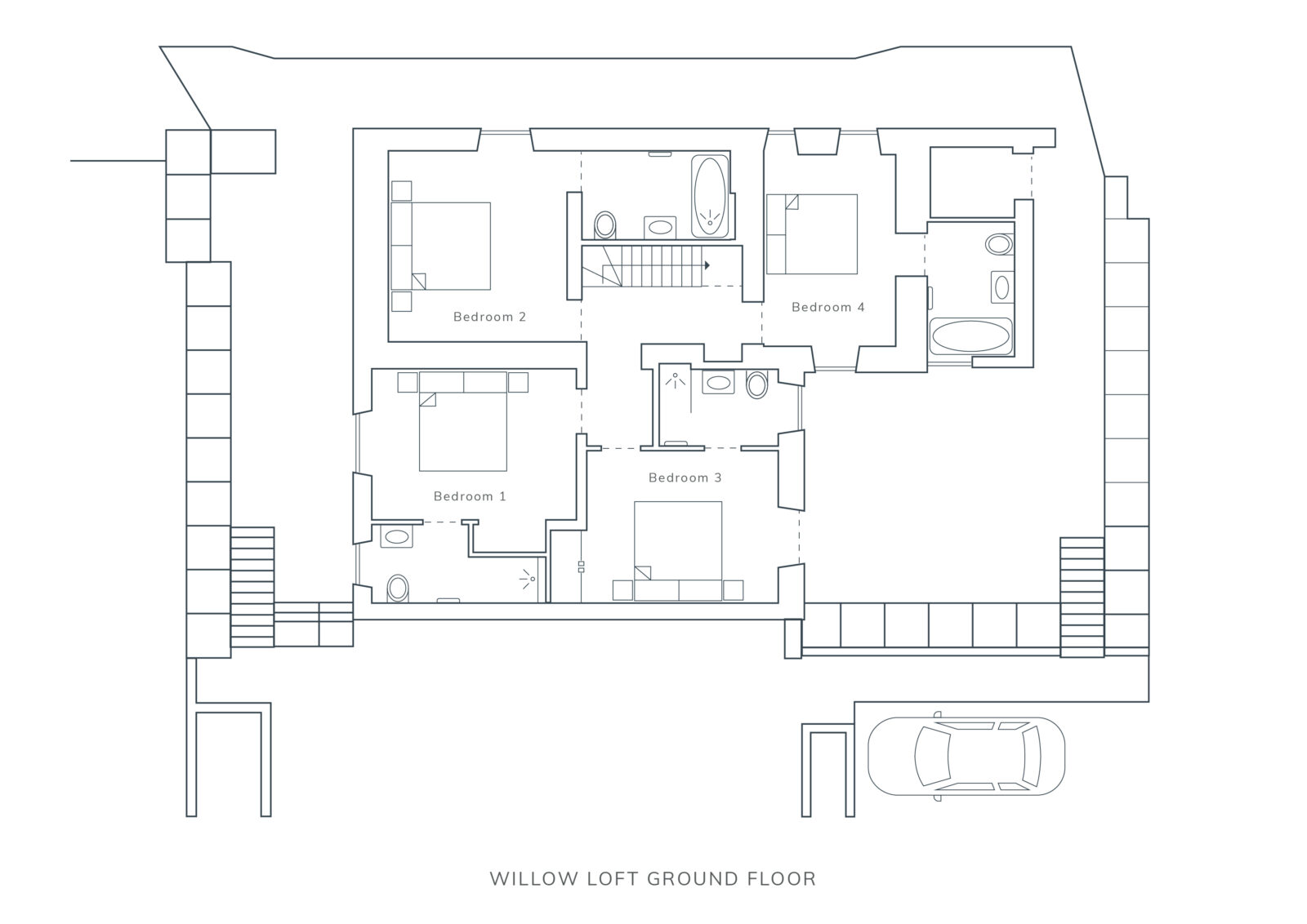 Two of the en-suites have high-spec walk-in showers, one has a bath with a shower above it and the other a freestanding roll-top tub. With fragrant local bath products and fluffy dressing gowns ready and waiting, you’re all set for a peaceful night’s sleep at Willow Loft.